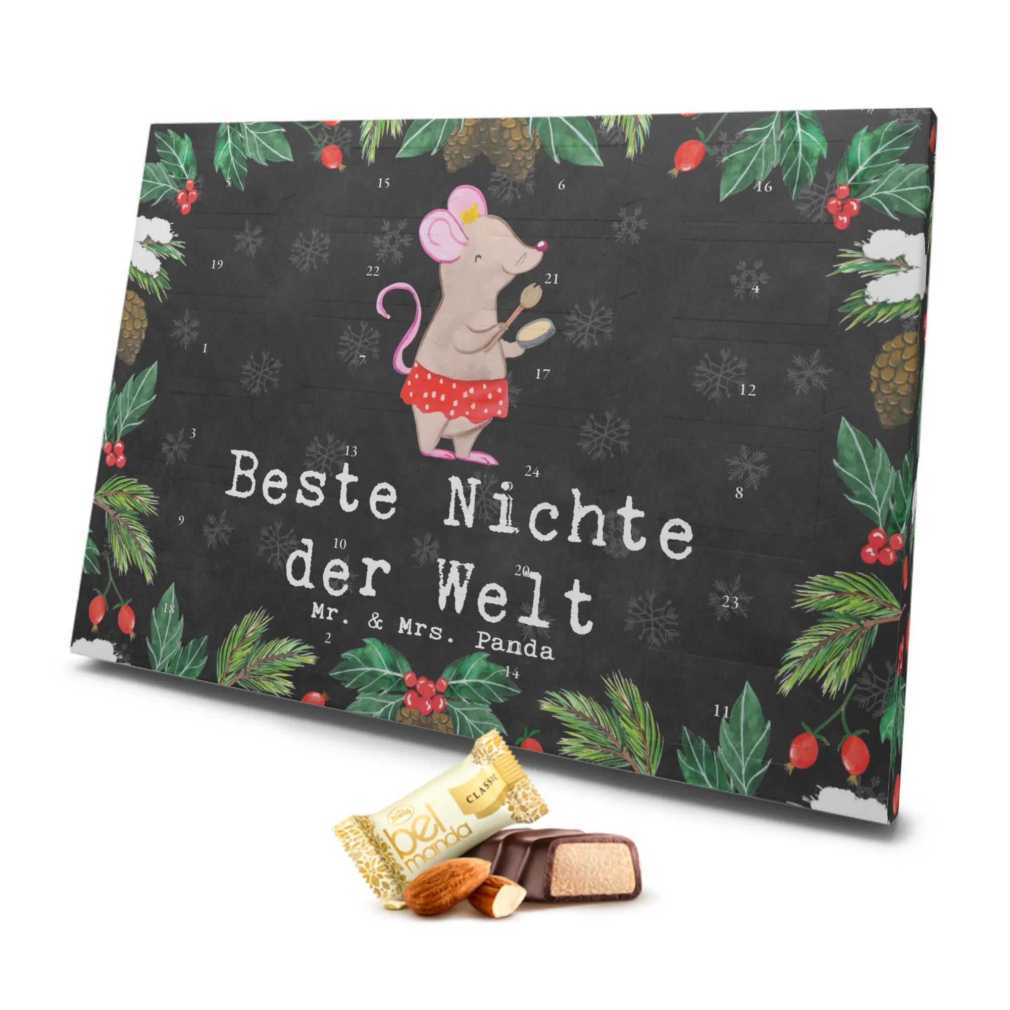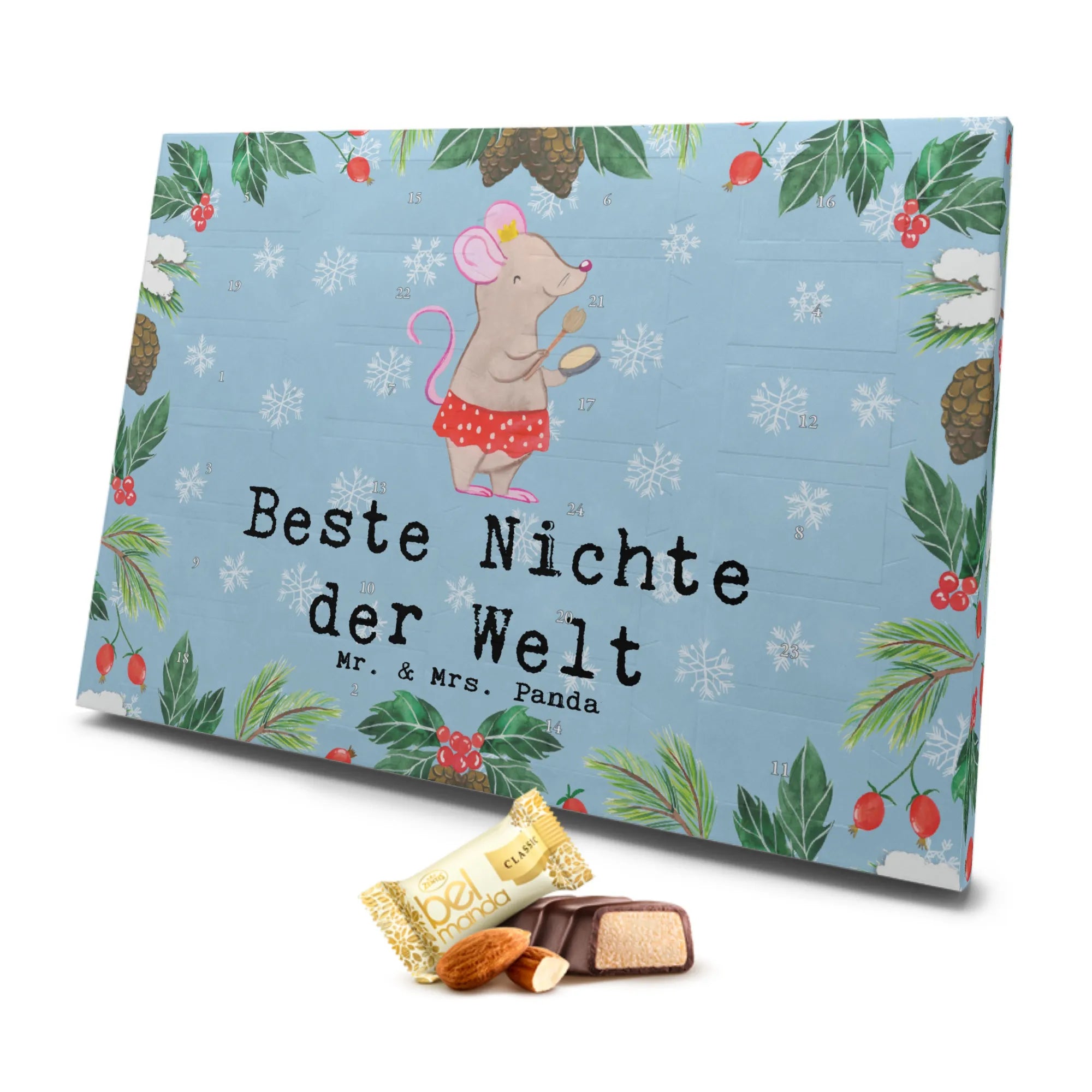 Der wunderschöne Marzipan Adventskalender "Maus Beste Nichte der Welt" von Mr. & Mrs. Panda ist genau das richtige Geschenk für deine liebste Nichte! Mit einer süßen Maus, die in einem Kleid erscheint, zieht dieser Adventskalender alle Herzen an und sorgt für vorweihnachtliche Freude. Ideal, um die Vorfreude auf das Fest der Liebe zu steigern, bringt er dir und deiner Nichte 24 köstliche, einzeln verpackte Edelmarzipan Pralinés aus hochwertigem 300 Gramm Karton. Diese Pralinen sind perfekt, um jeden Tag im Dezember zu einem besonderen Erlebnis zu machen.