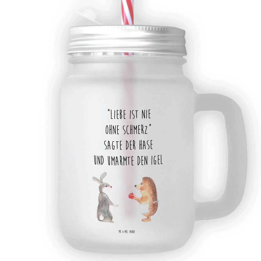 Introducing the delightful Mason Jar Drinking Glass from the enchanting Small World collection by Mr. & Mrs. Panda! This beautiful glass features a charming illustration of a hedgehog and a hare, celebrating the bittersweet nature of love with the heartfelt saying, "When it comes to love, there's always a little pain involved," said the rabbit before embracing the hedgehog. This whimsical design captures the essence of love's ups and downs, making it an ideal gift for those navigating through lovesickness or heartache.