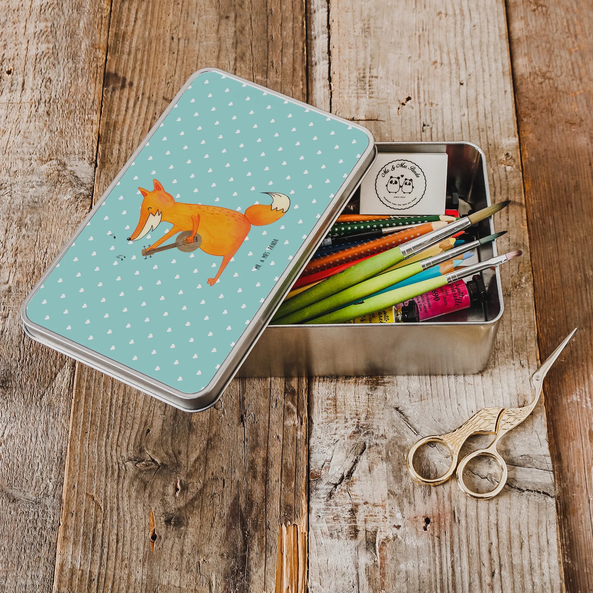 If you are searching for a truly special gift for the music lover in your life, look no further than the enchanting Mr. & Mrs. Panda metal tin featuring a delightful design of a fox with a guitar. This lovely rectangular tin is part of our cherished Fox Collection, which showcases this clever forest creature who embodies the spirit of creativity and playfulness. Enveloped in a beautiful turquoise pastel color, this tin isn’t just a container; it’s a charming addition to any music lover's space!