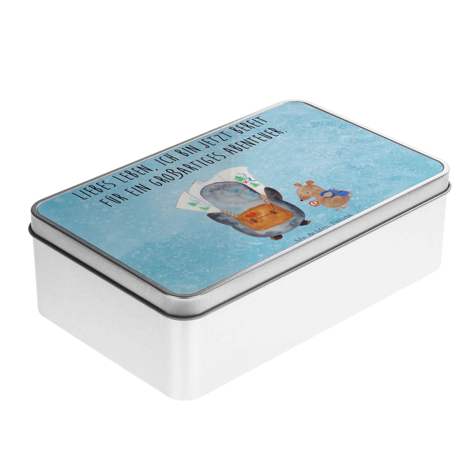 The stunning design features a curious penguin peering at a detailed map, accompanied by a clever mouse checking the compass, both ready to embark on an unforgettable adventure. With hand-drawn artwork that showcases a unique charm, this metal tin easily becomes a conversation starter in any room.