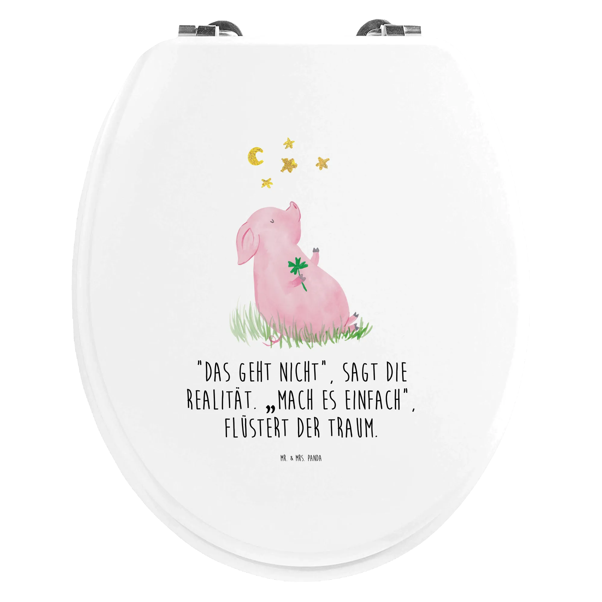 Introducing the charming Lucky Pig toilet seat from the delightful Small World collection by Mr. & Mrs. Panda! This isn't just any toilet seat; it’s a piece of art that brings happiness and luck into your bathroom. This beautiful and highly practical toilet seat is adorned with our adorable hand-drawn motif of a little piglet holding a four-leaf clover, a classic symbol of luck.