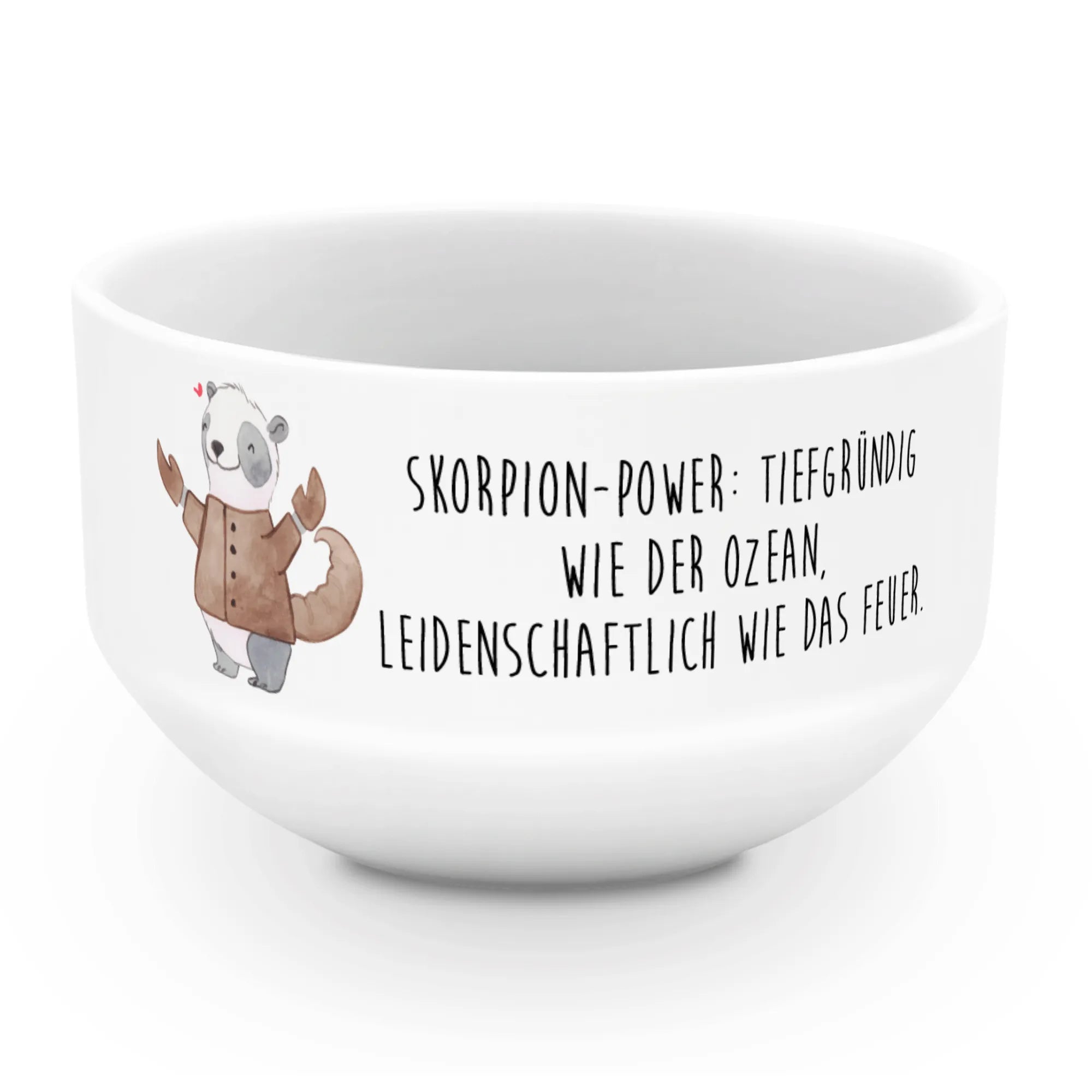 Step into the zodiac realm with our charming Scorpio panda! Dressed in a cozy brown jacket and offering a gentle smile, this panda captures the essence of Scorpio's mysterious and passionate nature. The heart above its head emphasizes the warmth that flows from those born under this sign. With the slogan 'Skorpion-Power: Tiefgründig wie der Ozean, leidenschaftlich wie das Feuer,' we celebrate the intense emotions that Scorpios are known for. This motif is perfect for anyone looking to give a thoughtful birthday gift or a unique expression of love. Let this adorable panda inspire you to embrace your feelings and celebrate life with passion.