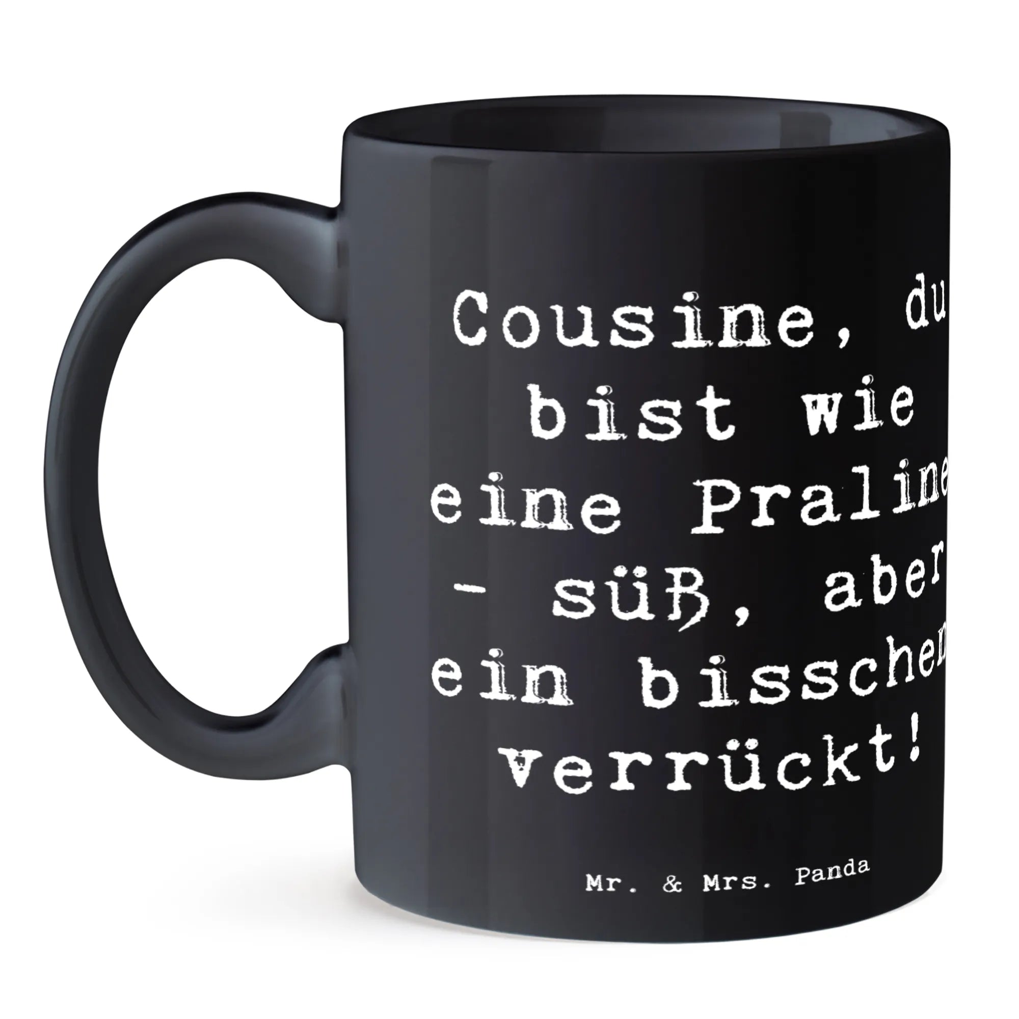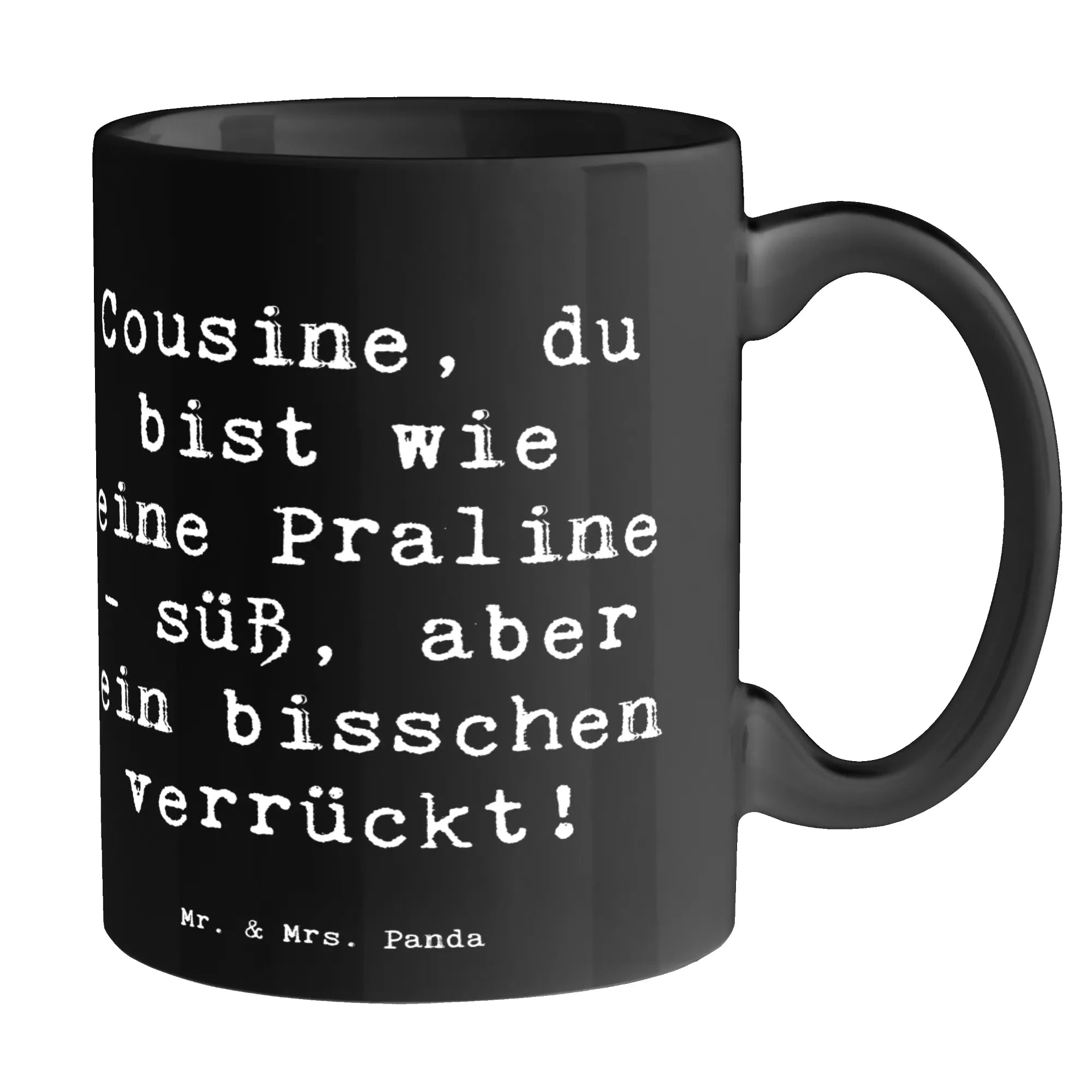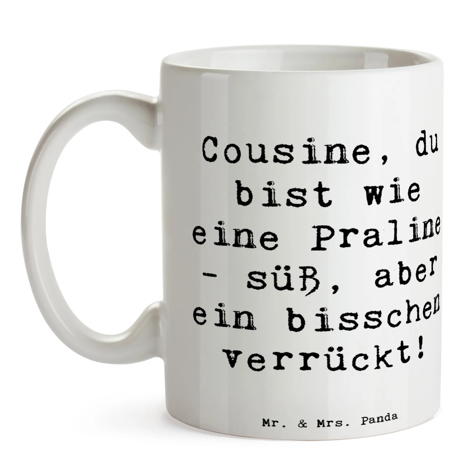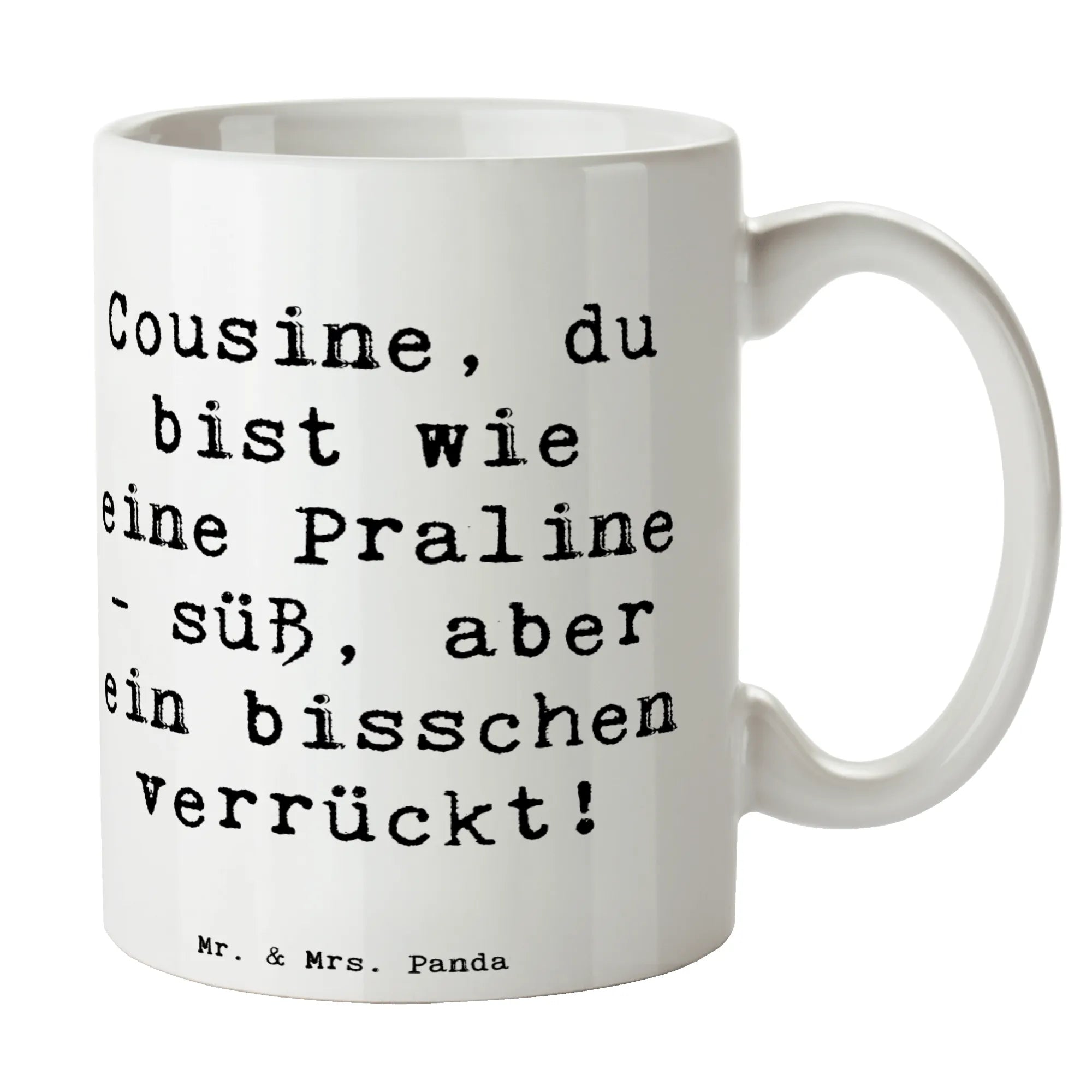 Suchst Du ein persönliches, charmantes Geschenk für Deine Cousine? Unsere Mr. & Mrs. Panda Tasse „Cousine“ aus der Kollektion Familie & Verwandte ist genau das Richtige: ein liebevoll gestalteter Kaffeebecher mit dem frechen Spruch „Cousine, du bist wie eine Praline - süß, aber ein bisschen verrückt!“ Dieser Spruch sorgt garantiert für ein Lächeln – ob zum Geburtstag, als Dankeschön oder einfach als kleine Überraschung im Alltag.