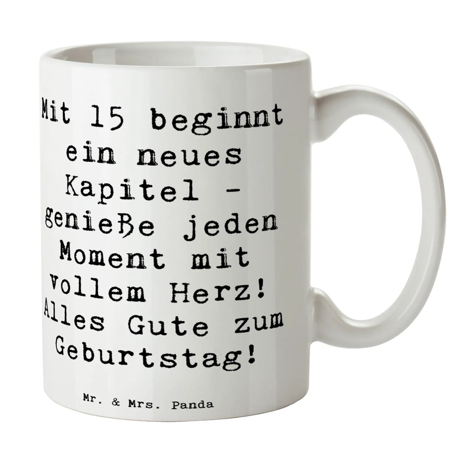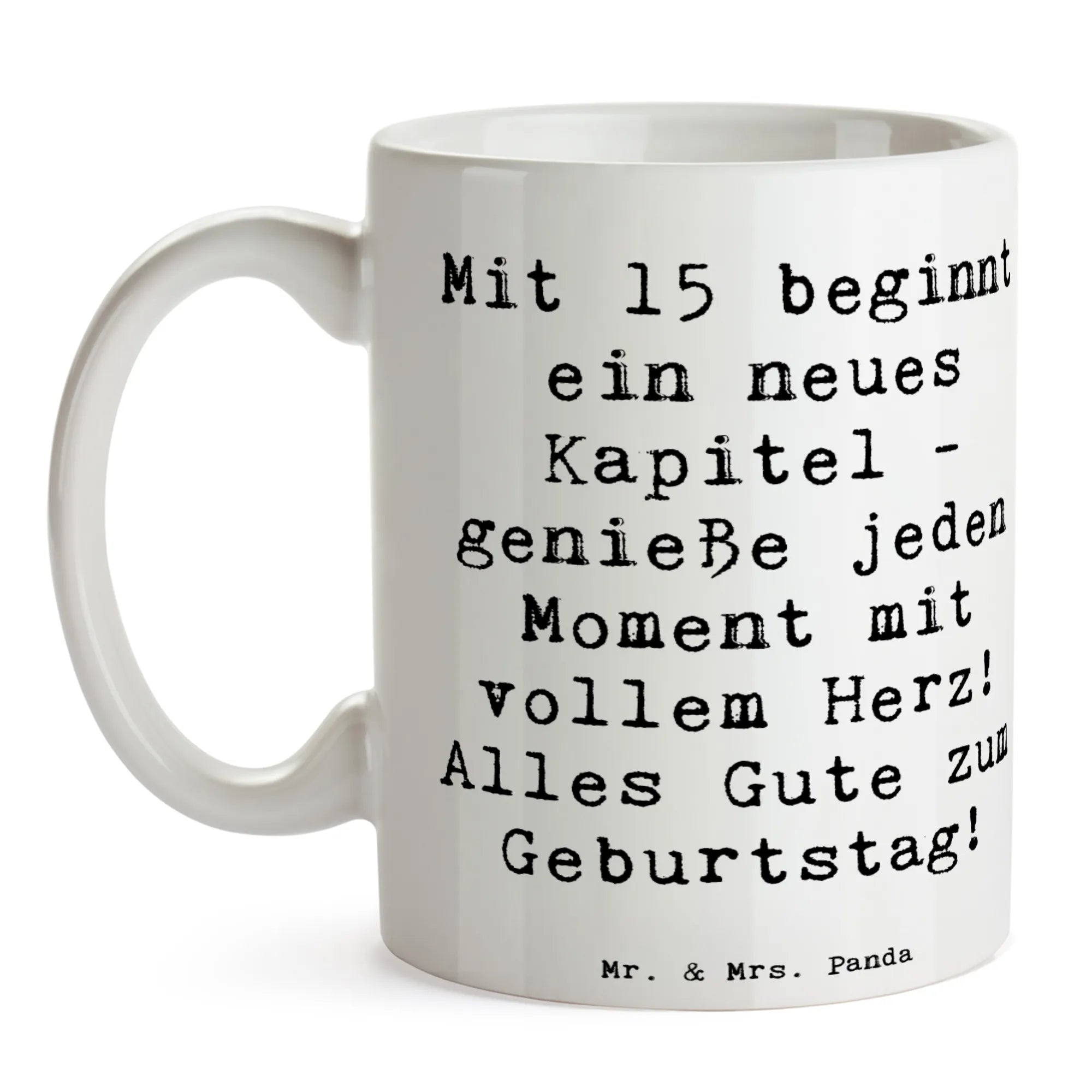Mug Saying Mit 15 beginnt ein neues Kapitel - genieße jeden Moment mit vollem Herz! Alles Gute zum Geburtstag! - White