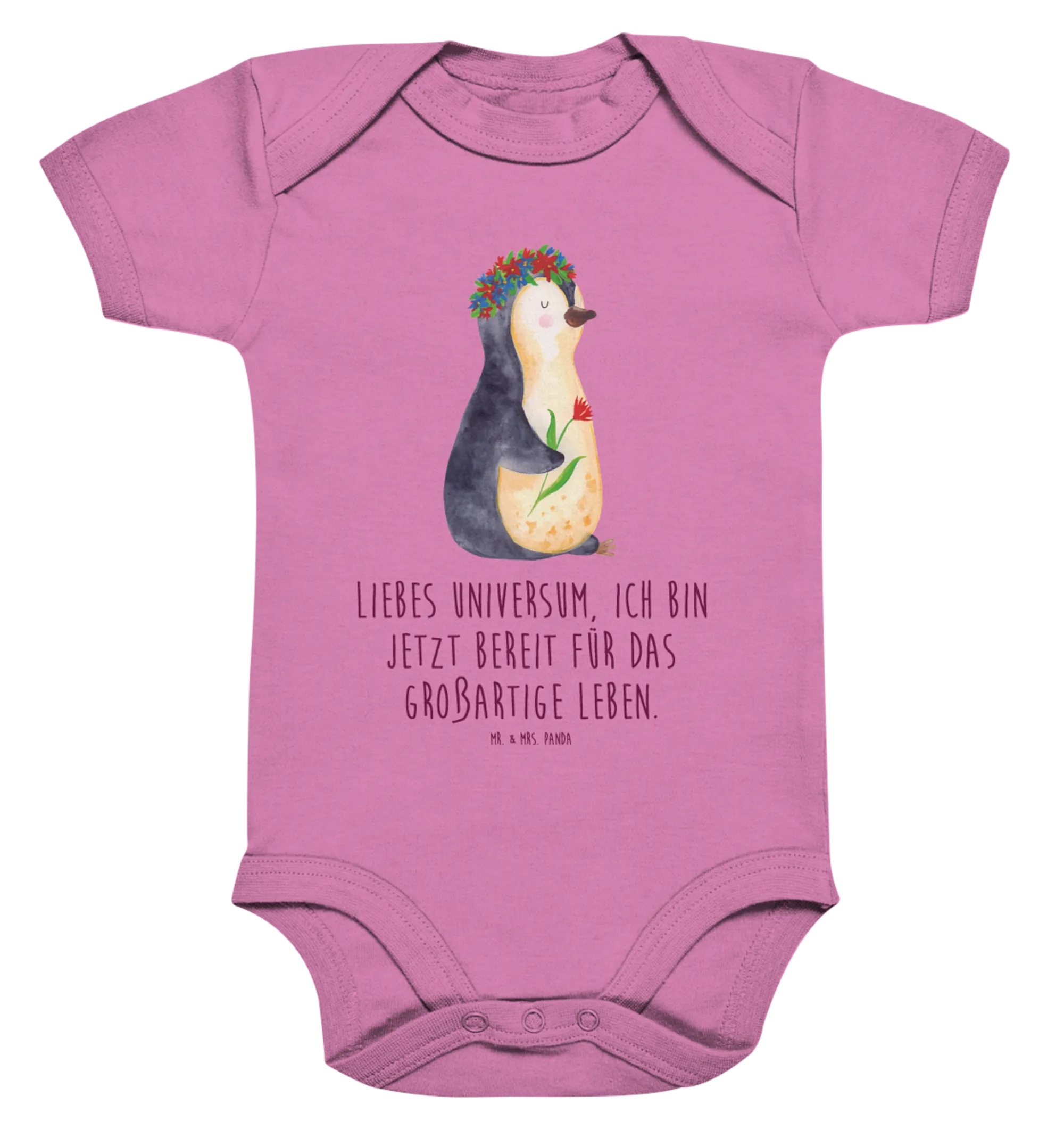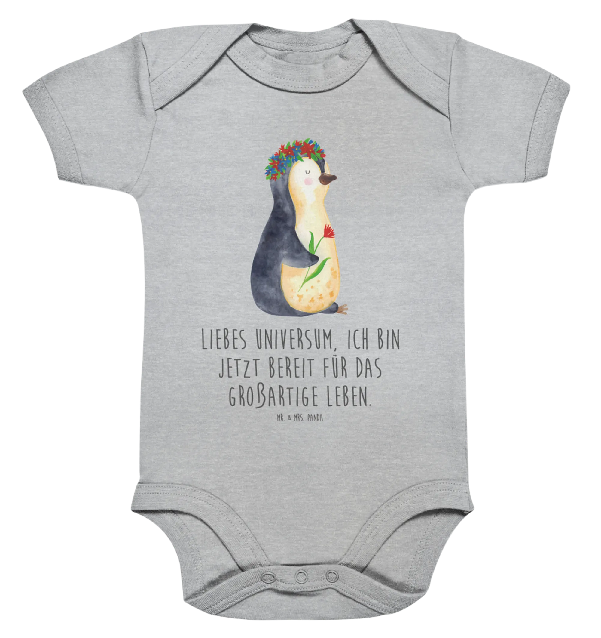 Organic Baby Body Penguin Flower babyanzug, babykleidung body, strampelanzug, Babybody, bio babybody, Strampler, overall baby, Baby-Body, Baby Body, baby overall, Babystrampler, babykleidung strampler, Einteiler, Pinguin, Universum, Leben, Lebensziele, Geschenkidee, Liebeskummer, Ziele, Wünsche, Motivation, Pinguine, Blumenkranz, Lebenslust