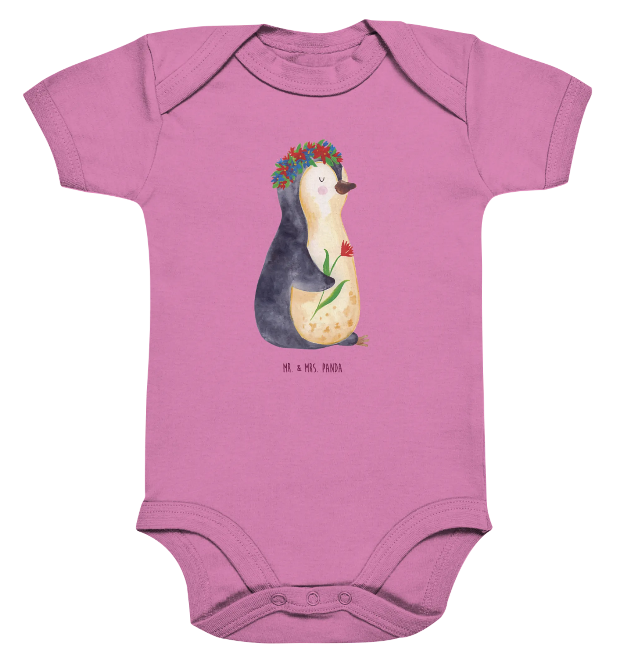 Made from 100% organic cotton, this baby bodysuit is gentle on the skin and eco-friendly, which is a wonderful combination for parents who care about their child's health and the environment. The sweet design features a delightful penguin adorned with a beautiful wreath of flowers. This motif is sure to bring smiles to everyone who sees it! In an adorable bubble gum pink color, it's a sweet choice for both baby boys and girls, making it an excellent addition to any baby's first wardrobe.