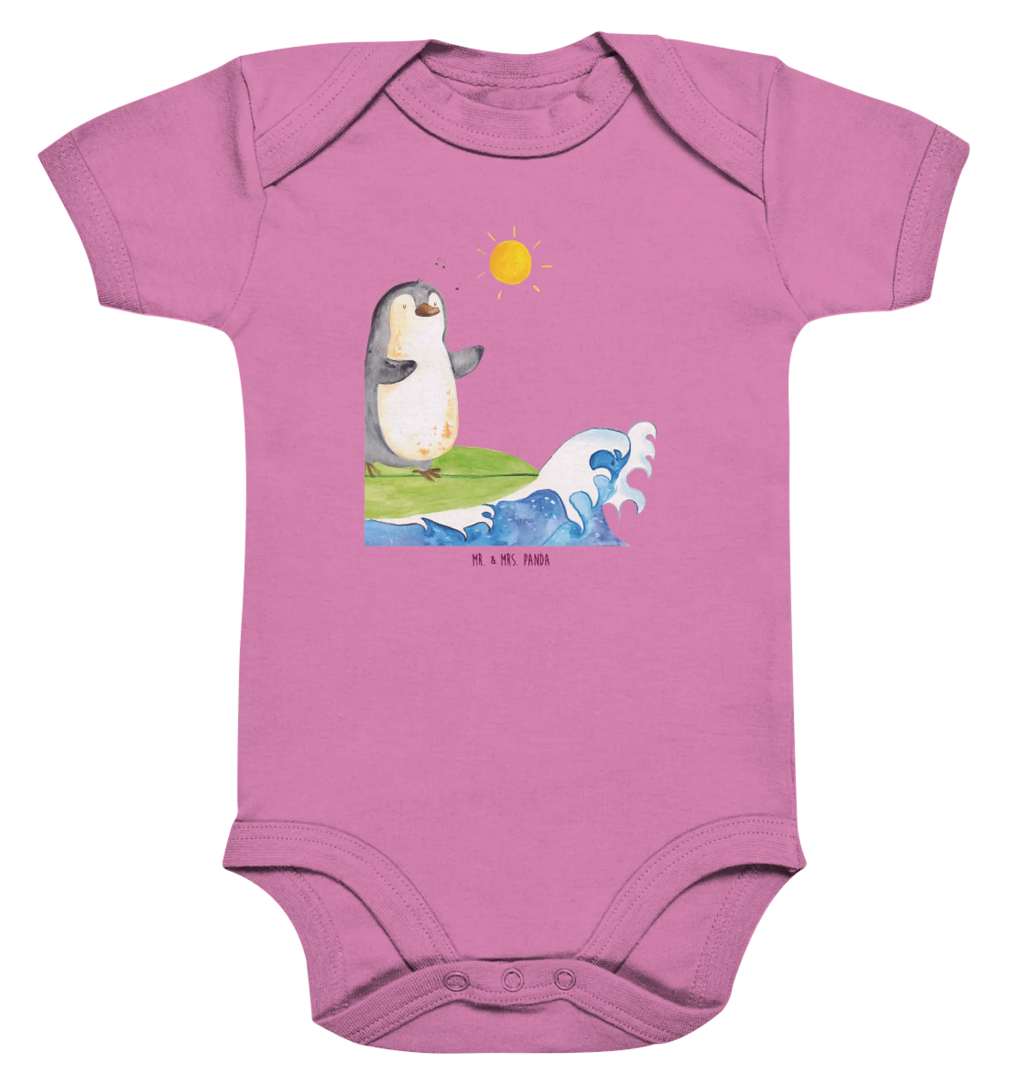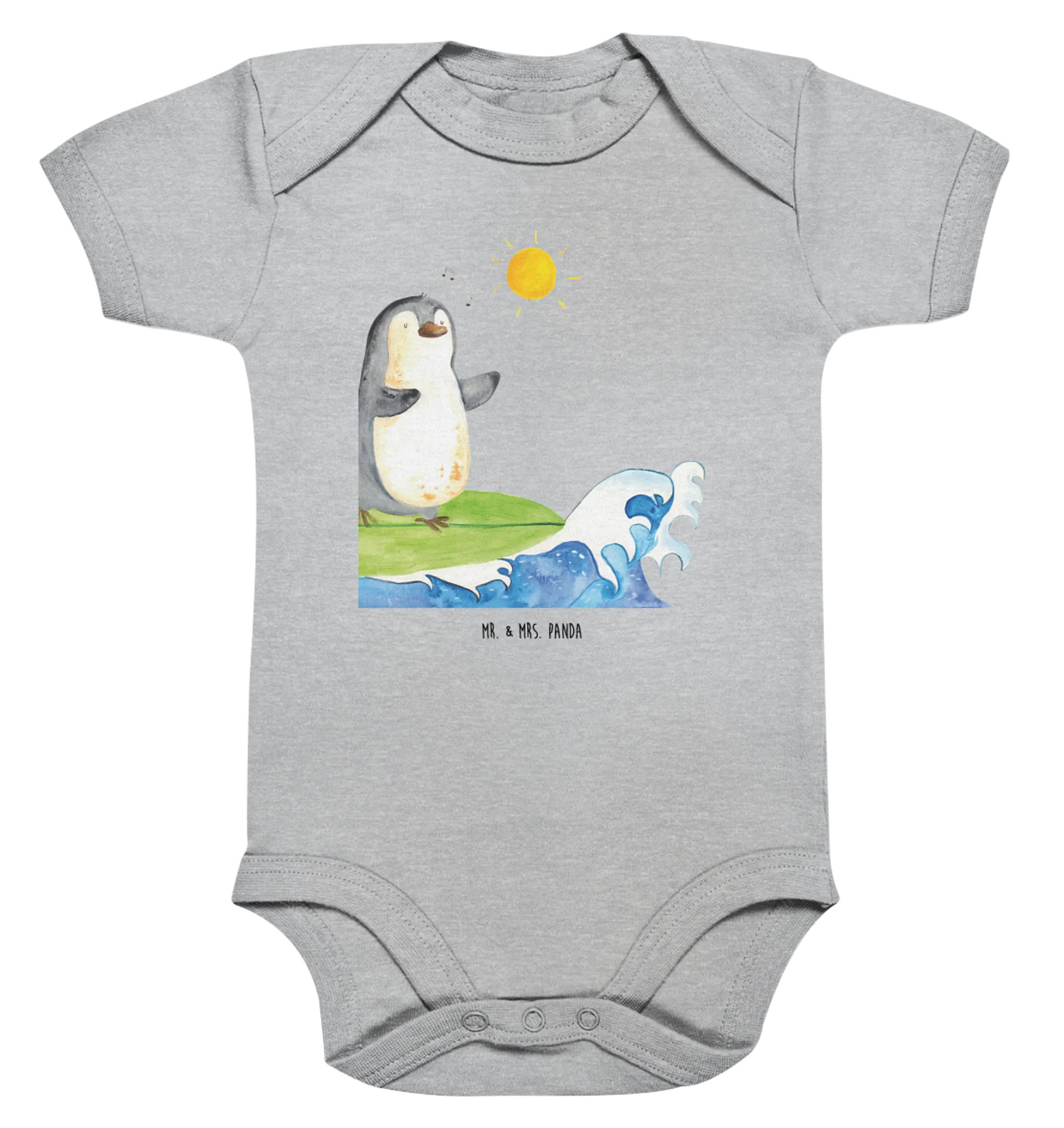 Parents understand the importance of quality when it comes to their child's clothing, and that’s why our baby body is crafted with love and care, ensuring it meets both style and safety standards. The cute penguin surfer motif is hand-drawn with watercolor by Mrs. Panda, giving it a unique touch that sets it apart from mass-produced baby wear.