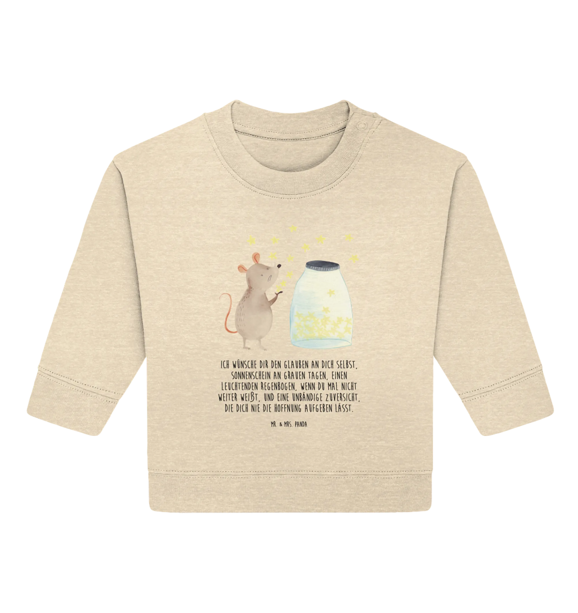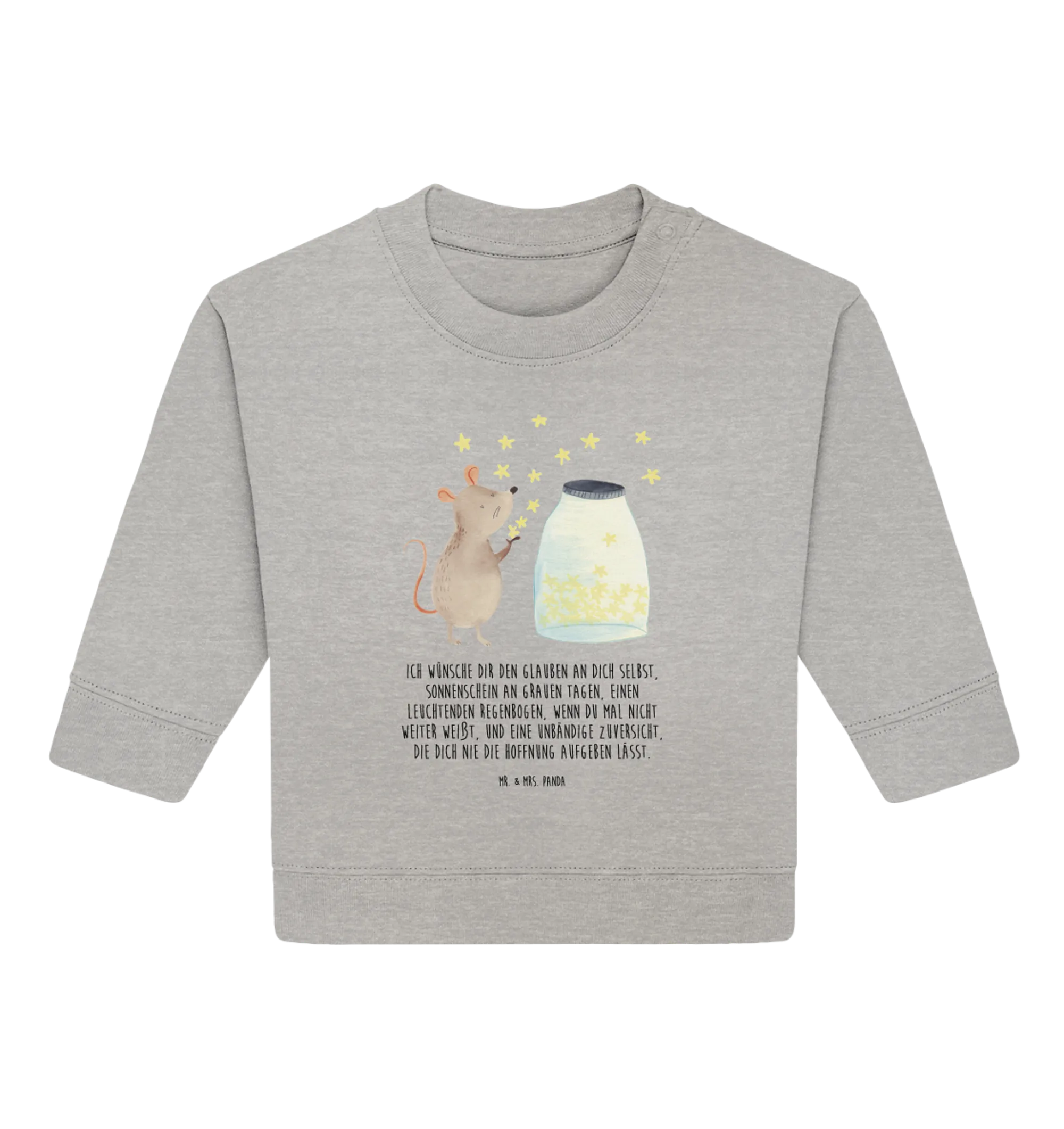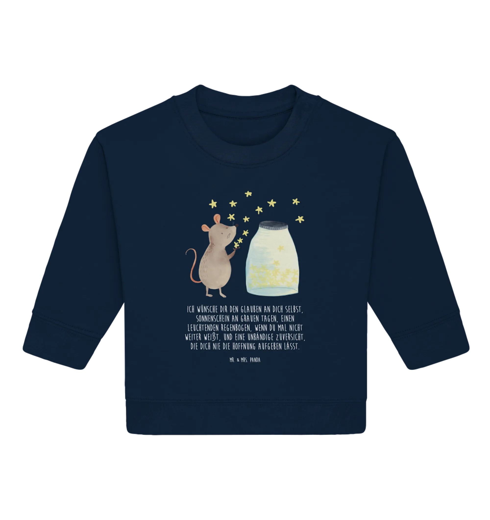 Entdecke den zauberhaften Organic Baby Pullover mit dem herzigen Motiv Maus Sterne aus unserer beliebten Kollektion Small World. Dieser Pullover ist nicht nur ein echter Hingucker, sondern auch das perfekte Geschenk für besondere Anlässe wie die Taufe, Geburt oder den ersten Geburtstag des kleinen Wunders in deinem Leben. Die niedliche Maus sitzt vor einem Glas voller funkelnder Sterne und träumt von tollen Abenteuern – ein Symbol für Hoffnung, Träume und die unendlichen Möglichkeiten, die das Leben bietet.