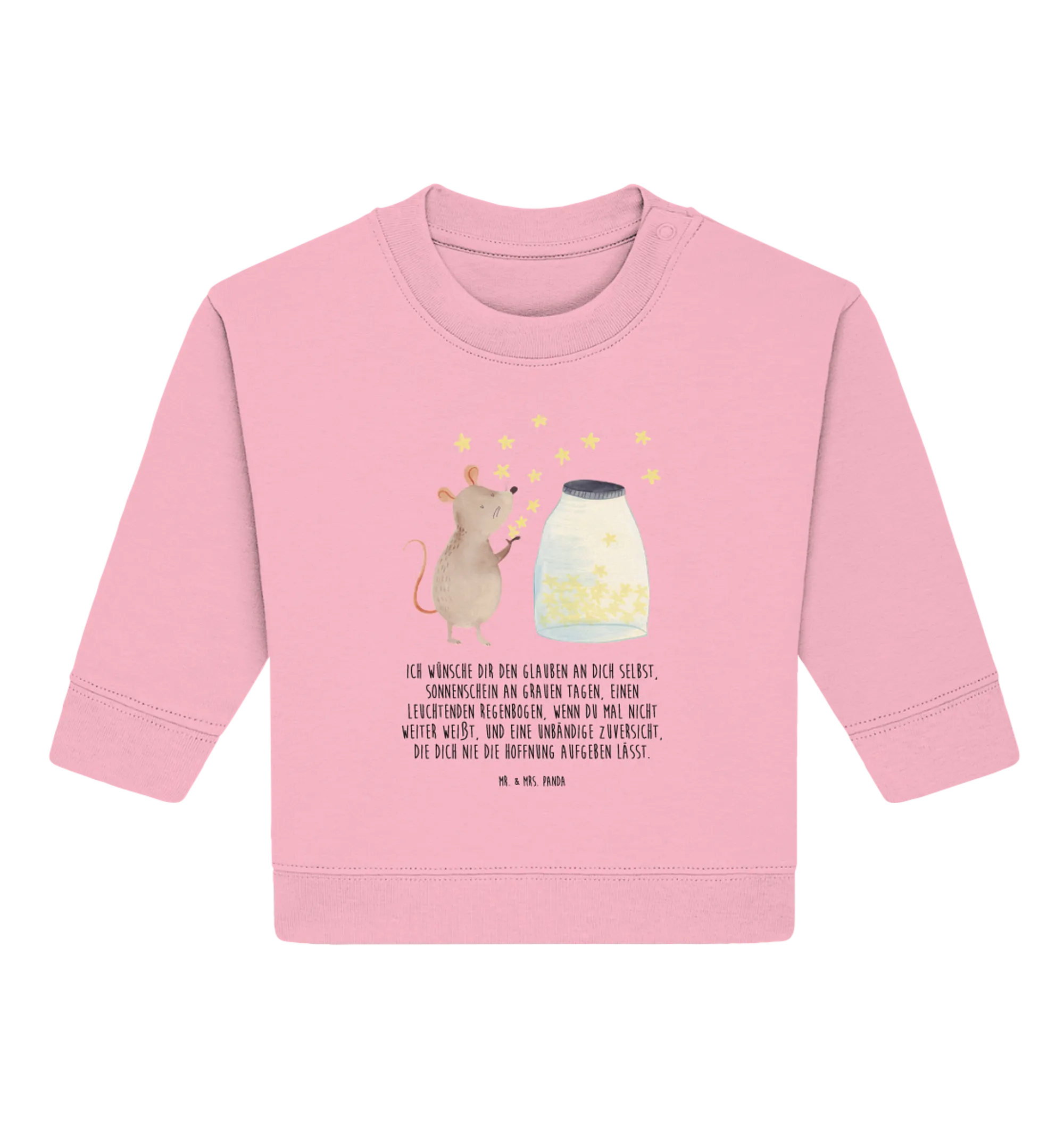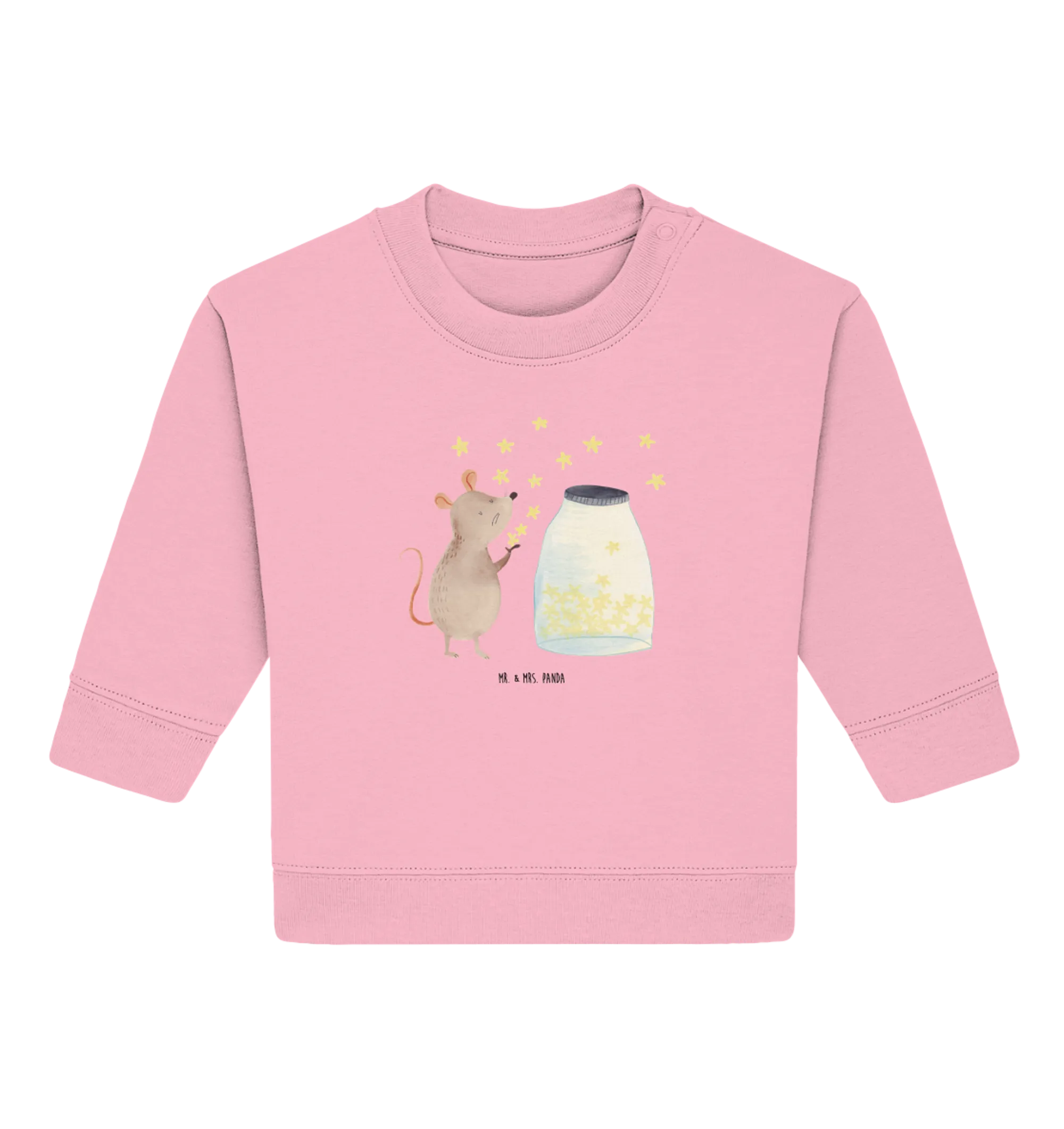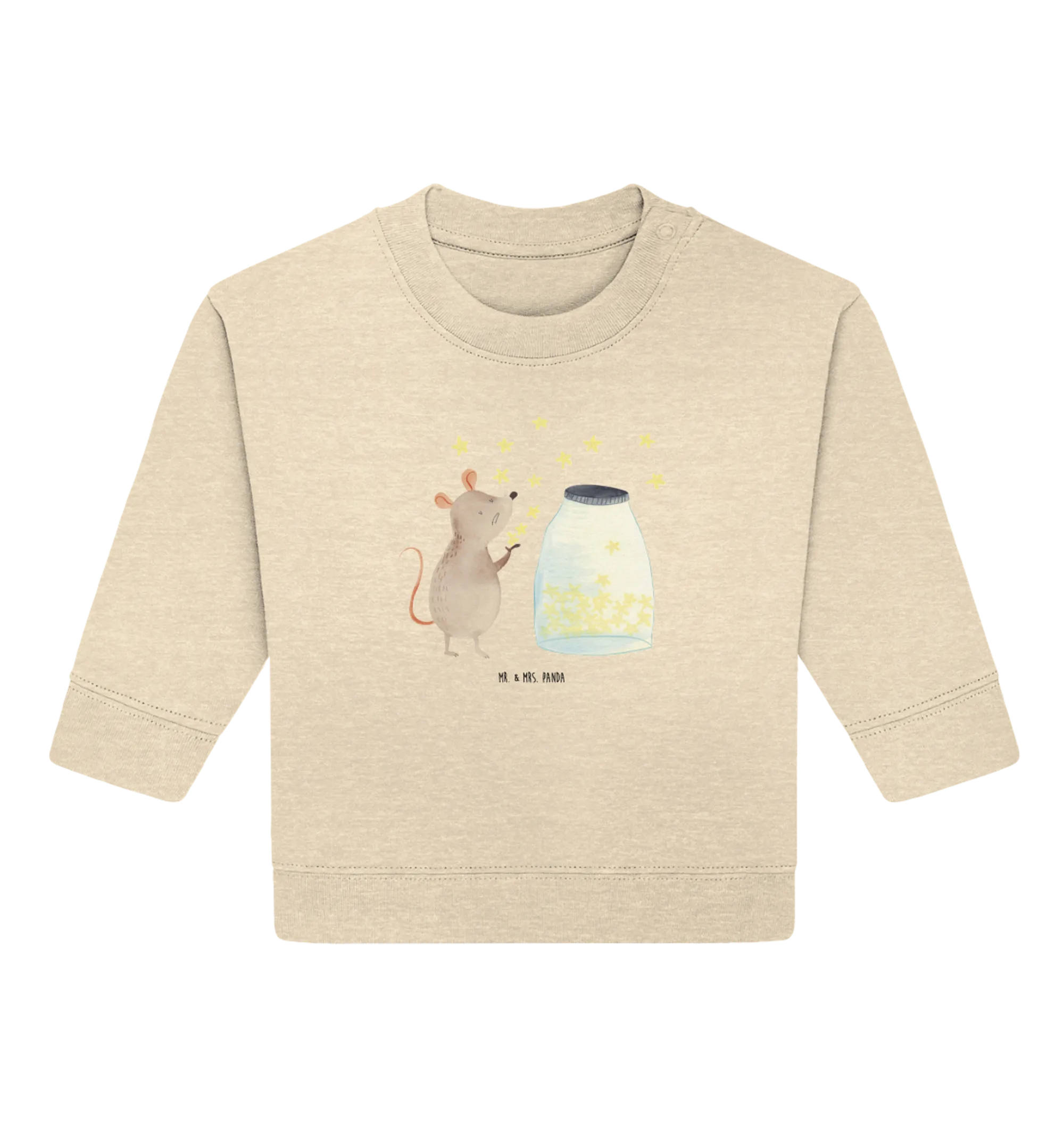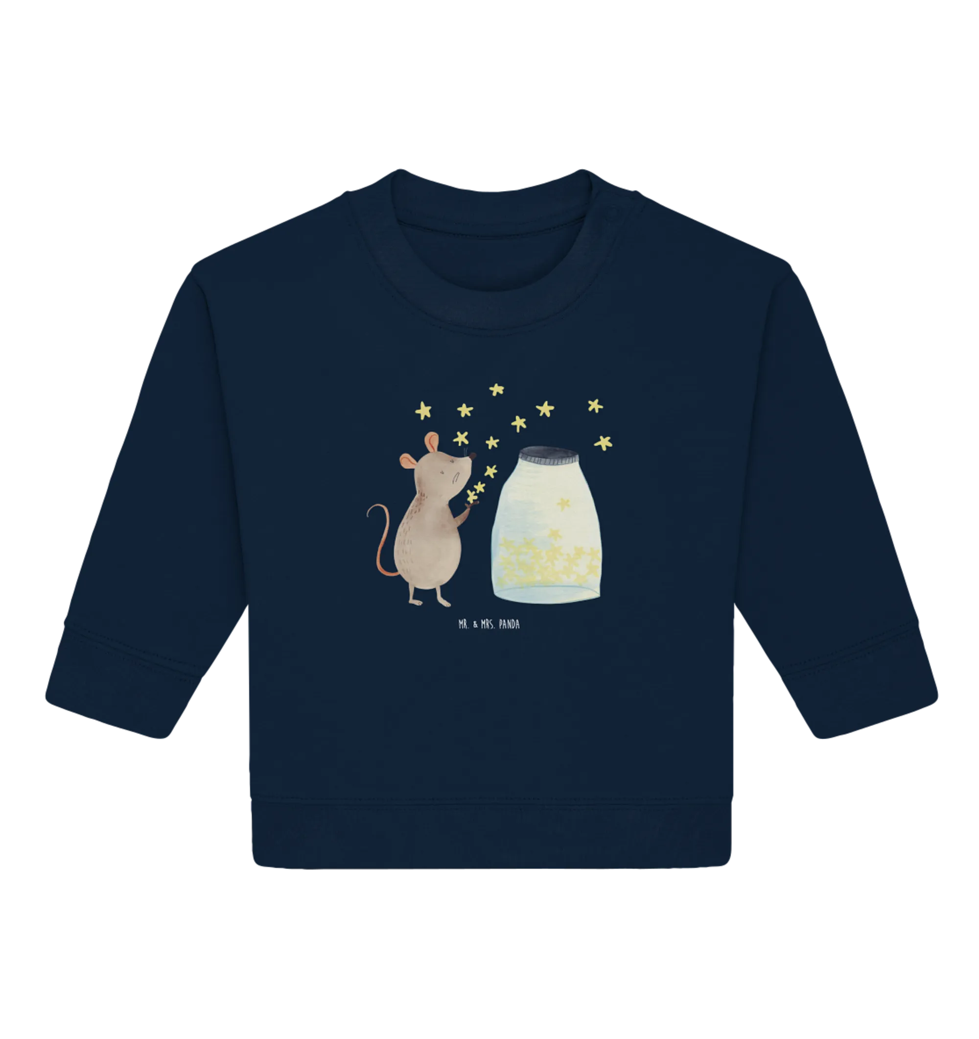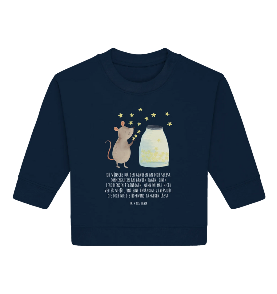 Crafted from 100% organic cotton, this baby sweatshirt ensures the utmost comfort for delicate skin while keeping your child cozy and warm. The charming design showcases an endearing mouse, capturing the imagination as it appears to release sparkling stars into the night sky—symbolizing hope, dreams, and boundless adventures awaiting your child. Each hand-drawn detail is crafted with love by Mrs. Panda, making this pullover a truly unique piece in your child's wardrobe.