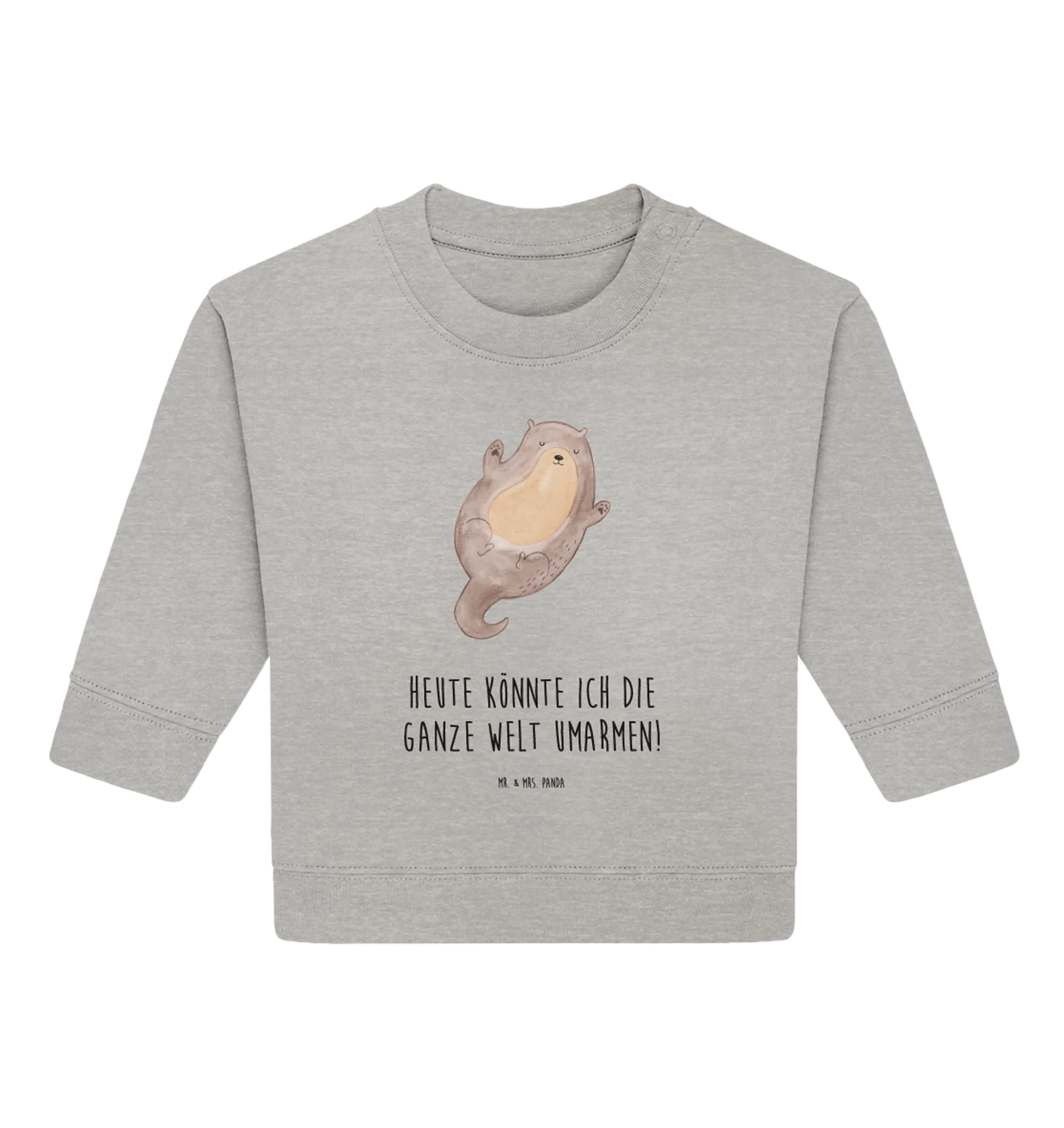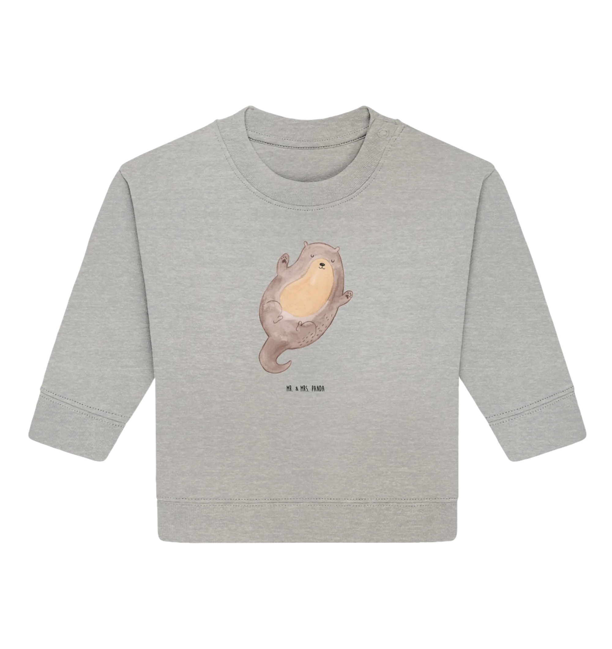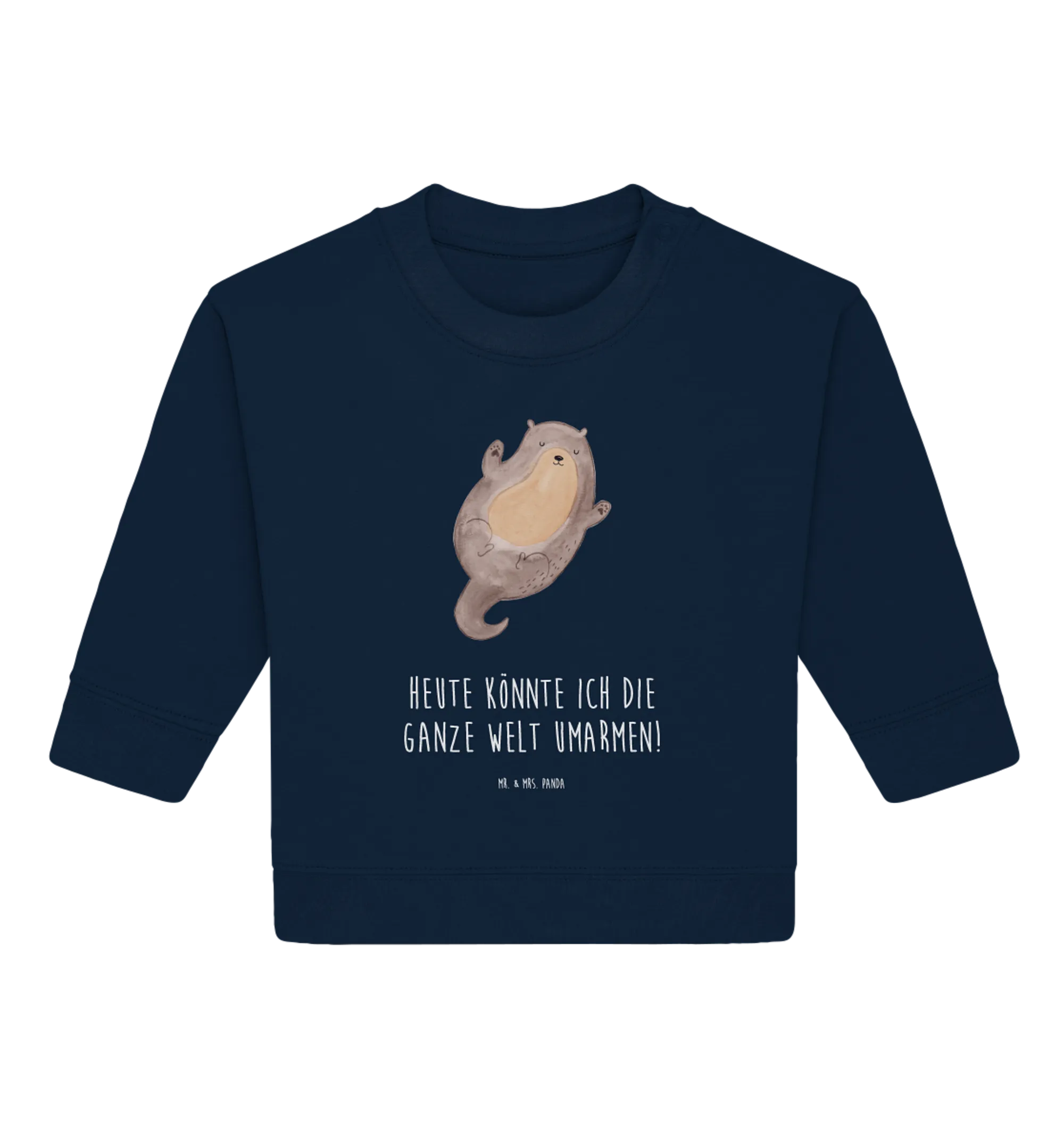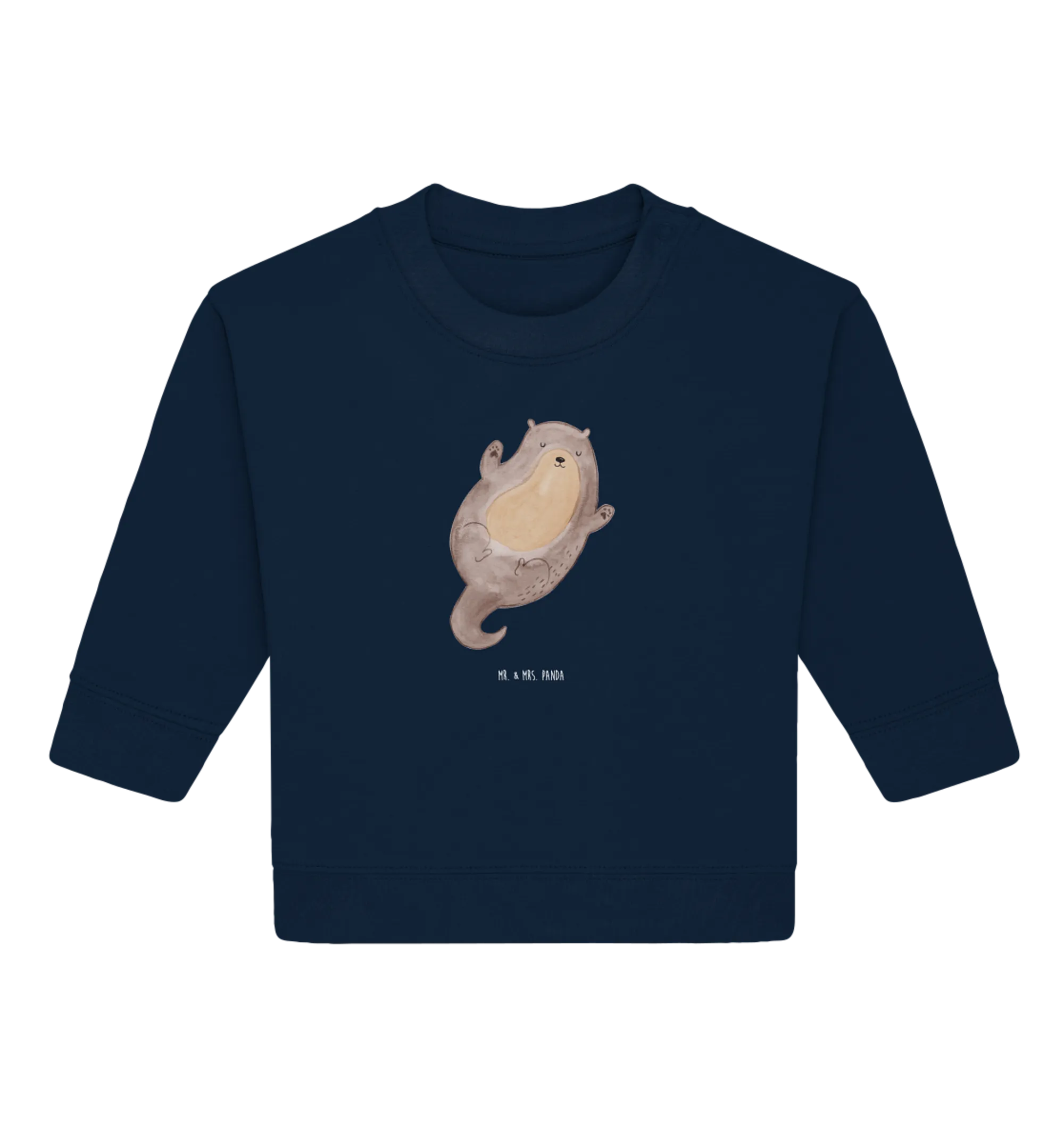Introducing our adorable Organic Baby Pullover featuring the delightful motif of an otter hugging! At Mr. & Mrs. Panda, we believe that every little one deserves a touch of warmth and love, especially when it comes from their clothing. This pullover comes from our exclusive Otter Collection, where each design is hand-drawn with care by Mrs. Panda. The cute otter, floating on its back with arms wide open, perfectly captures the essence of joy and innocence in children.