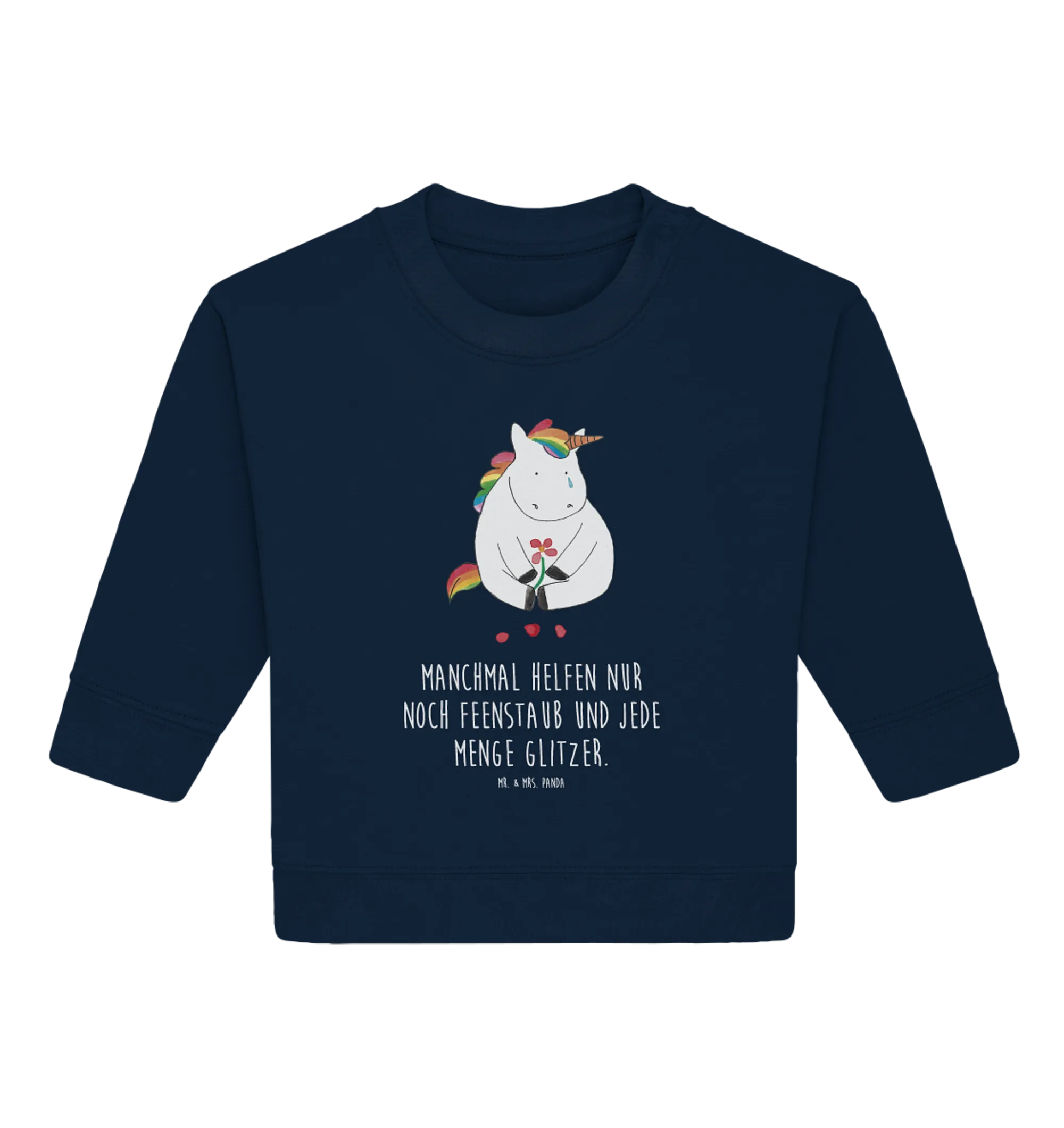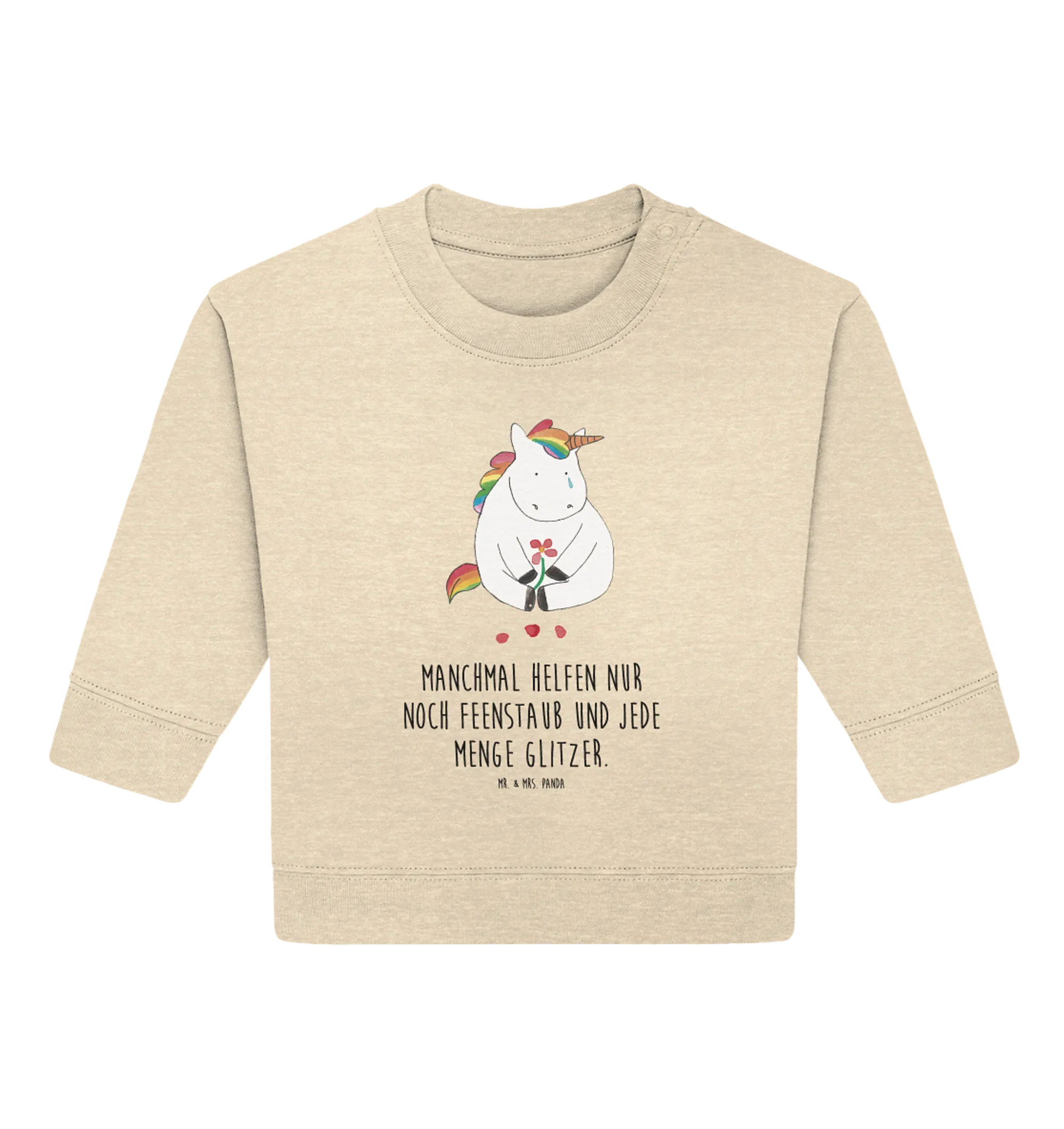 Crafted from Öko Baumwolle, this organic baby pullover not only feels soft against your baby's sensitive skin but also promotes eco-friendliness—because every little bit helps in saving our beautiful planet. The enchanting design showcases a sad unicorn, making it a perfect conversation starter. Ooooh, a sad unicorn... I guess there's only so much glitter left! With its tear and heartfelt expression, it brings a touch of whimsy to any outfit.