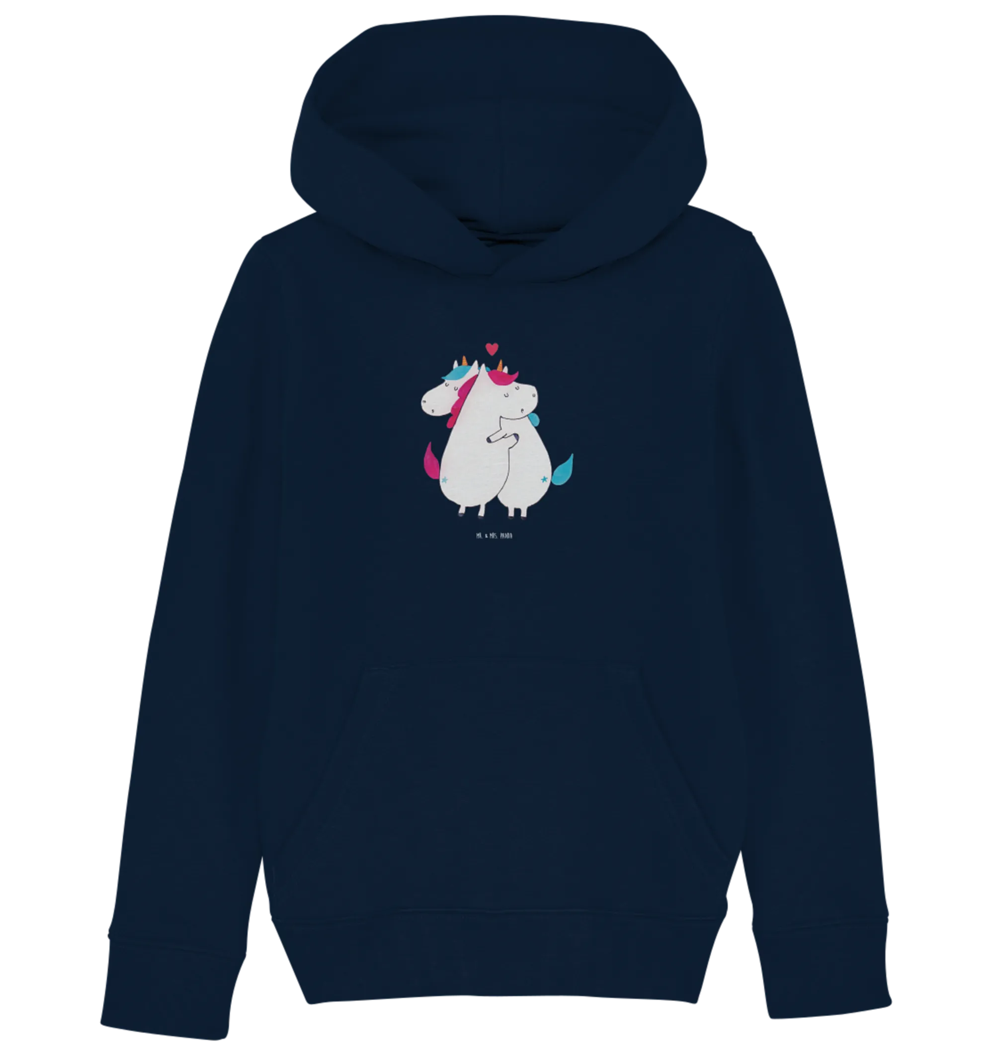The charming design features two snuggling unicorns enveloped in a swirl of colors, capturing the magic and whimsy that every child loves. The vibrant French Navy background beautifully contrasts with the colorful unicorns, making it not just a trendy kids' hoodie but also an artistic masterpiece.