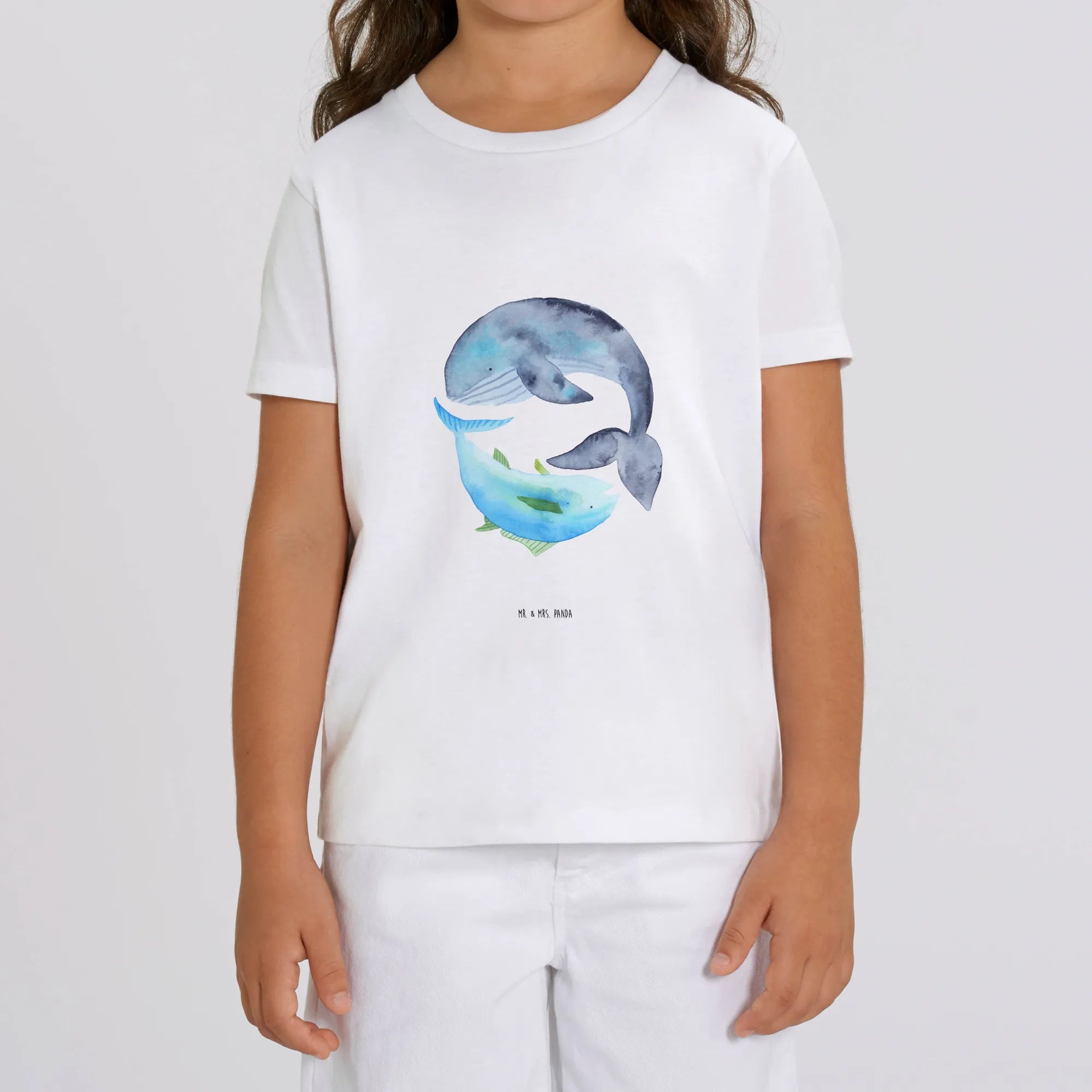 Introducing the delightful Organic Kids T-Shirt featuring our endearing Cetus & Tuna motif from the beloved Small World collection by Mr. & Mrs. Panda! This charming T-shirt, designed especially for children, showcases an adorable whale and tuna swimming together, making it a perfect pick for young animal lovers.