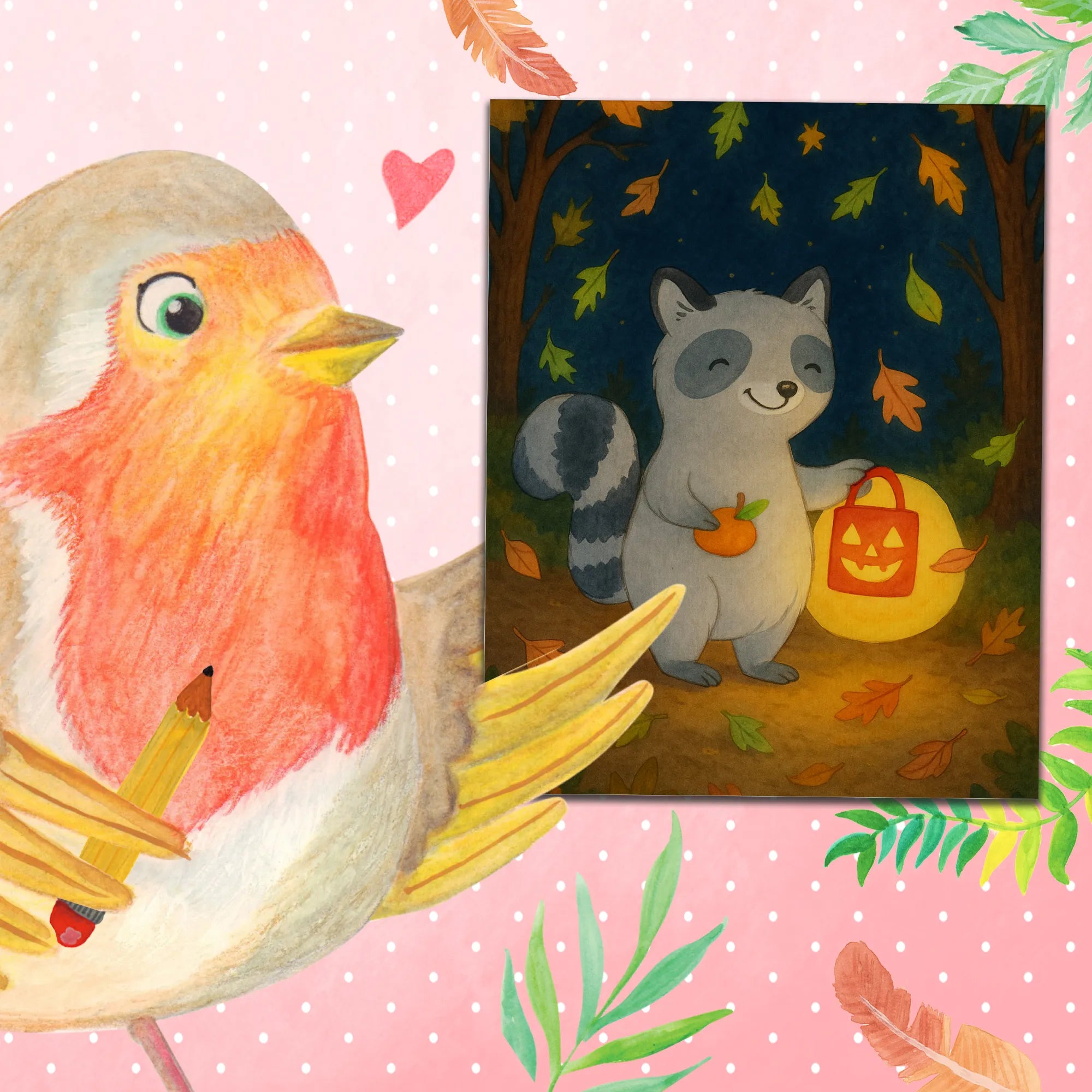 Schau dir diesen süßen Waschbären an! Mit seiner leuchtenden Laterne in der Hand bringt er die Freude des Herbstes direkt zu dir. Umgeben von herabfallenden Blättern strahlt er die gute Laune und den Spaß aus, den die Halloween-Zeit mit sich bringt. Sein freundliches Lächeln erinnert uns daran, wie wichtig es ist, die Leichtigkeit des Lebens zu feiern, vor allem in dieser magischen Zeit des Jahres. Ob du dich verkleidest, Süßigkeiten sammelst oder einfach die Atmosphäre genießt – dieser Waschbär ist ein Teil jeder festlichen Feier und wird sich in dein Herz schleichen. Die Laterne, die er trägt, symbolisiert das Licht in der Dunkelheit und lässt uns alle zusammenrücken, um die verrückten Abenteuer von Halloween zu genießen.