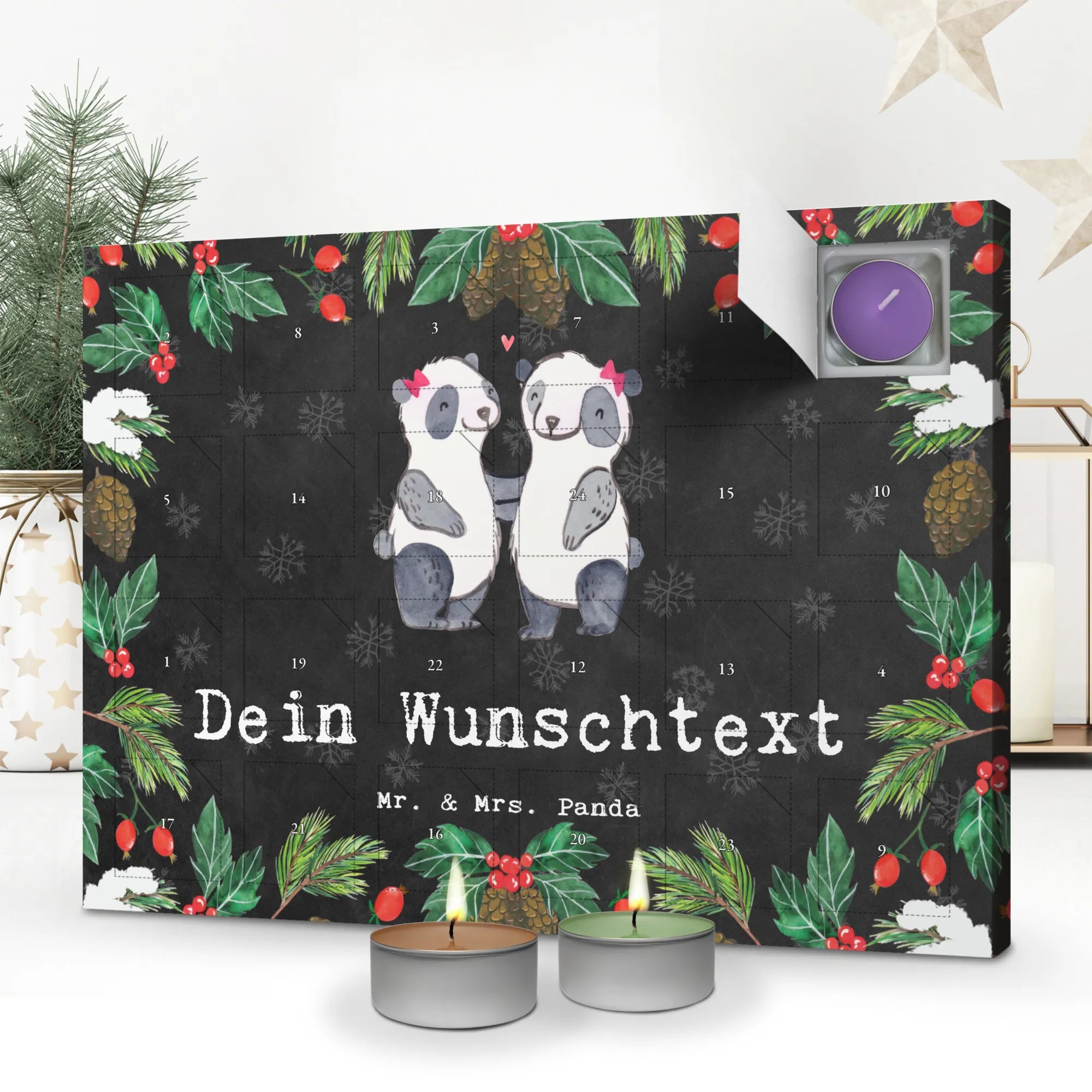 Verschenke Duftmomente: Bestell jetzt deinen personalisierten Duftkerzen-Adventskalender und überrasche mit 24 liebevollen Duftmomenten von Mr. & Mrs. Panda!