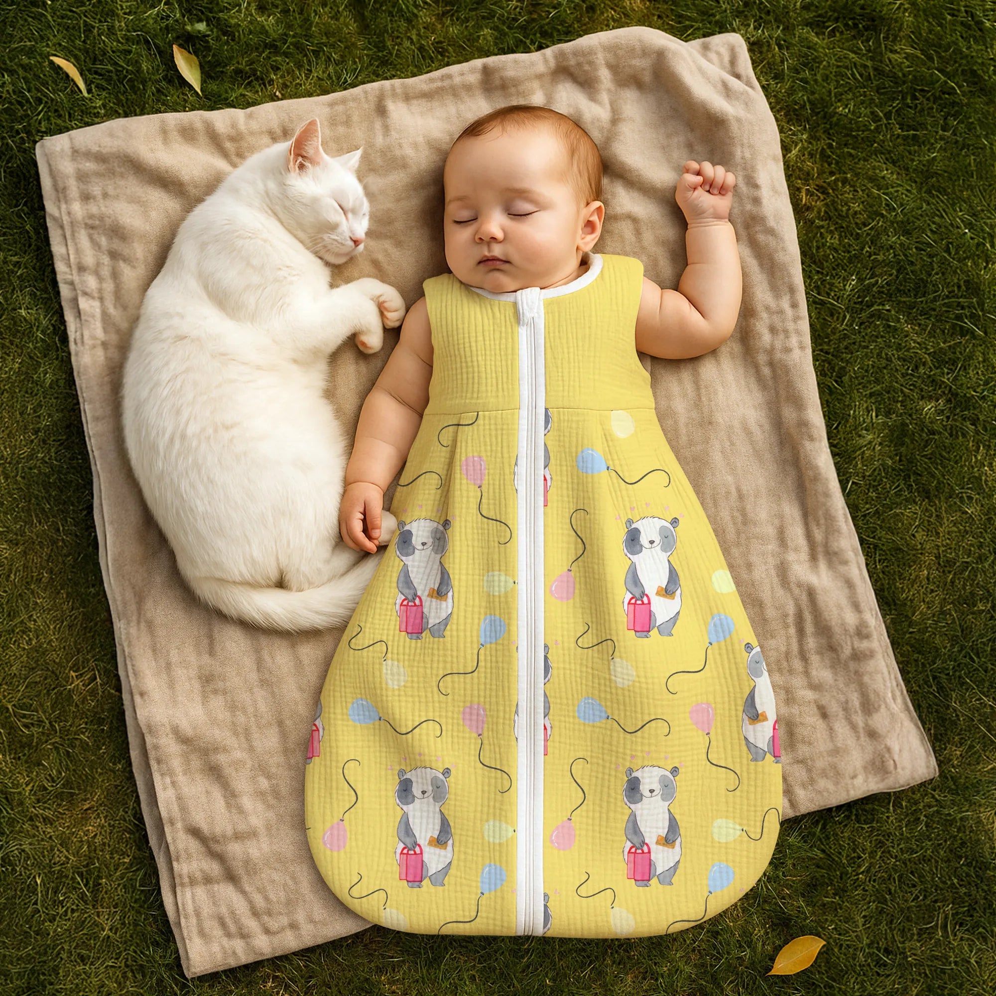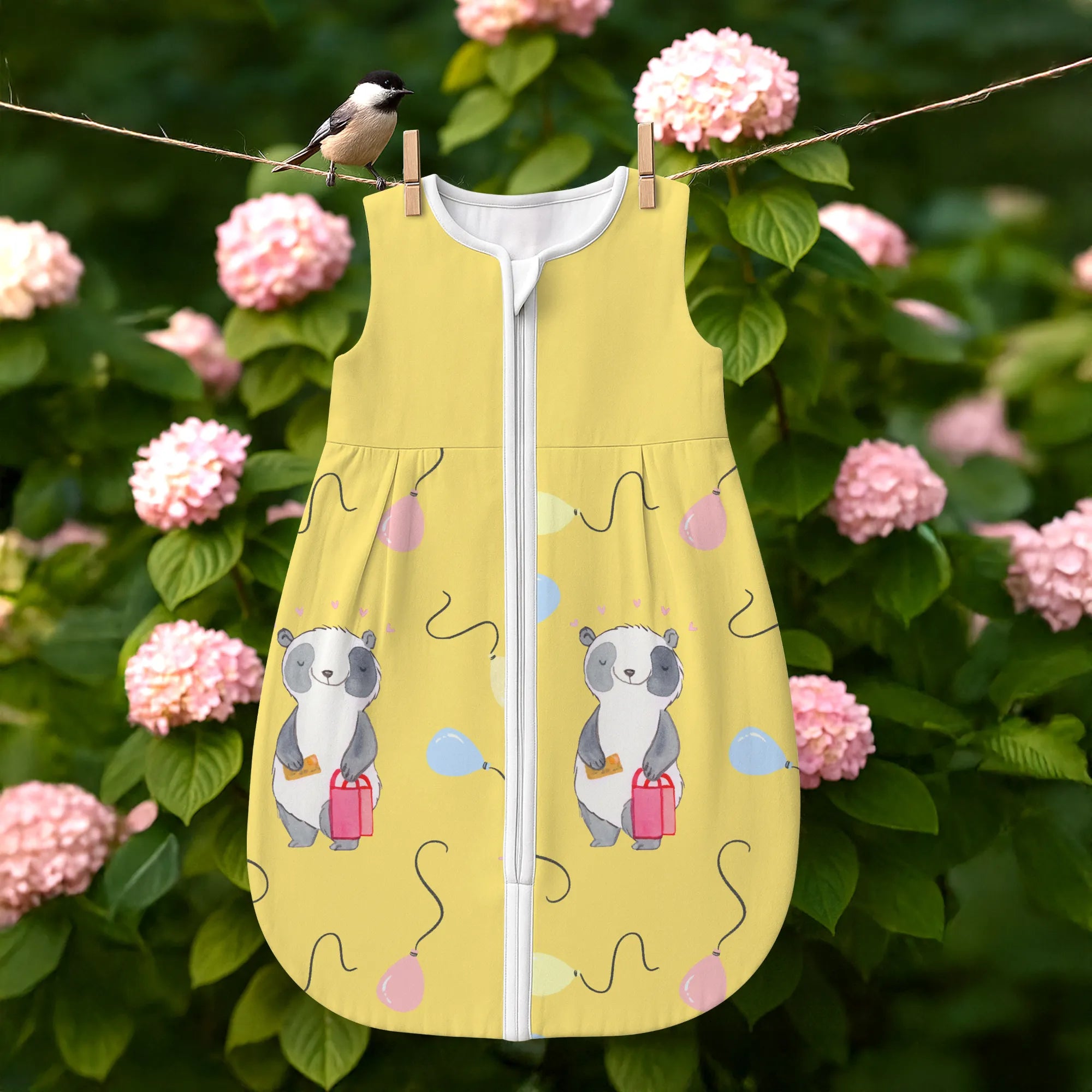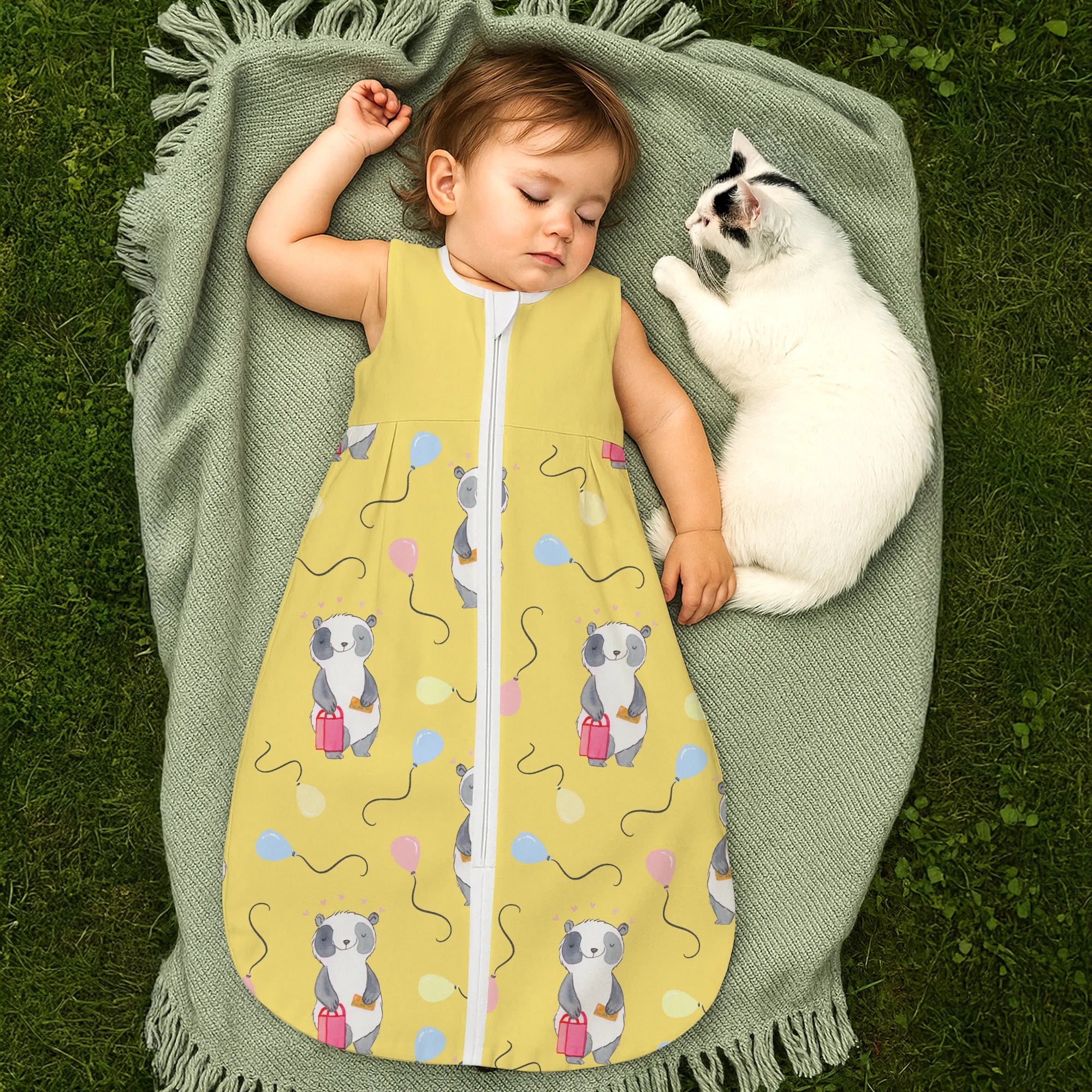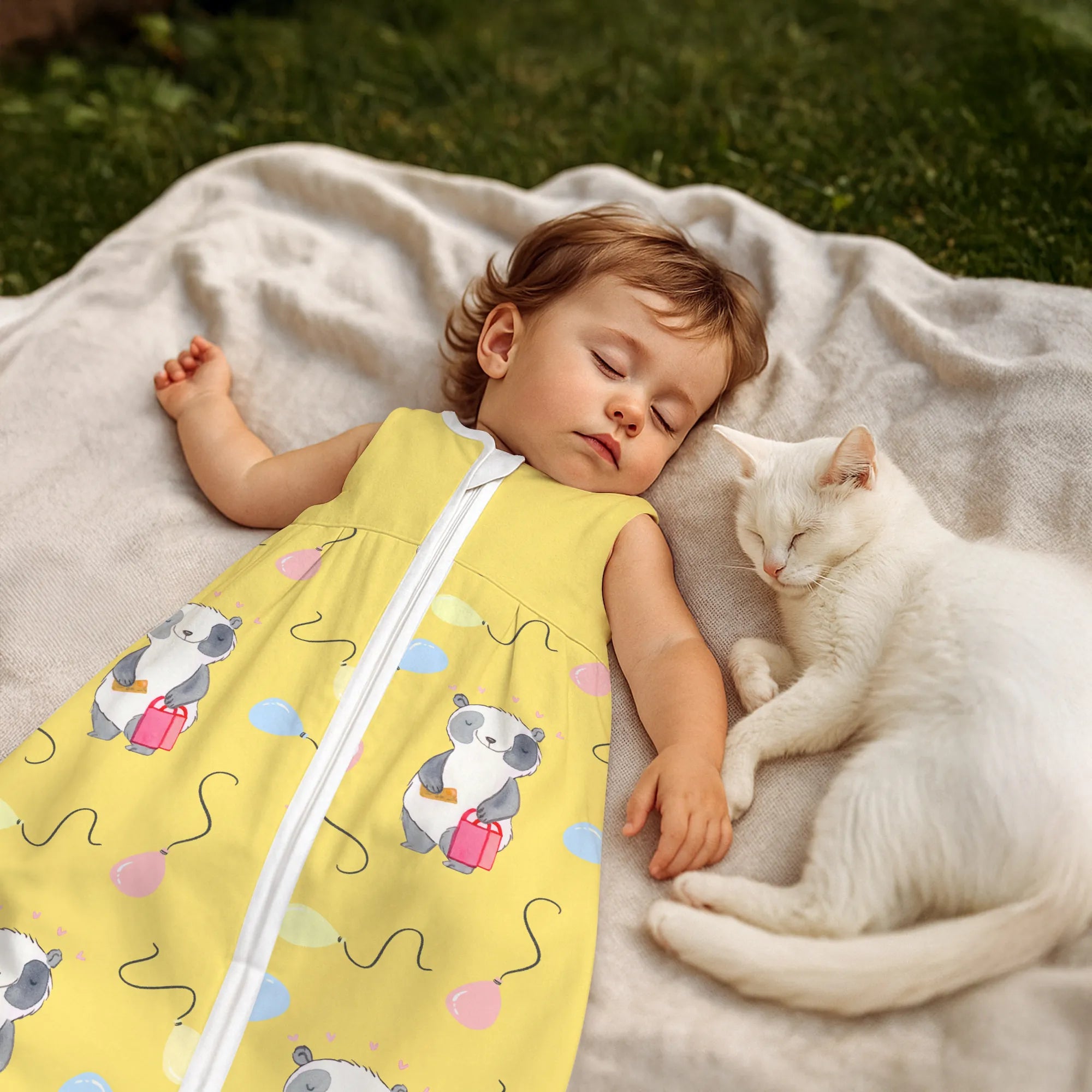 The baby sleeping bag from Mr. & Mrs. Panda combines charming design with maximum comfort. As a baby sleeping bag, it is printed with cute motifs and sayings from Mr. & Mrs. Panda and delights with very bright colors. The soft, breathable fabric ensures a high level of wearing comfort and a pleasant fit that makes dressing and undressing easier. A practical zipper allows quick diaper changes, while the fine binding at the neckline, sleeves and leg openings is gentle on the skin. Depending on the variant, it is available in different materials, including skin-friendly cotton, and comes in many sizes — please refer to the size chart. Not customizable and handmade for you. Easy care: machine washable at a maximum of 30 °C; gentle detergents recommended.