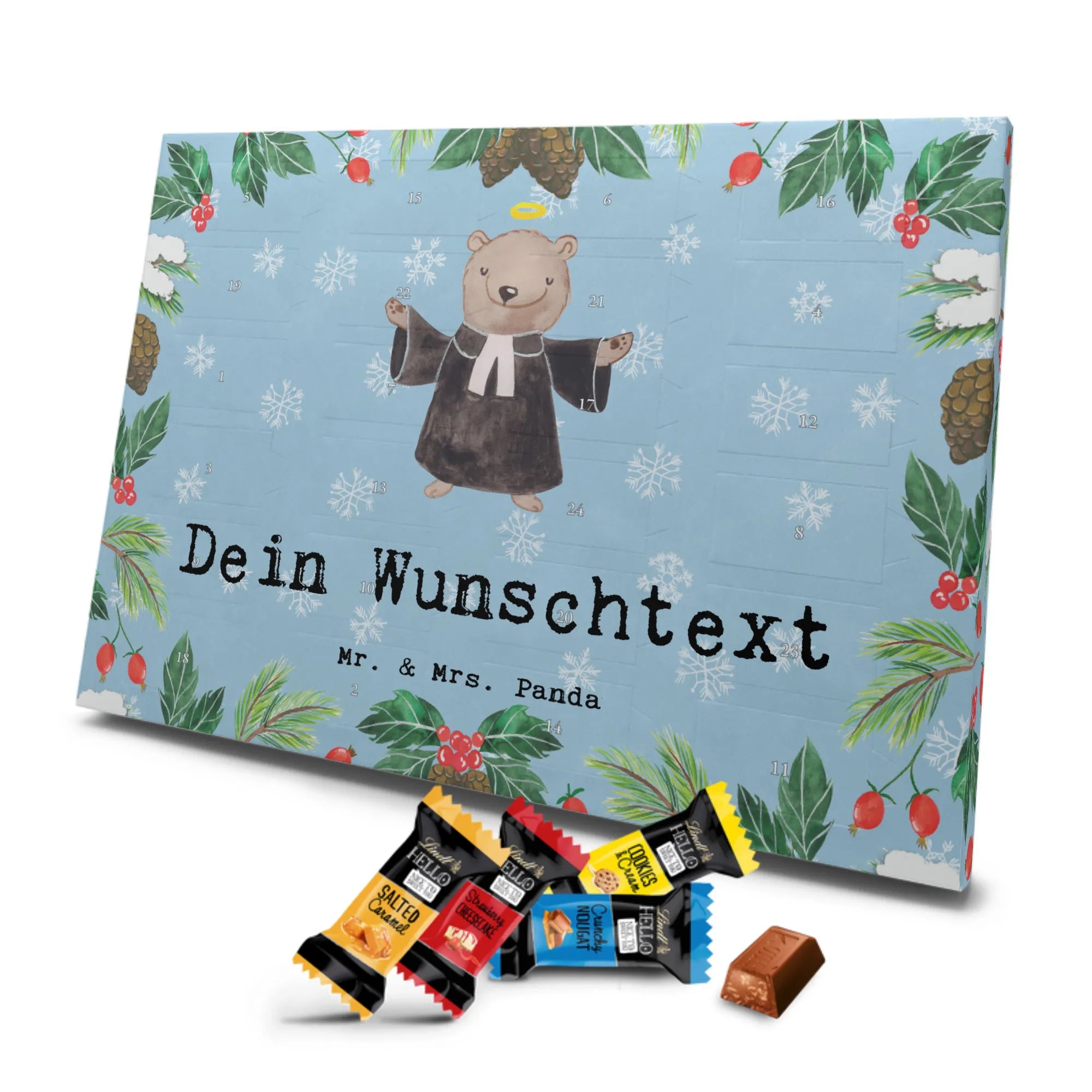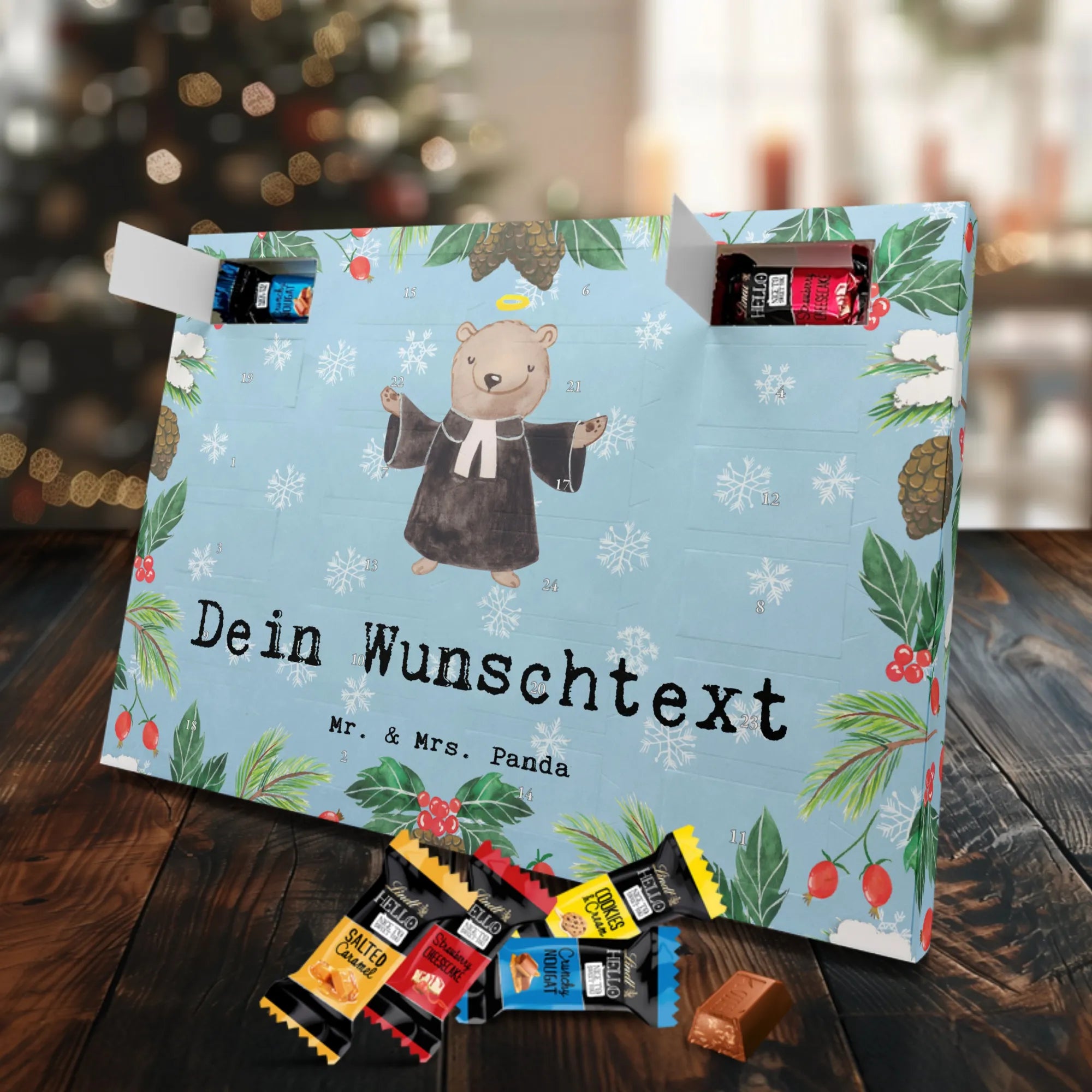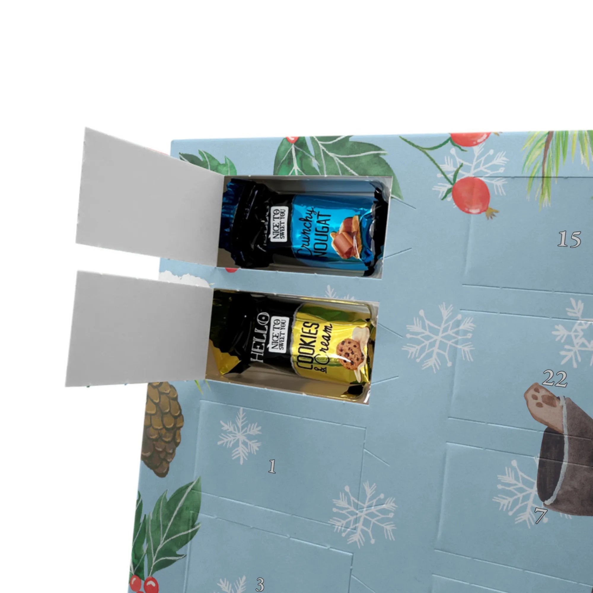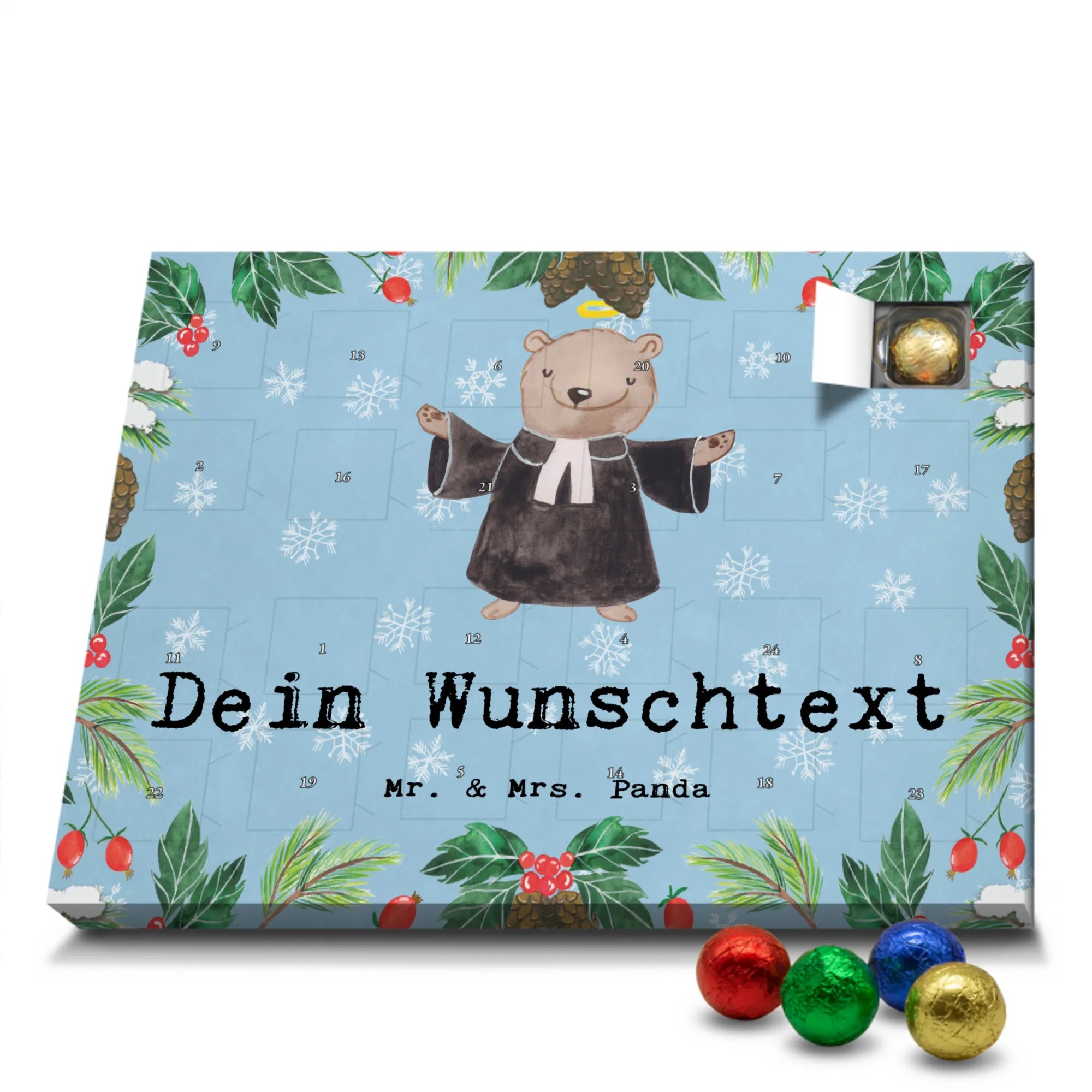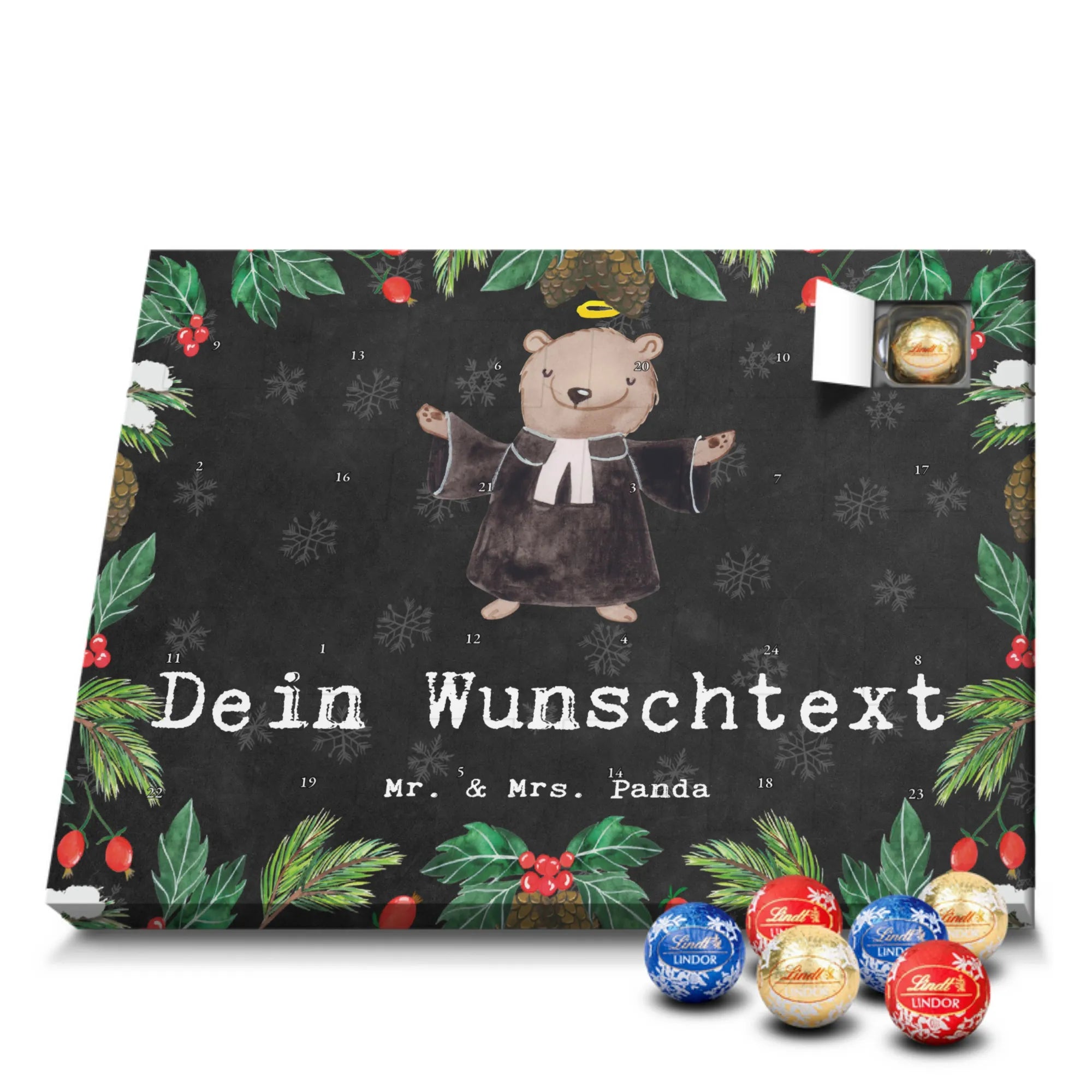 Make the Advent season even more special with the personalized chocolate Advent calendar from Mr. & Mrs. Panda. This unique Advent calendar is printed with your desired name or a custom text and features exclusive designs and sayings from the renowned designer duo. It's not only a visual highlight but also delights taste buds with 24 high-quality chocolate balls in various colors. The brilliant print quality and the silk-matte finish make this calendar a true eye-catcher during the Christmas season.