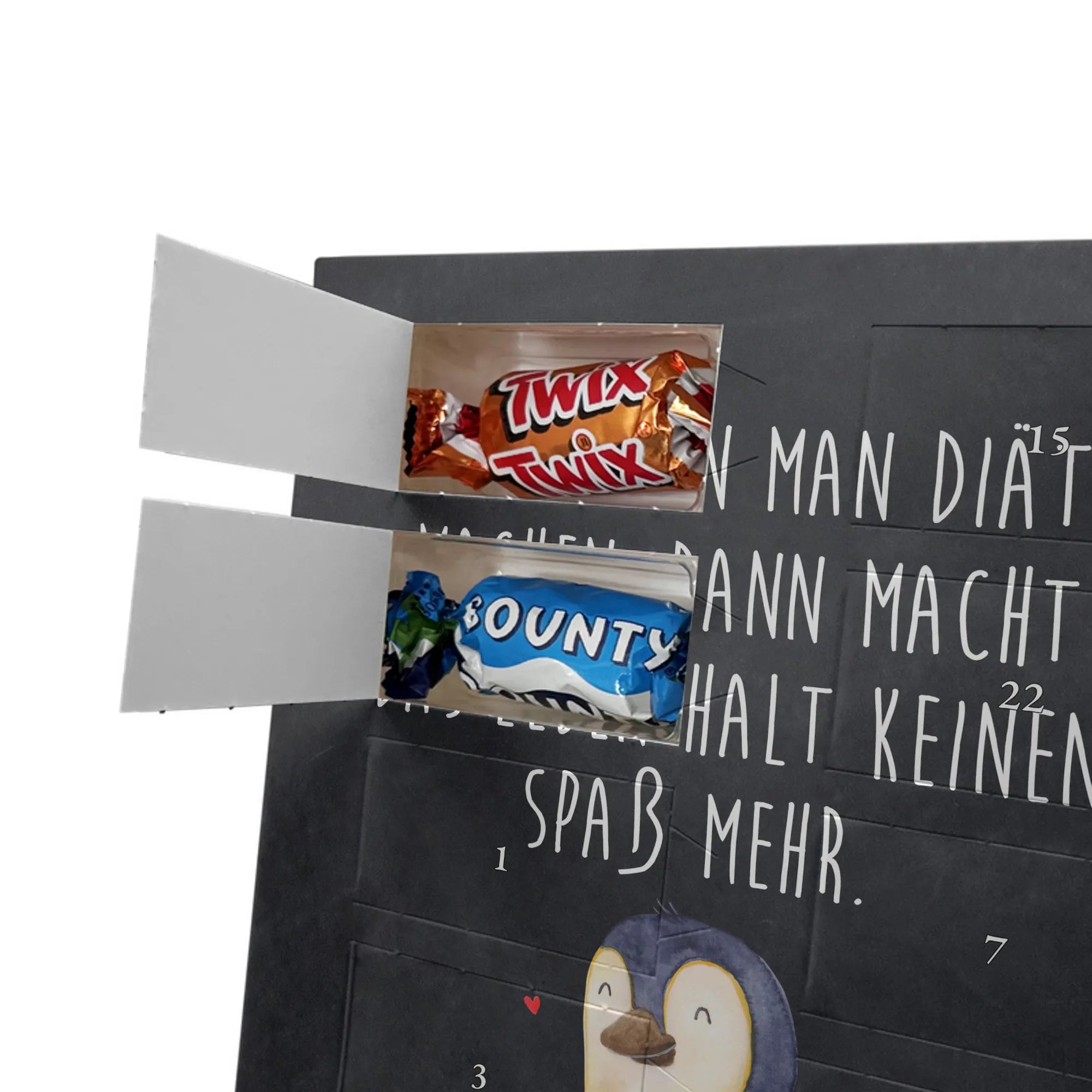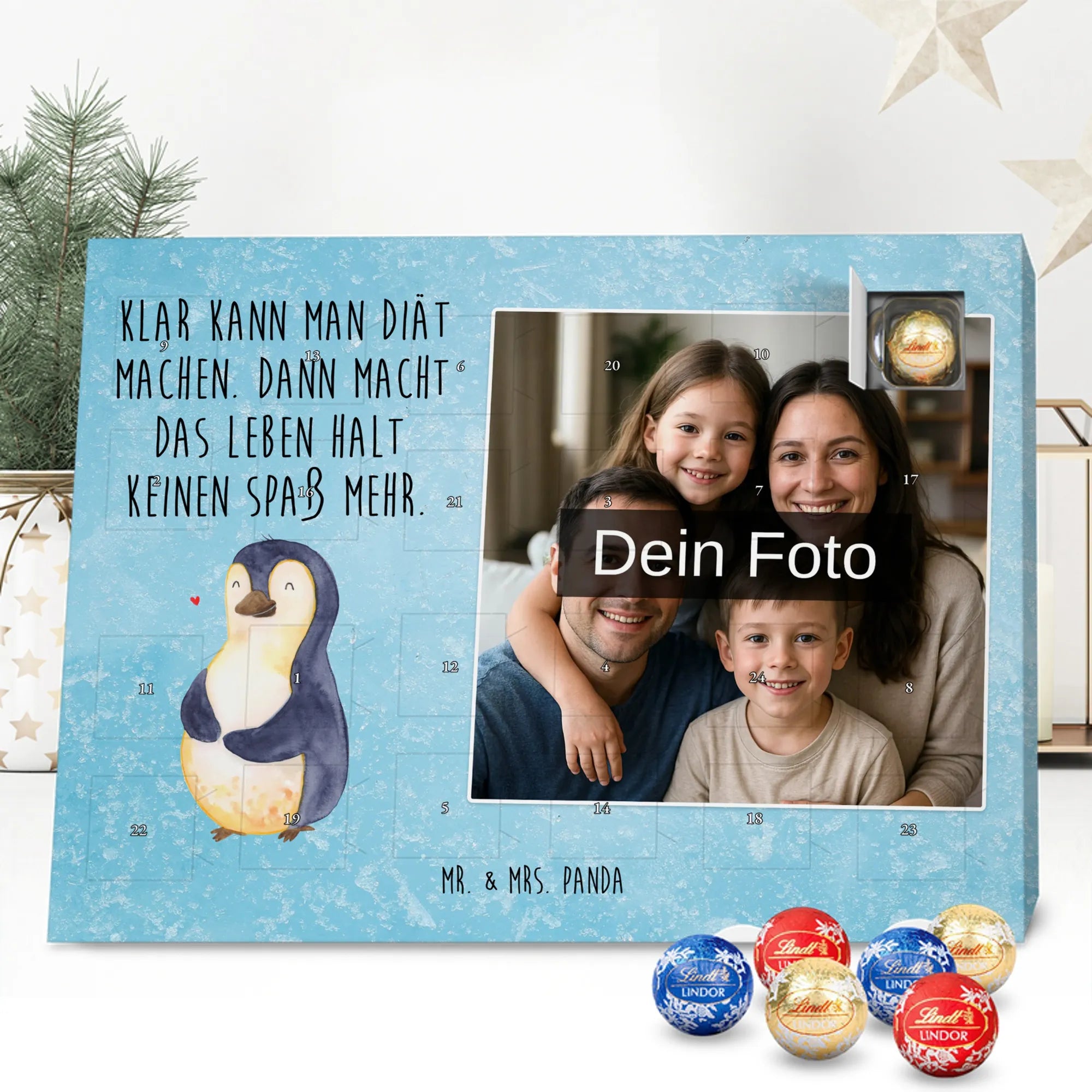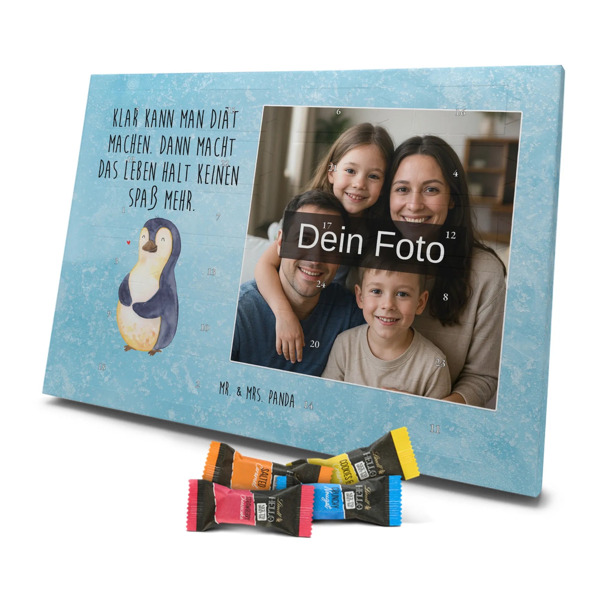 Lustiger Personalisierter Schoko Foto-Adventskalender – das Must-have für eine persönliche Adventszeit von Mr. & Mrs. Panda. Jeder Kalender wird mit unseren charmanten Illustrationen und liebevollen Sprüchen bedruckt, während dein Foto die Vorderseite einzigartig macht. Achte bitte darauf, ein Foto mit guter Qualität und ausreichend hoher Auflösung hochzuladen, damit der Druck gestochen scharf wirkt. Überprüfe den Bildausschnitt, damit wichtige Bereiche nicht verloren gehen. Denk daran, nur Bilder zu verwenden, bei denen du die nötigen Rechte besitzt. Die Verarbeitung ist hochwertig: brillante Druckqualität mit seidenmatter Oberflächenveredelung und bedruckten Seitenflächen. Maße: 325 mm x 225 mm x 27 mm. Du kannst den Kalender aufhängen oder aufstellen – sehr praktisch. Hinweis: Die hochgeladenen Fotos werden nicht nachbearbeitet oder zugeschnitten; Rücknahme bei personalisierten Foto-Artikeln ist ausgeschlossen. Gefüllt ist der Kalender mit Celebrations Schokolade – 24 Stück in 8 verschiedenen Sorten (Maltesers, Mars, Snickers, Twix, Milky Way, Bounty, Galaxy, Galaxy Caramel). Verschenke ein Stück persönlich gestaltete Vorfreude und mache jeden Dezembertag zu etwas Besonderem.