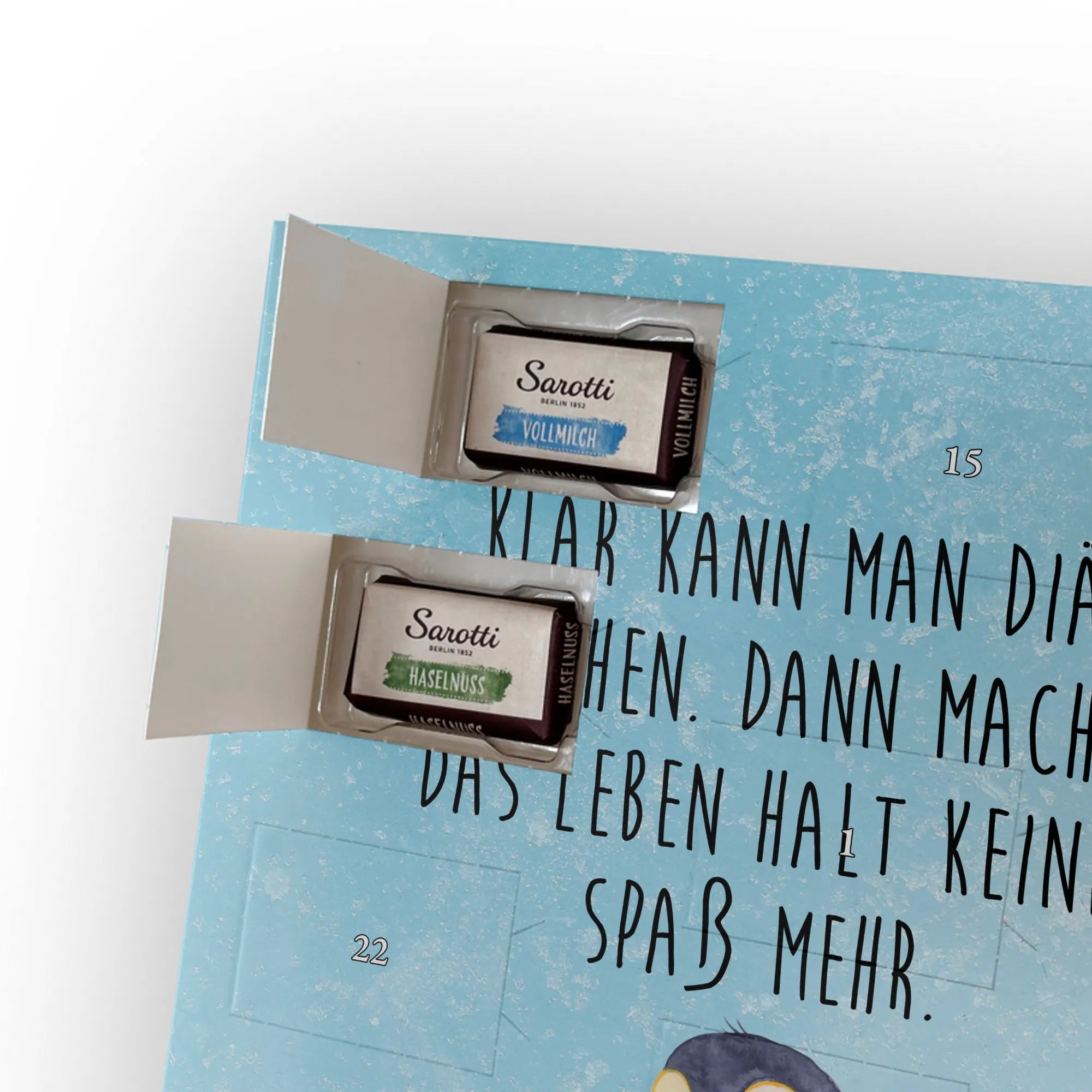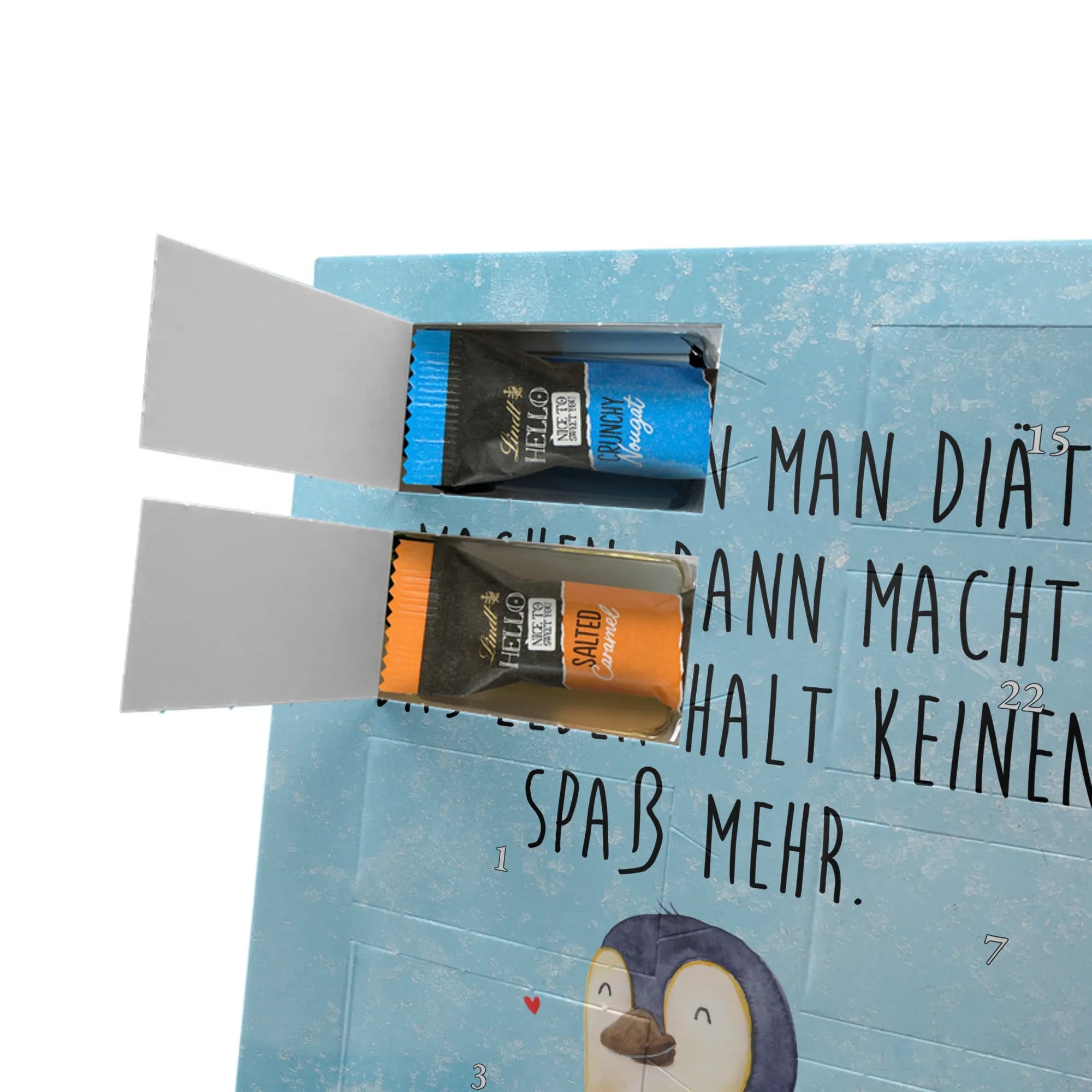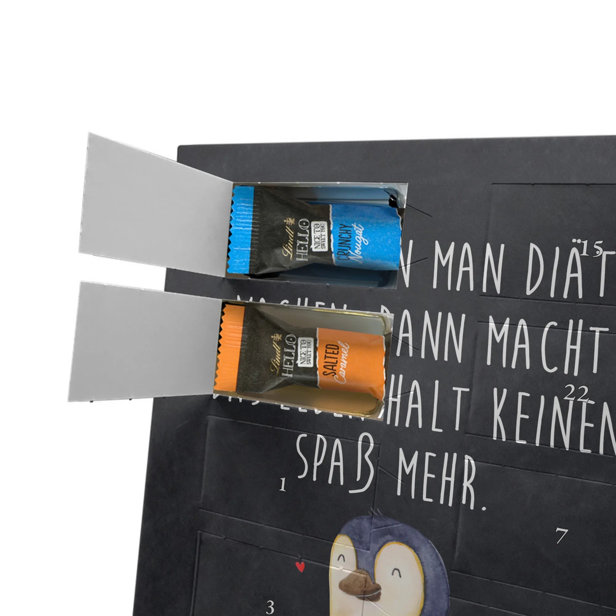 Lustiger Personalisierter Schoko Foto-Adventskalender – das Must-have für eine persönliche Adventszeit von Mr. & Mrs. Panda. Jeder Kalender wird mit unseren charmanten Illustrationen und liebevollen Sprüchen bedruckt, während dein Foto die Vorderseite einzigartig macht. Achte bitte darauf, ein Foto mit guter Qualität und ausreichend hoher Auflösung hochzuladen, damit der Druck gestochen scharf wirkt. Überprüfe den Bildausschnitt, damit wichtige Bereiche nicht verloren gehen. Denk daran, nur Bilder zu verwenden, bei denen du die nötigen Rechte besitzt. Die Verarbeitung ist hochwertig: brillante Druckqualität mit seidenmatter Oberflächenveredelung und bedruckten Seitenflächen. Maße: 325 mm x 225 mm x 27 mm. Du kannst den Kalender aufhängen oder aufstellen – sehr praktisch. Hinweis: Die hochgeladenen Fotos werden nicht nachbearbeitet oder zugeschnitten; Rücknahme bei personalisierten Foto-Artikeln ist ausgeschlossen. Gefüllt ist der Kalender mit Celebrations Schokolade – 24 Stück in 8 verschiedenen Sorten (Maltesers, Mars, Snickers, Twix, Milky Way, Bounty, Galaxy, Galaxy Caramel). Verschenke ein Stück persönlich gestaltete Vorfreude und mache jeden Dezembertag zu etwas Besonderem.
