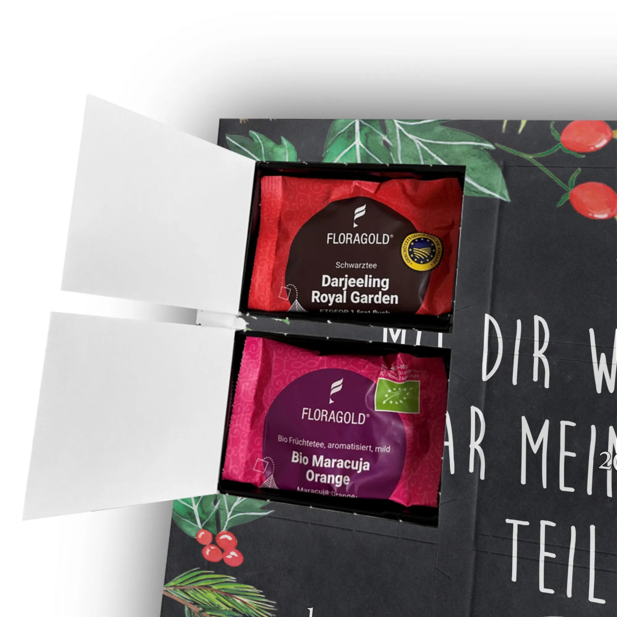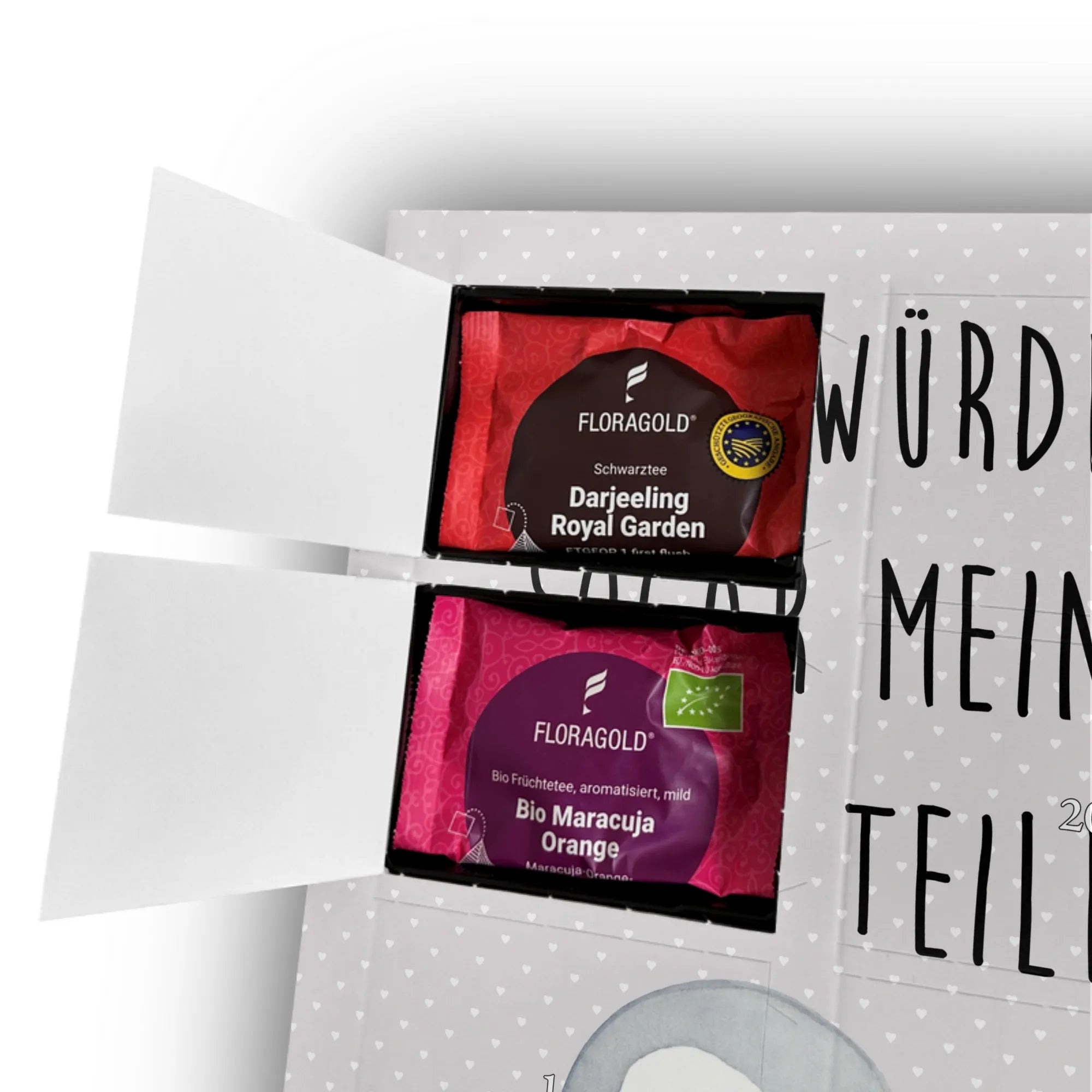 Jeder Kalender ist individuell anpassbar mit deinem eigenen Foto, das einen besonderen Moment zwischen euch festhält. Das hochwertige Material und die brillante Druckqualität machen den Kalender zu einem echten Hingucker. Befüllt mit 24 verschiedenen hochwertigen Teesorten, wird jeder Tag zu einem besonderen Erlebnis. Die Teesorten bieten eine abwechslungsreiche Mischung aus Früchtetee, Schwarztee und Kräutertee, sodass für jeden Geschmack etwas dabei ist.