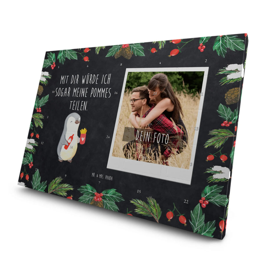 Der personalisierte Tee Foto Adventskalender von Mr. & Mrs. Panda ist das perfekte Geschenk für alle Liebespaare! Dieser besondere Adventskalender verleiht der Vorfreude auf Weihnachten eine ganz persönliche Note. Mit dem zauberhaften Motiv des Pinguins, der liebevoll Pommes mit Ketchup in seinen Flügeln hält, und dem herzlichen Spruch „Mit dir würde ich sogar meine Pommes teilen“ ist dieser Kalender ein echter Liebesbeweis. Ob als Geschenk für den Valentinstag, Jahrestag oder Hochzeitstag - mit diesem Kalender zeigst du deinem Partner, wie viel er dir bedeutet.