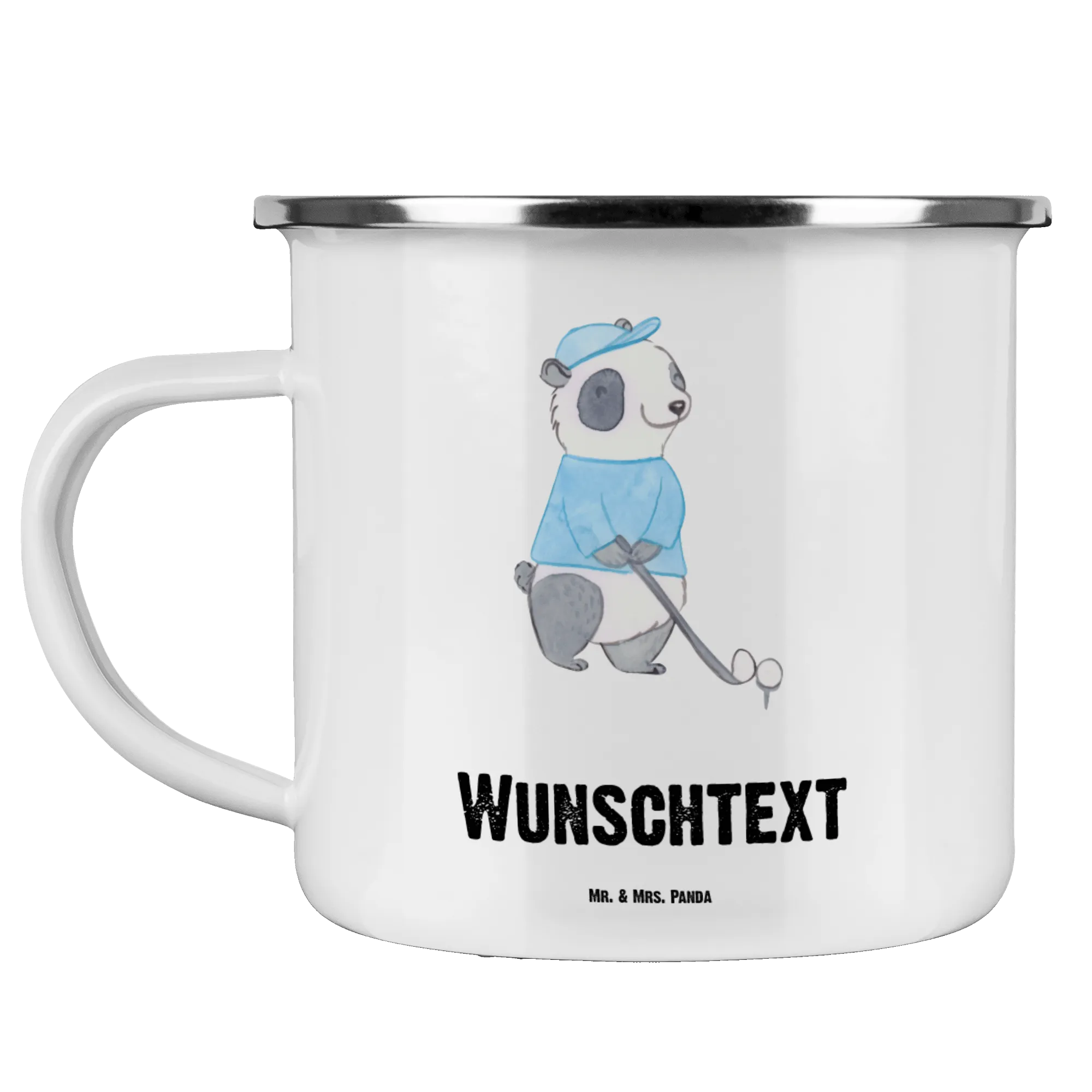 Personalised enamel cup panda golfing
