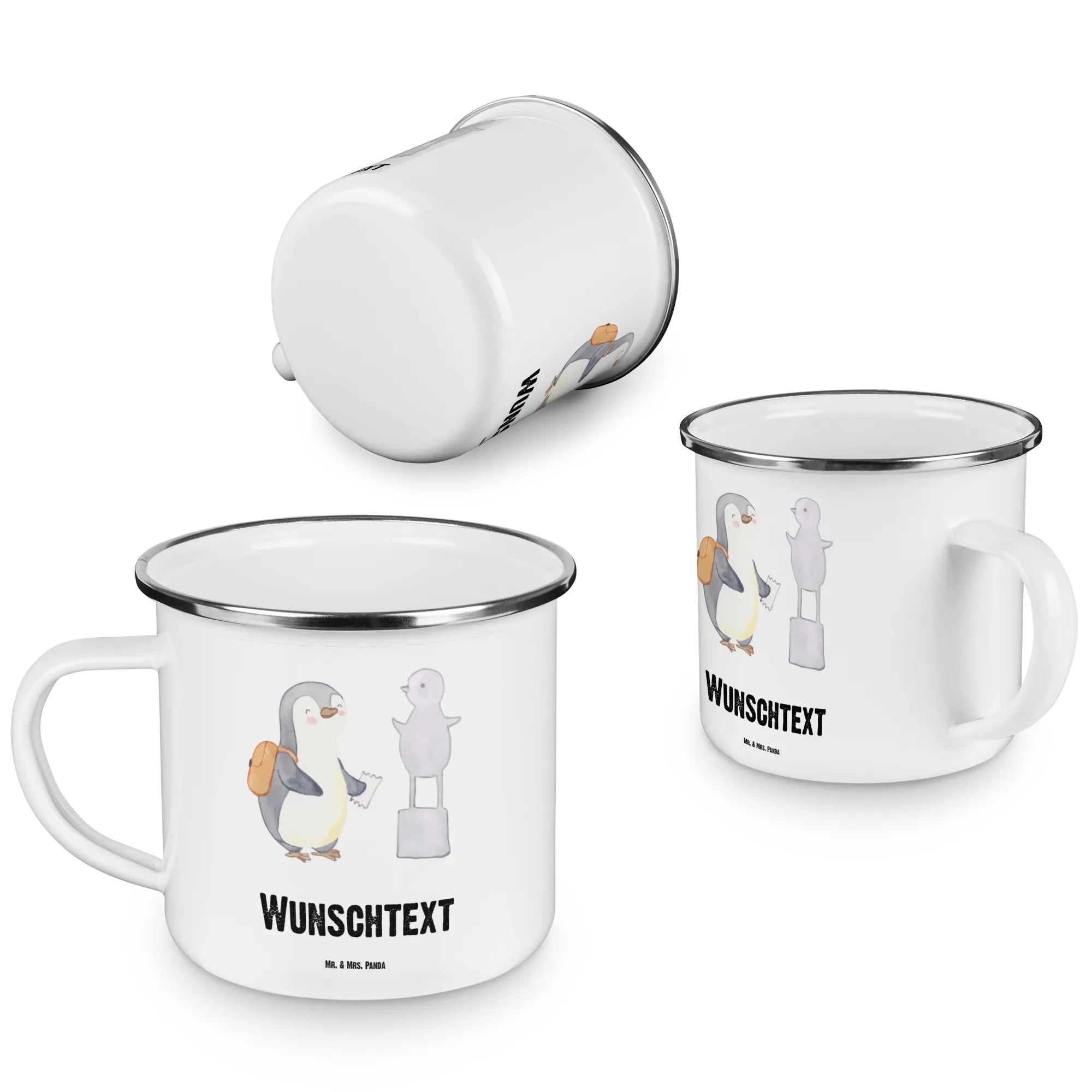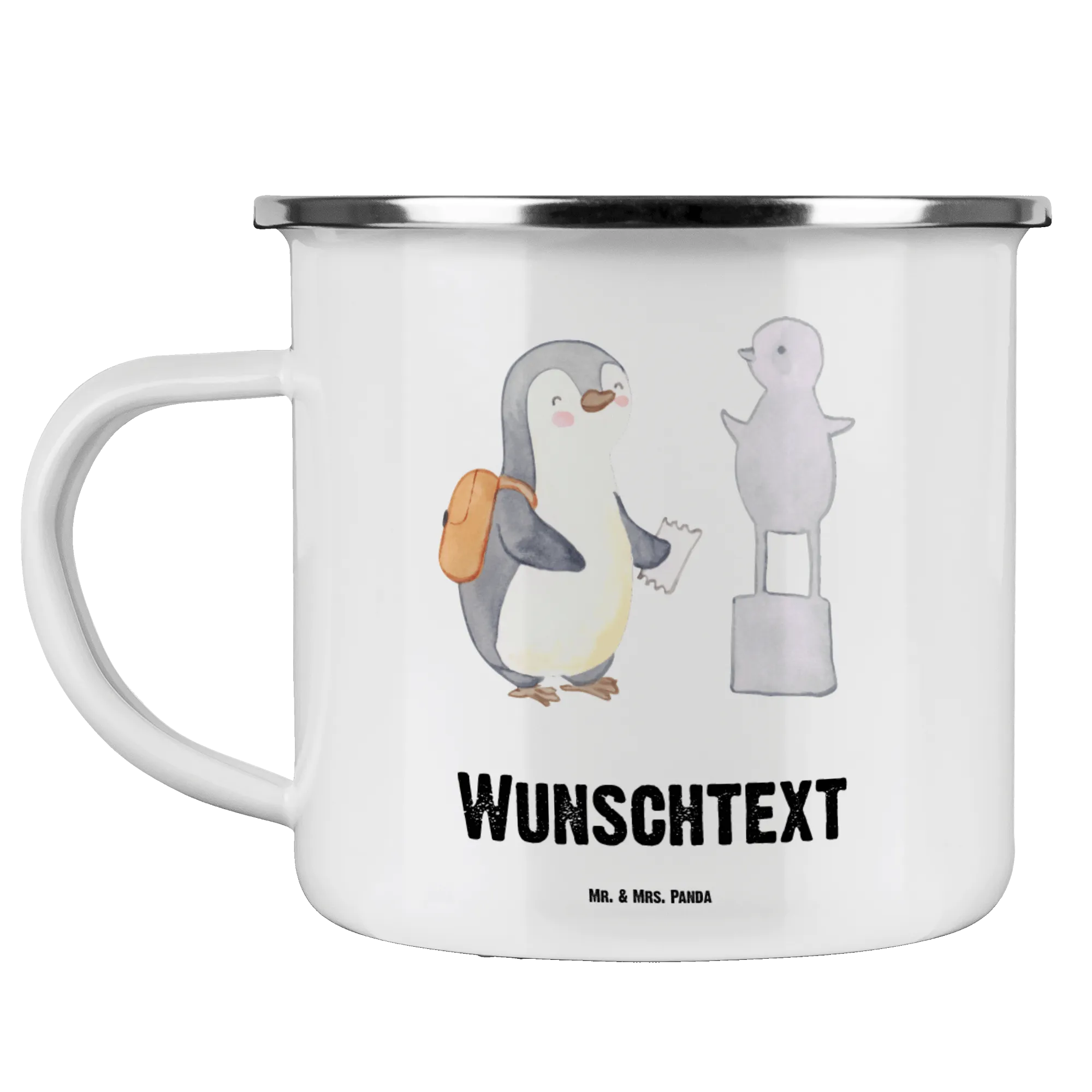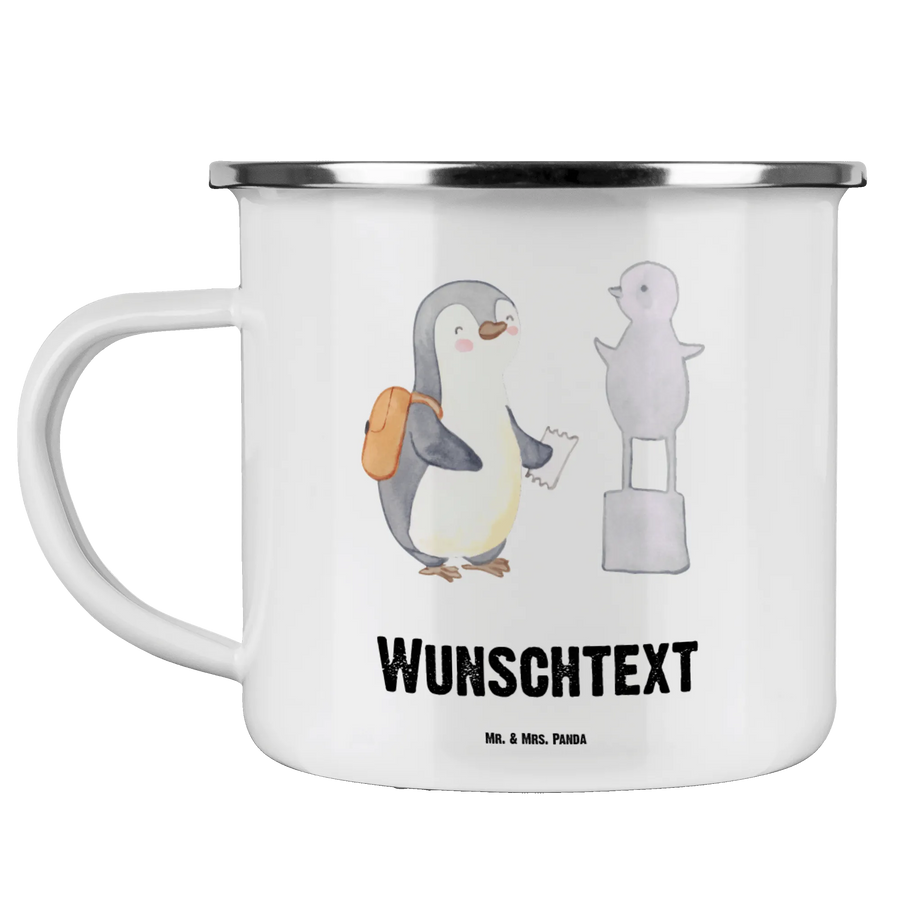 Personalised enamel cup penguin to visit a museum
