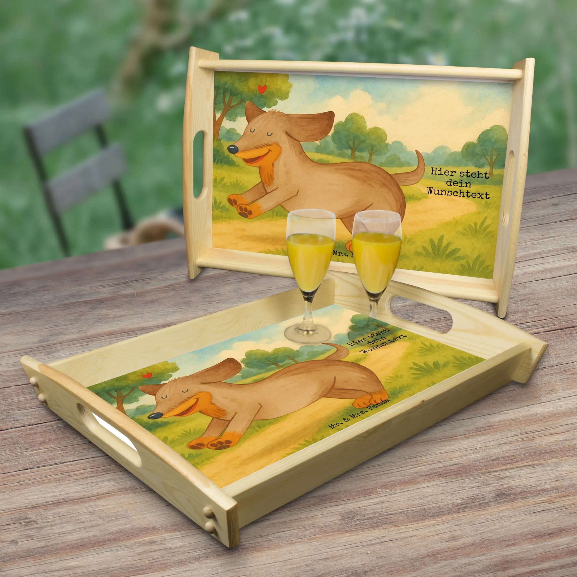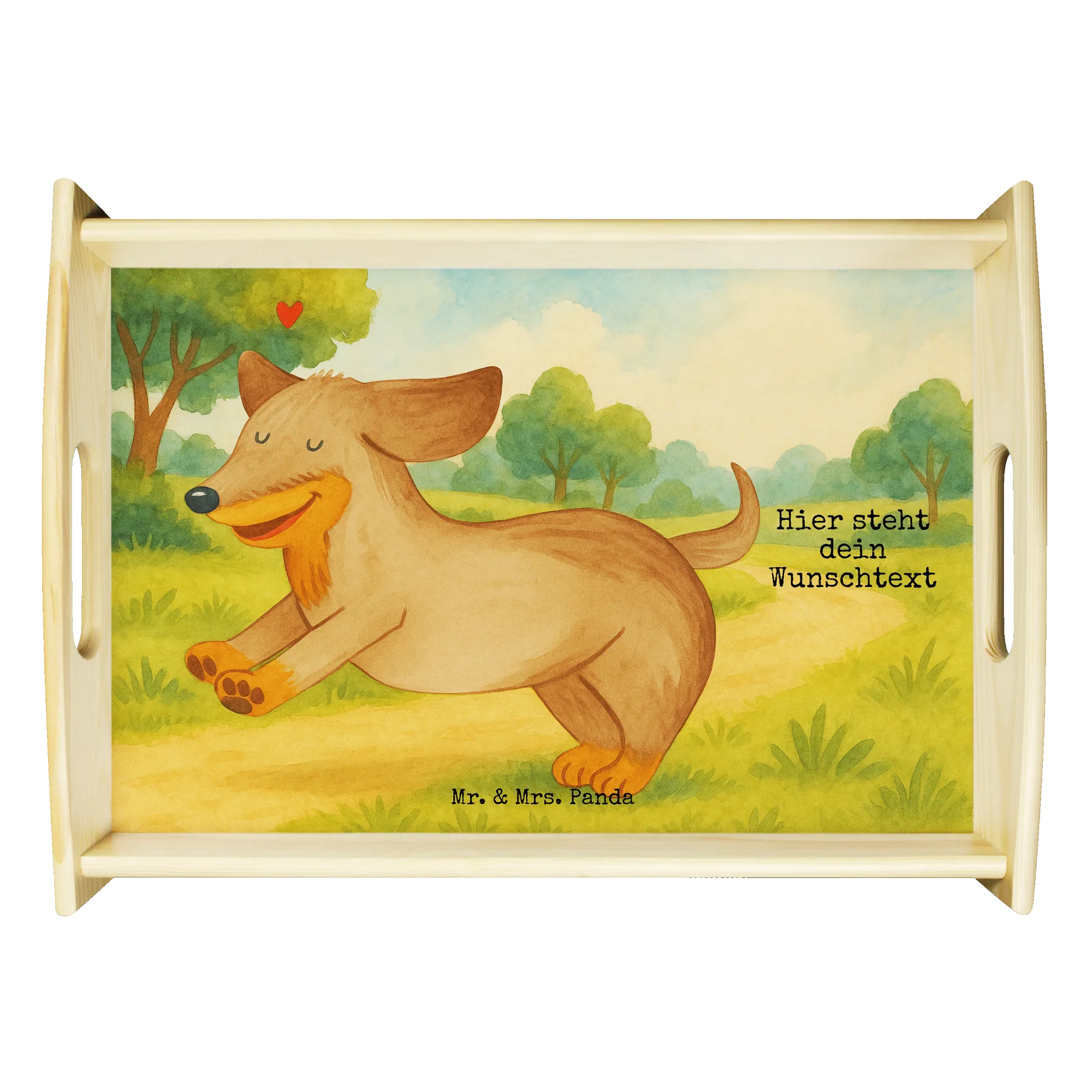 Ein liebevolles Personalisiertes Serviertablett aus der Hunde Kollektion von Mr. & Mrs. Panda: Unser fröhlicher Dackel „Hund Dackel fröhlich“ hüpft über das Tablett und wird begleitet vom schönen Spruch „Tage mit dir sind meine absoluten Lieblingstage.“ Dieses Personalisiertes Tablett kannst du mit einem Wunschnamen personalisieren und schaffst so ein echtes Unikat – ideal als Geschenk für Hundebesitzer und Tierfreunde.