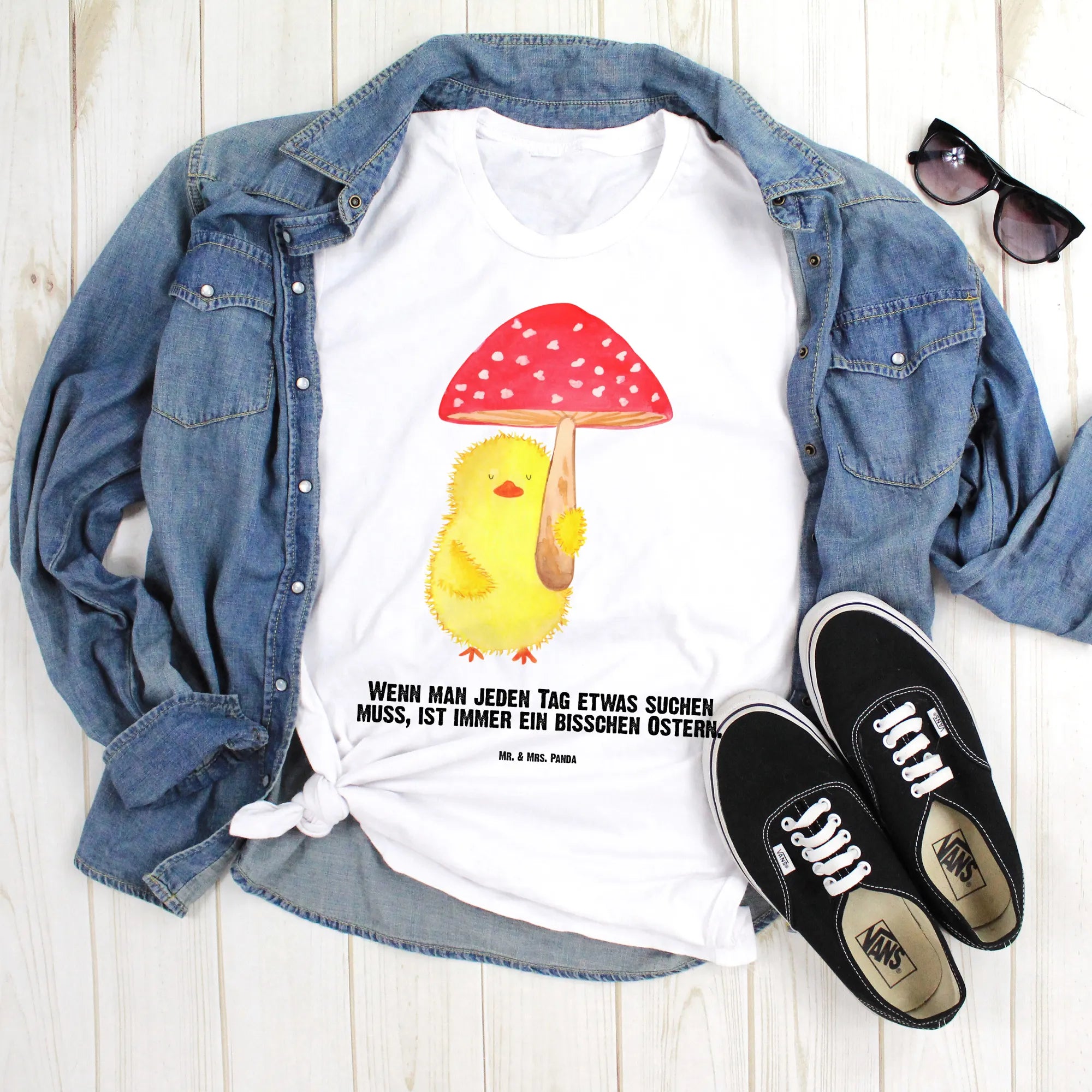 Embrace the delightful essence of Easter with this charming motif where a cheerful little chick holds a whimsical fly agaric toadstool as if it were an umbrella! It's not just a cute image; it encapsulates the spirit of joy and the luck that comes with the season. The saying, 'Wenn man jeden Tag etwas suchen muss, ist immer ein bisschen Ostern,' beautifully highlights that every day is an opportunity to find happiness. This endearing chick reminds us to keep seeking out the magic in life, whether through springtime blooms or the laughter of friends. Celebrate and let this design bring a splash of alegría to your world!