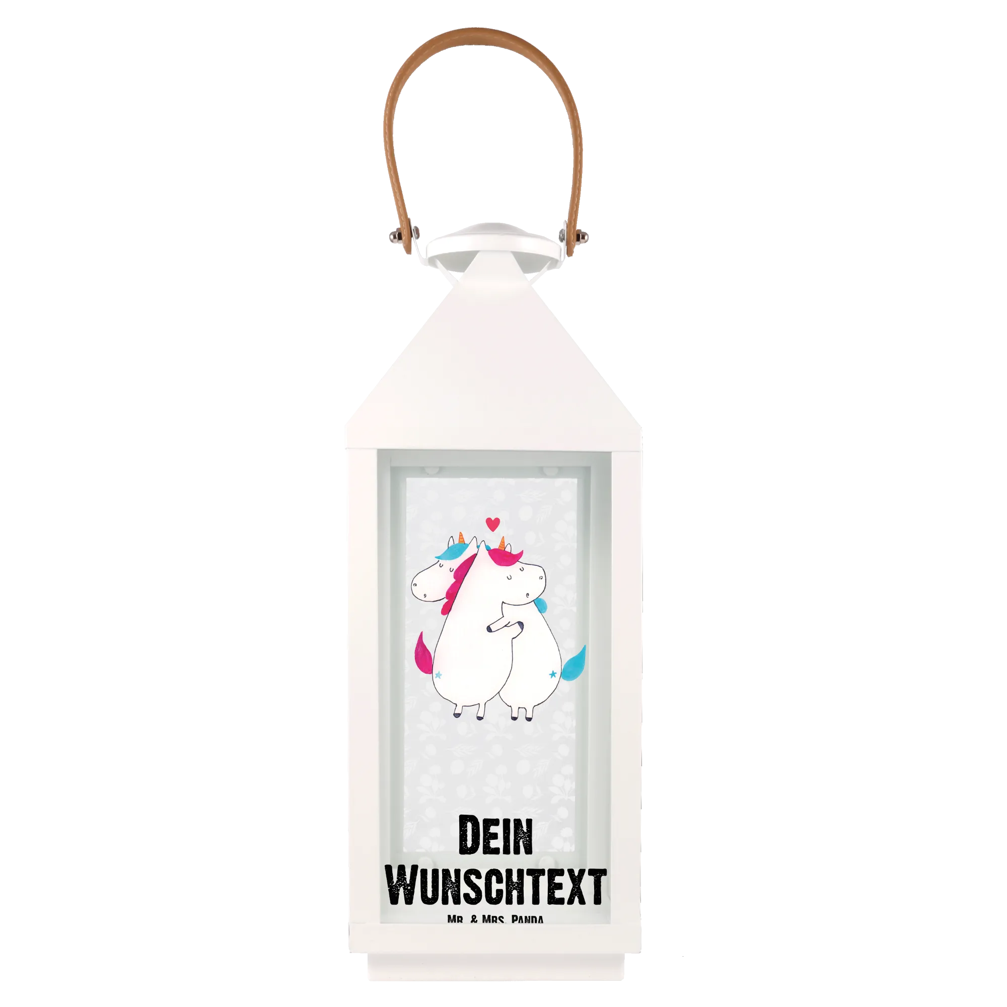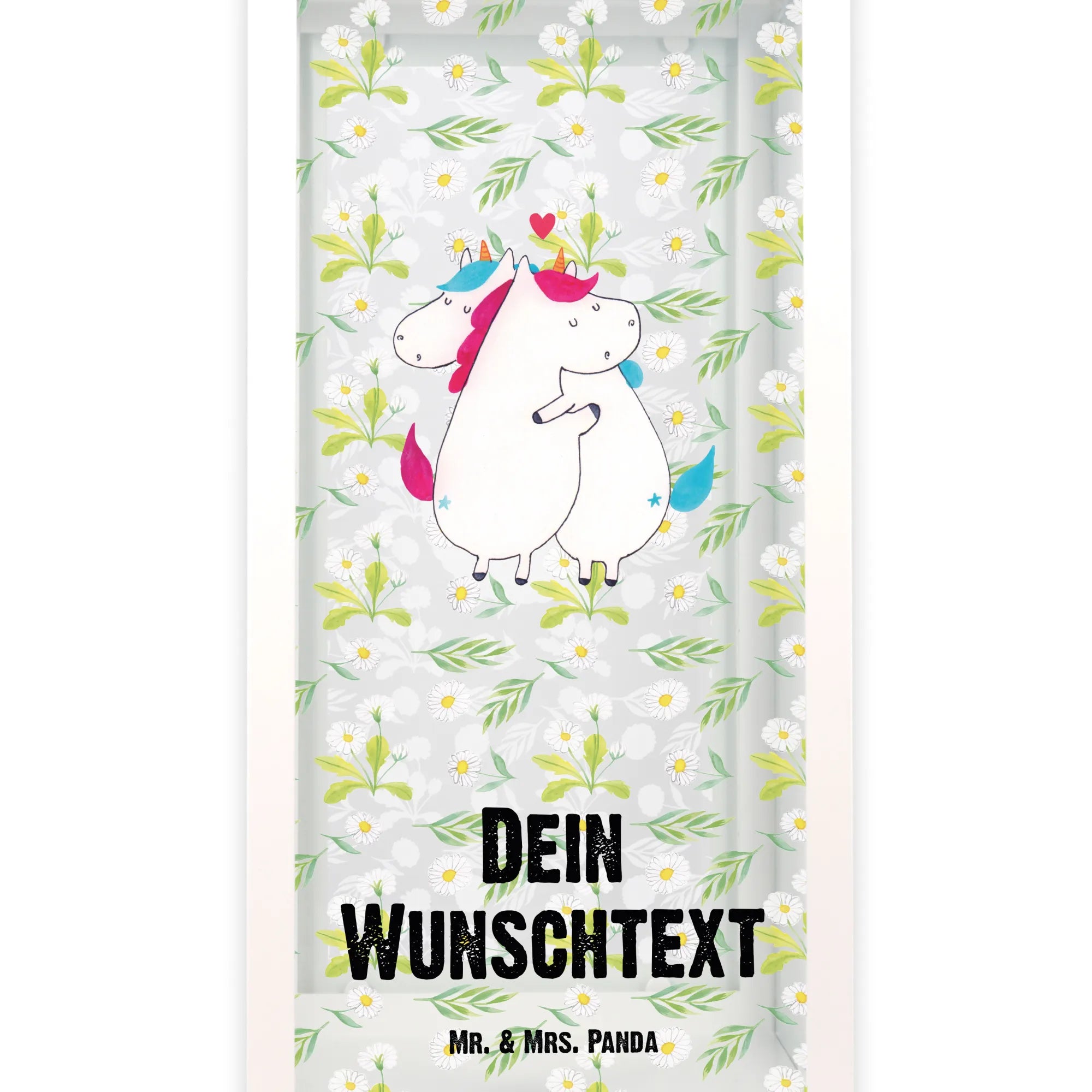 Die personalisierte Deko Laterne Einhorn mit Mitteilung von Mr. & Mrs. Panda ist das perfekte Geschenk für all diejenigen, die die zauberhafte Welt der Einhörner lieben! Diese wunderschöne und einzigartige Laterne sorgt nicht nur für romantisches Licht in Eurem Garten, auf der Terrasse oder dem Balkon, sondern bringt auch eine wichtige Nachricht: "Wichtige Mitteilung: du bist wundervoll!" Wenn Du auf der Suche nach einem ganz besonderen Geschenk für Deinen Partner bist, an Valentinstag oder einfach nur, um deine Liebe zu zeigen, dann ist diese Laterne genau das Richtige. Der entzückende Slogan wird begleitet von zwei niedlichen Einhörnern, die sich liebevoll umarmen. Wer könnte besser transportieren, wie besonders Deine Liebsten sind?