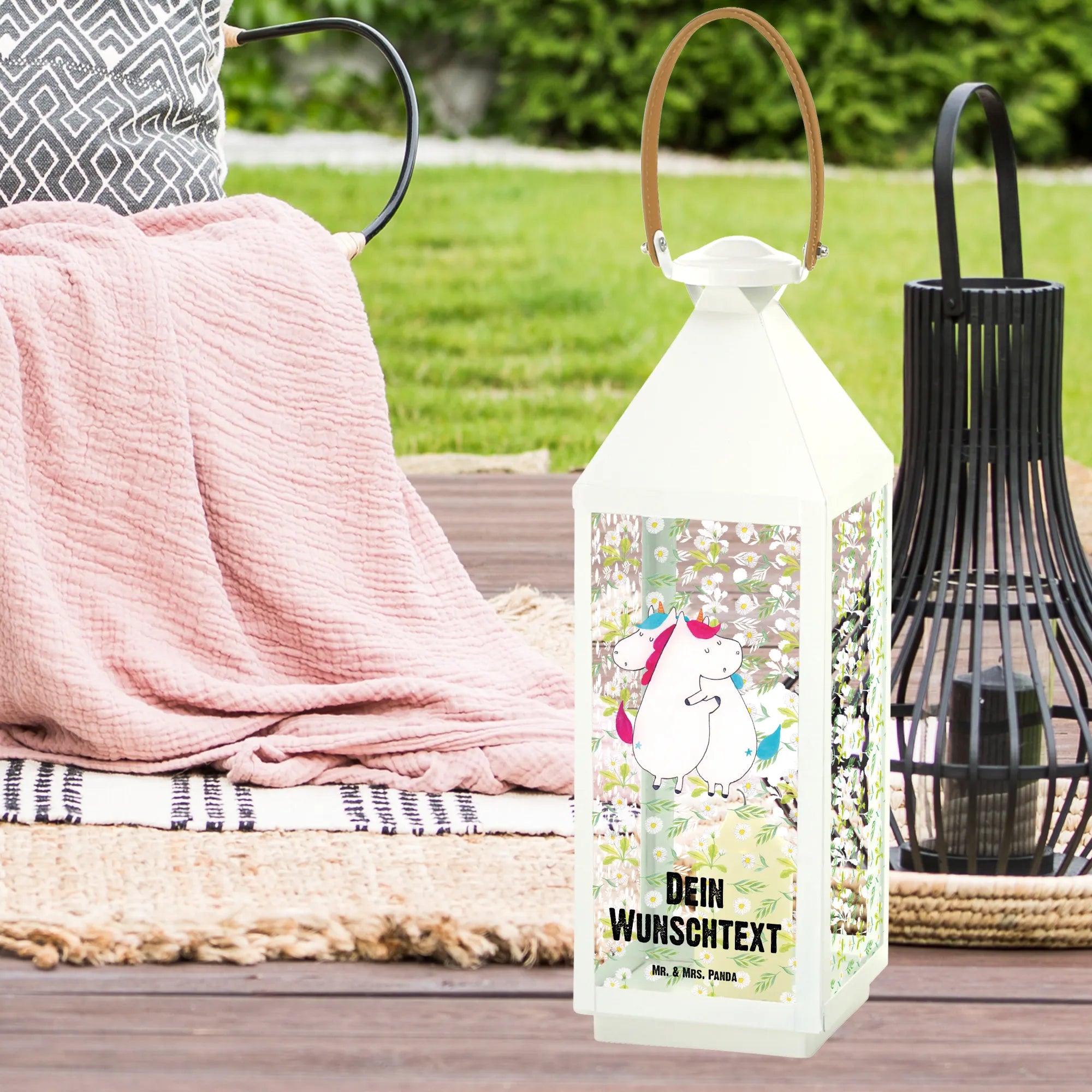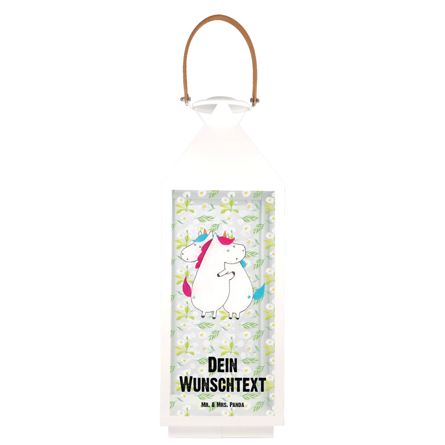 Die personalisierte Deko Laterne mit dem zauberhaften Motiv der umarmenden Einhörner von Mr. & Mrs. Panda ist das perfekte Geschenk für deine Schwester oder beste Freundin.