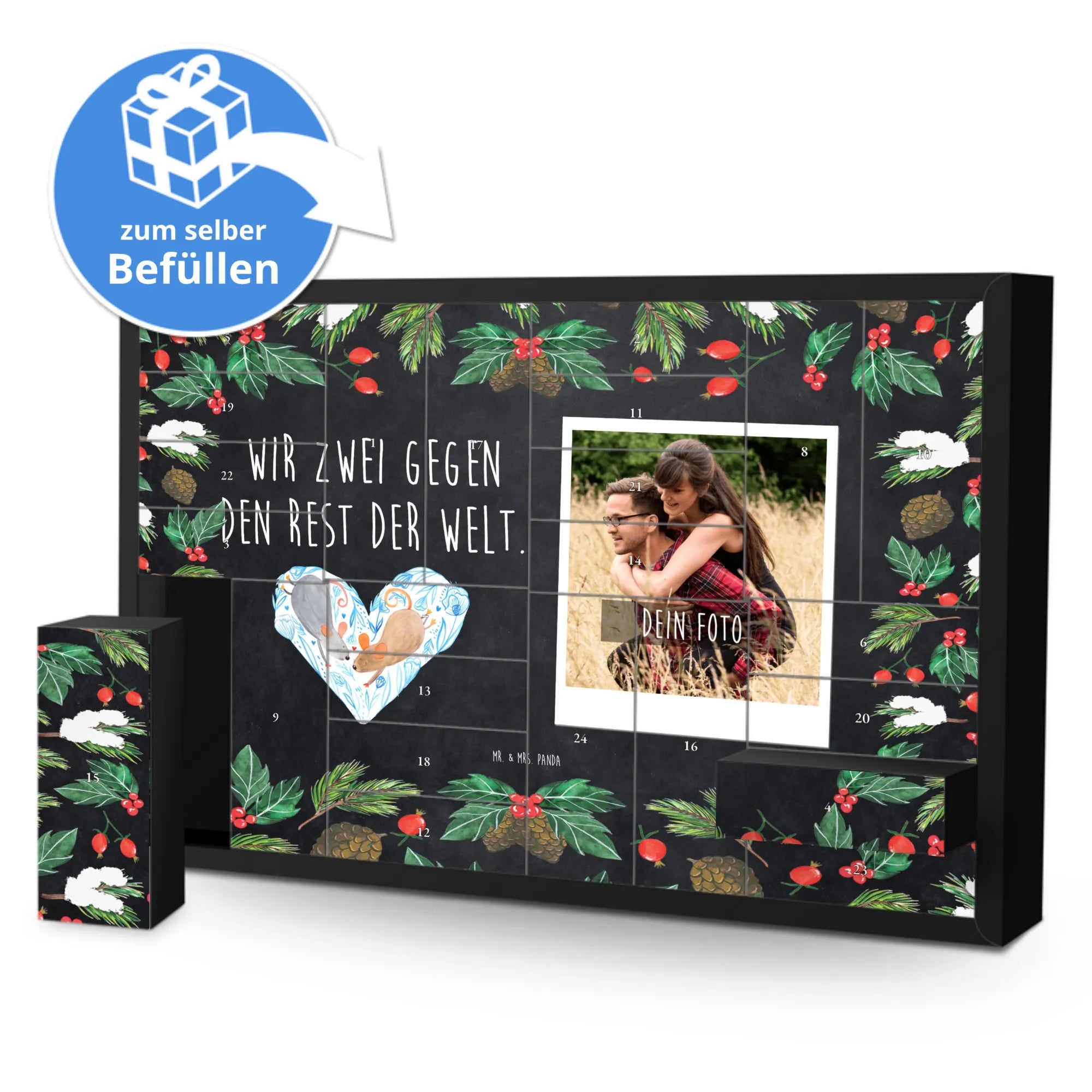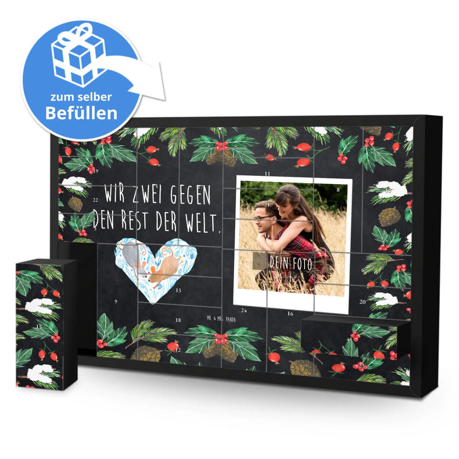 Foto Adventskalender personalisiert von Mr. & Mrs. Panda – mach Weihnachten persönlich und liebevoll! Dieser Adventskalender kombiniert die herzerwärmenden Sprüche und Motive von Mr. & Mrs. Panda mit deinem individuellen Foto auf der Vorderseite. Für ein optimales Druckergebnis lade bitte ein Foto in guter, hoher Auflösung hoch und achte auf den richtigen Bildausschnitt, damit nichts Wichtiges verloren geht. Nutze nur lizenzfreie oder von dir genehmigte Fotos. Die Front ist mit einer zauberhaften Mrs. Panda Zeichnung verziert, gedruckt auf einer seidenmatten Oberfläche in brillanter Qualität. Der Kalender besteht aus stabilem Adventskalender-Karton, bietet 24 Schachteln zum Selbstbefüllen und enthält eine Aufstellvorrichtung. Wichtig: Der Artikel wird ohne Füllung geliefert. Beachte außerdem, dass die Fotos nicht nachbearbeitet oder zugeschnitten werden – personalisierte Foto-Artikel sind vom Umtausch ausgeschlossen. Maße: 619 mm Breite • 405 mm Höhe • 50 mm Tiefe. Verschenke jeden Tag ein kleines Glück mit einem persönlichen Touch.