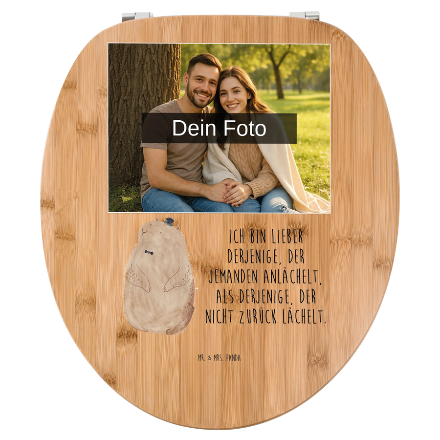 Mach dein Badezimmer zu einem besonderen Ort mit unserem personalisierten Foto WC Sitz Motiv! Der Sitz hat die Maße von 430 mm x 370 mm x 50 mm und ist wahlweise aus hochwertigem Bambus Holz (braun) oder robustem MDF Holz (weiß) gefertigt. Dieser liebevoll gestaltete Toilettensitz wird mit süßen Motiven und zauberhaften Sprüchen von Mr. & Mrs. Panda bedruckt. Lass deiner Kreativität freien Lauf und personalisiere ihn mit deinem eigenen Wunschfoto! Achte darauf, dass das hochgeladene Motiv hochauflösend ist, damit der Druck klar und lebendig wird. Denk daran, den richtigen Bildausschnitt zu wählen, damit keine wichtigen Details verloren gehen. Dieser WC Sitz passt auf alle Euro-WC-Becken und ist mit einem einfachen Montageset ausgestattet. Er bietet nicht nur hohen Sitzkomfort, sondern sorgt dank seiner speziellen Eigenschaften für ein angenehmes Sitzgefühl, selbst an kalten Tagen. Mit einem süßen Motiv bringst du mehr Lebensfreude in dein Badezimmer. Pflege dein neues Schmuckstück ganz einfach mit einem feuchten Tuch und handelsüblicher Seife, ohne aggressive Putzmittel. Der hochqualitative UV-Druck sorgt dafür, dass das Motiv lange strahlend bleibt. Hol dir jetzt diesen besonderen Toilettensitz und mach dein Bad einzigartig!