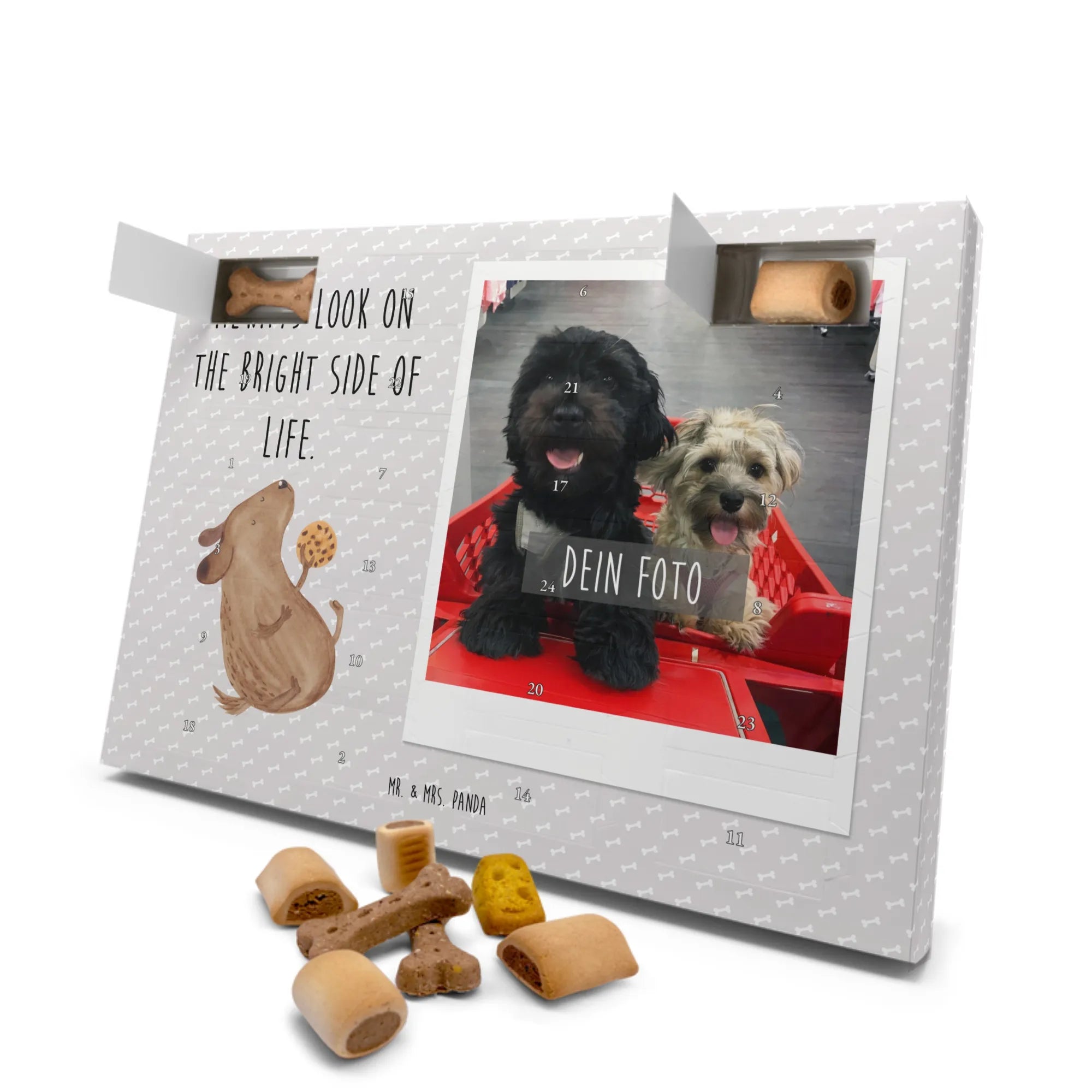 Personalisierter Foto Adventskalender für Hunde von Mr. & Mrs. Panda – individuell, liebevoll und hochwertig. Dieser Adventskalender ist mit unseren typischen Panda-Motiven und kleinen Sprüchen bedruckt und setzt dein Lieblingsfoto besonders schön in Szene. Denk daran, ein Foto mit hoher Auflösung hochzuladen und den Bildausschnitt so zu wählen, dass alle wichtigen Details sichtbar bleiben. Nutze nur Bilder, bei denen du die Rechte besitzt. Die seidenmatte Veredelung sorgt für einen edlen Look, die Seitenflächen sind ebenfalls bedruckt. Gefüllt ist der Kalender mit 24 luftigen Hundekuchen in den Sorten Beef Cake Mix, Mini Knabberknochen, Käse Snack und Panino Röllchen – ohne Konservierungsstoffe. Zutaten: Getreide, Glucose, Fleisch und tierische Nebenerzeugnisse, Öle und Fette, Mineralstoffe. Maße: 325 mm x 225 mm x 27 mm. Der Kalender lässt sich aufstellen oder aufhängen und ist damit flexibel in der Dekoration. Bitte beachte: Fotos werden nicht von uns nachbearbeitet oder zugeschnitten; personalisierte Foto-Produkte sind vom Widerruf ausgeschlossen. Verschenke Freude, die von Herzen kommt – für dich und deinen Liebling!