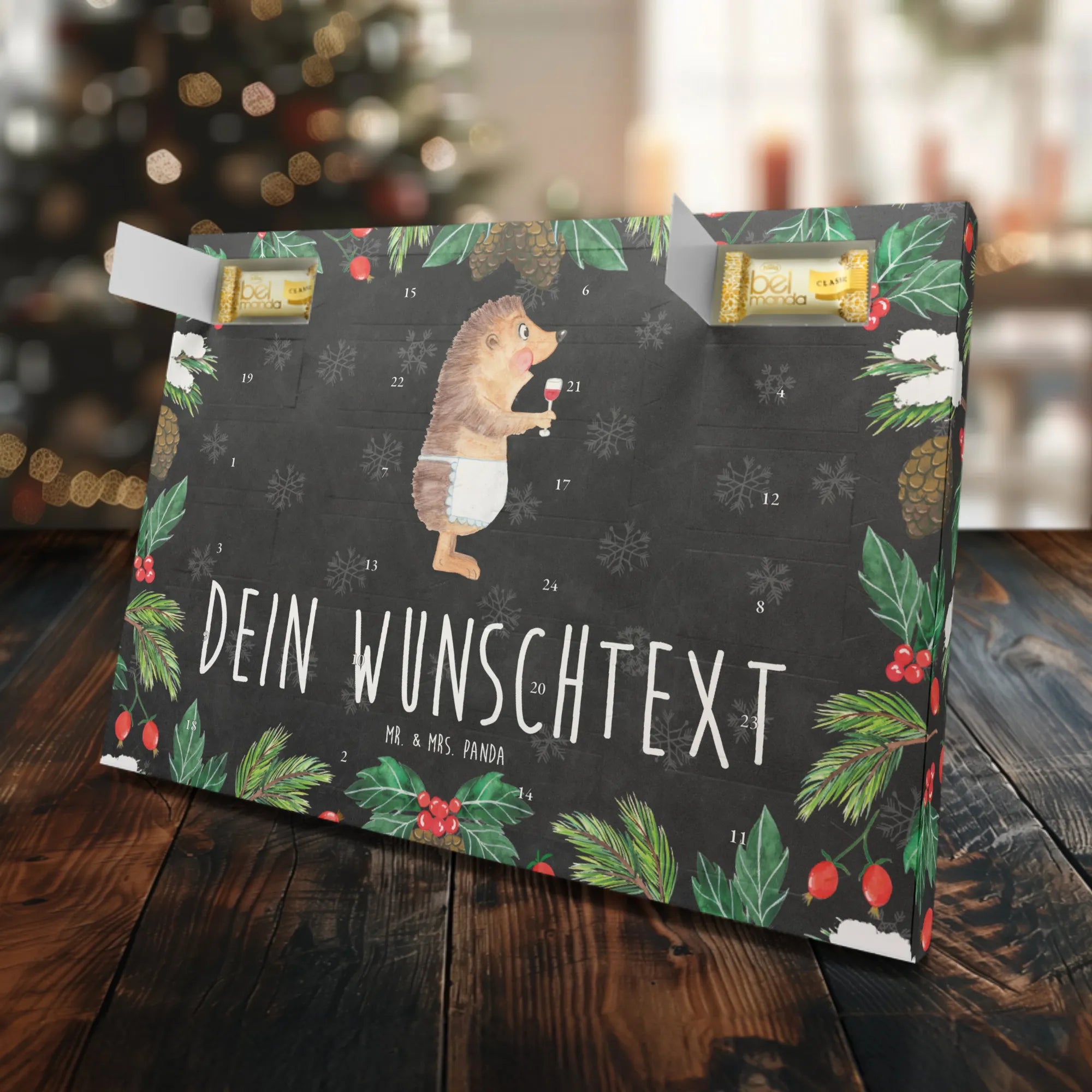 Der personalisierte Marzipan Adventskalender "Igel mit Wein" von Mr. & Mrs. Panda ist das perfekte Geschenk für alle Weinliebhaber, die auch die süßen Seiten des Lebens schätzen! Mit seinem niedlichen Igel-Design, der aus einem Rotweinglas schlürft, bringt dieser Adventskalender nicht nur gute Laune, sondern auch den Genuss von zartem Edelmarzipan in dein Zuhause.