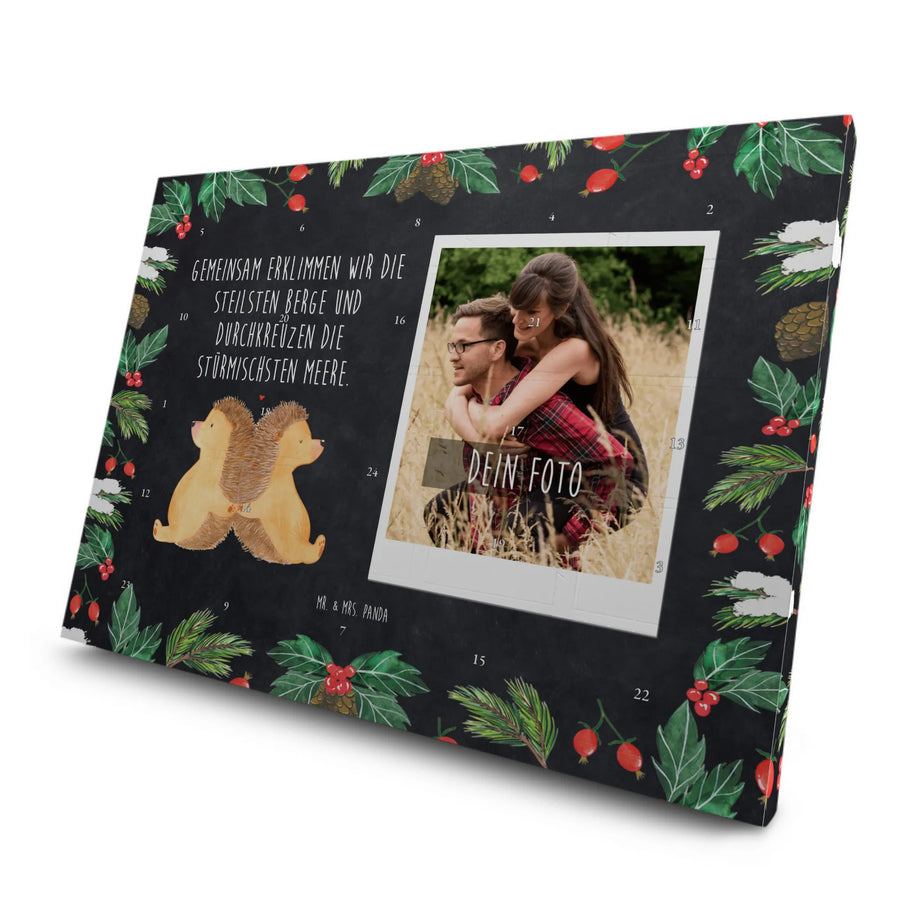 Der personalisierte Tee Foto Adventskalender mit dem zauberhaften Motiv "Igel händchenhaltend" aus der Kollektion Liebe von Mr. & Mrs. Panda ist das perfekte Geschenk für alle Verliebten! Die kleinen, niedlichen Igelchen sitzen rücken an rücken und symbolisieren die innige Verbundenheit zweier Menschen. Zwischen ihnen schwebt ein rotes Herz, das für die Liebe und Zuneigung steht, die sie füreinander empfinden.