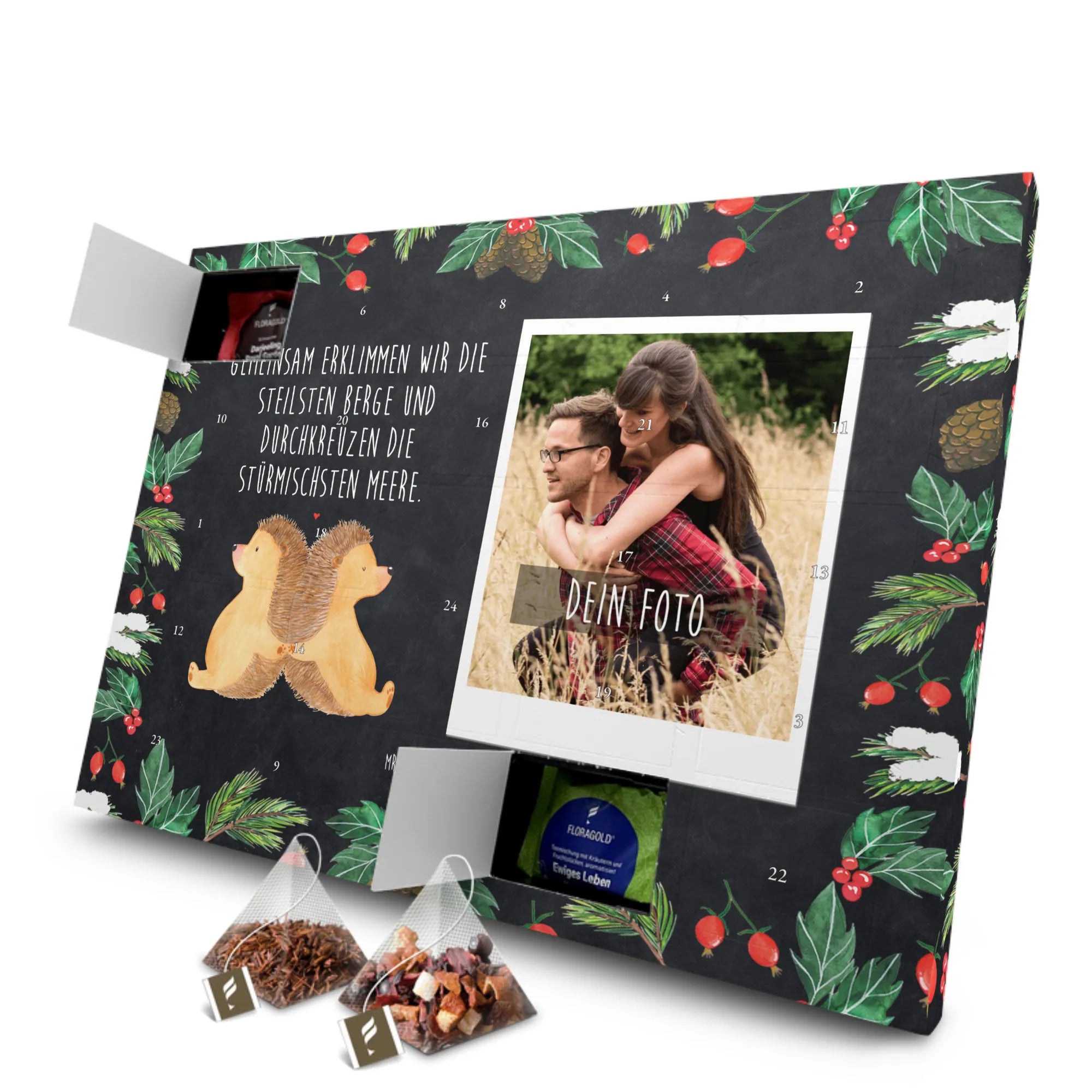 Der personalisierte Tee Foto Adventskalender mit dem zauberhaften Motiv der händchenhaltenden Igel ist das perfekte Geschenk für alle Verliebten und diejenigen, die die kleinen Freuden des Lebens schätzen. Dieser Adventskalender bringt nicht nur eine festliche Stimmung in die kalte Jahreszeit, sondern ist gleichzeitig ein wunderbarer Liebesbeweis für Deinen Lieblingsmenschen.