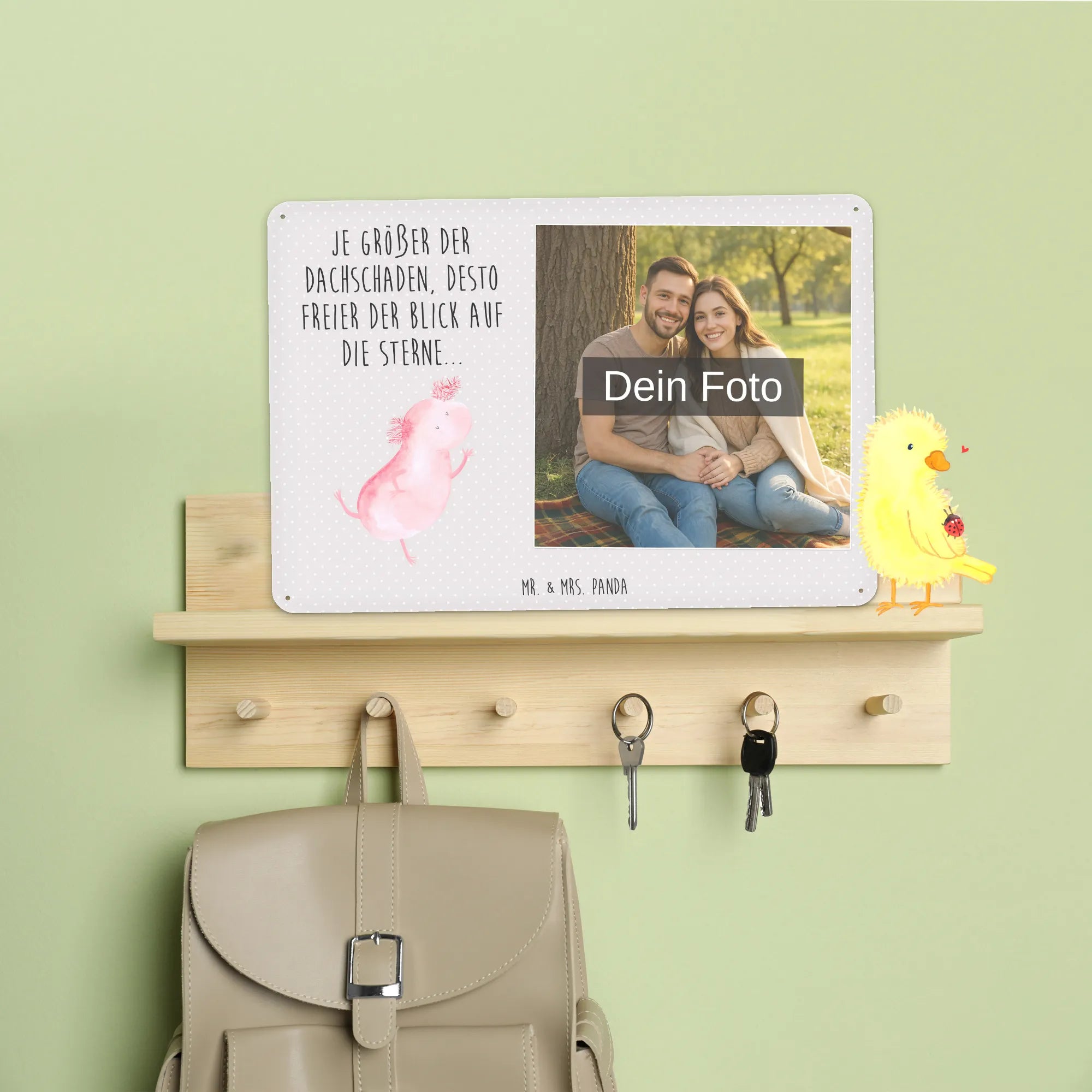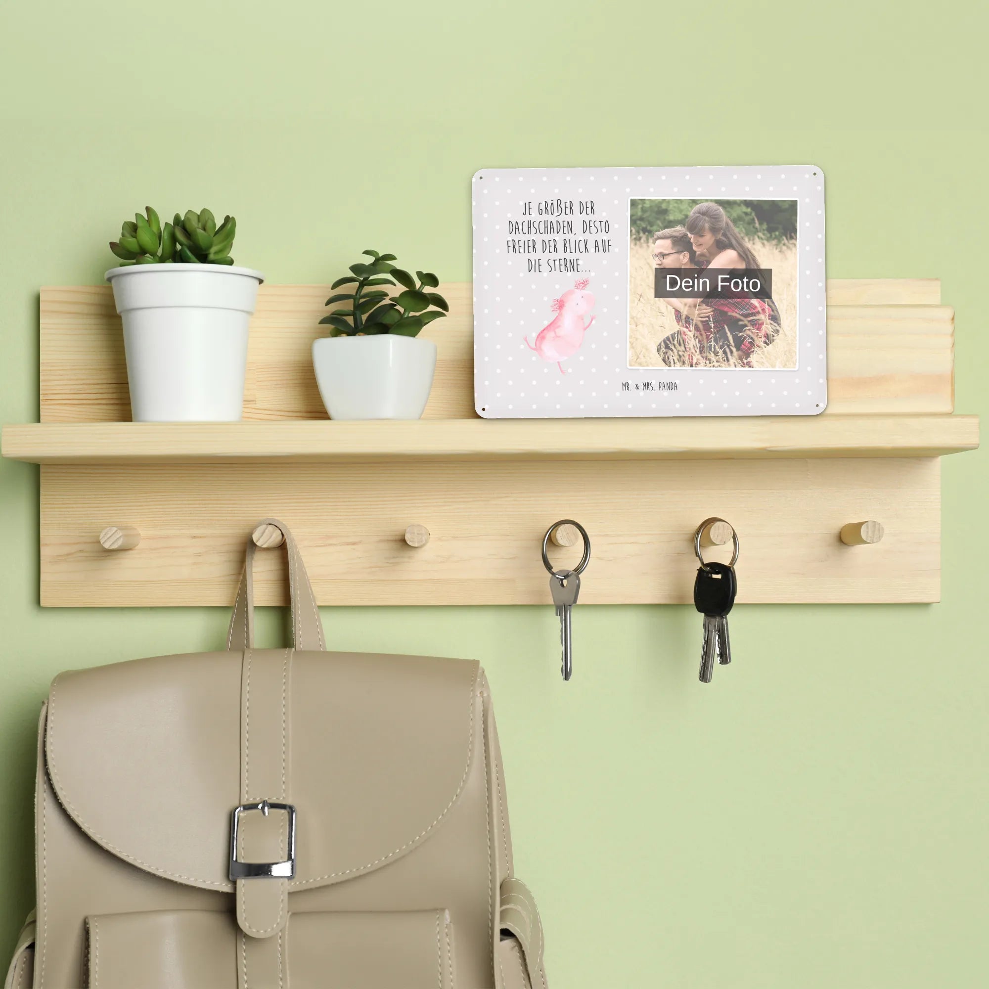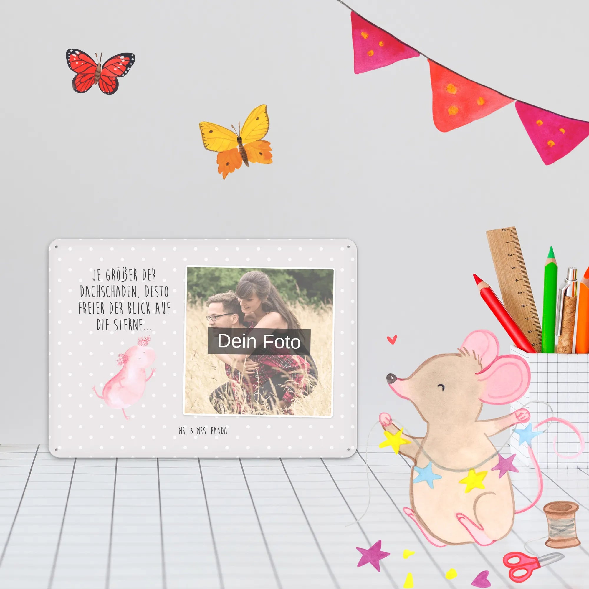 Blechschild mit eigenem Foto personalisiert – liebevoll gestaltet von Mr. & Mrs. Panda. Dieses edle Schild wird mit deinem Foto und unseren niedlichen Illustrationen bedruckt, sodass ein individuelles Dekostück entsteht. Achte unbedingt auf gute Bildqualität und geeigneten Bildausschnitt, damit das Motiv klar und harmonisch wirkt. Bitte nur eigene Bilder oder solche mit Nutzungsrecht hochladen. Gefertigt aus hochwertigem Stahlblech ohne Wölbung mit seidenmatter Oberfläche, bietet das Schild eine edle Optik. Maße: 70 mm x 297 mm x 210 mm. Der Druck ist langlebig und hochwertig verarbeitet. Für sicheren Halt gibt es vier Bohrungen, umgefalzte Kanten und abgerundete Ecken. Ideal für Innenräume, ob an der Tür, im Eingangsbereich oder an der Wohnzimmerwand. Pflegeleicht: einfach mit einem feuchten Tuch abwischen. In mehreren Größen erhältlich, so findest du garantiert die passende Variante. Verschenke Erinnerungen oder gestalte dein Zuhause persönlich — mit dem Blechschild mit eigenem Foto personalisiert von Mr. & Mrs. Panda wird jeder Raum ein Stückchen liebevoller.