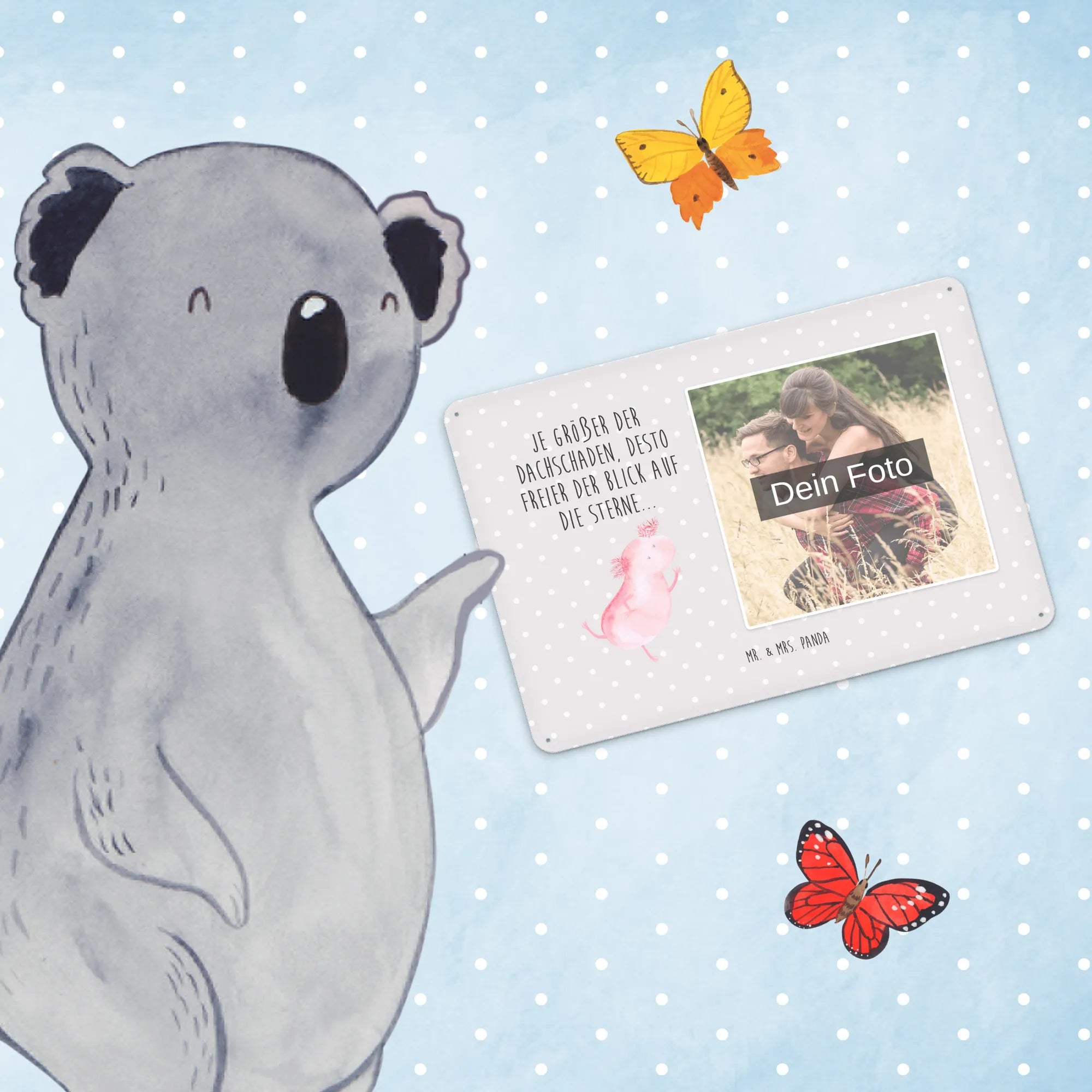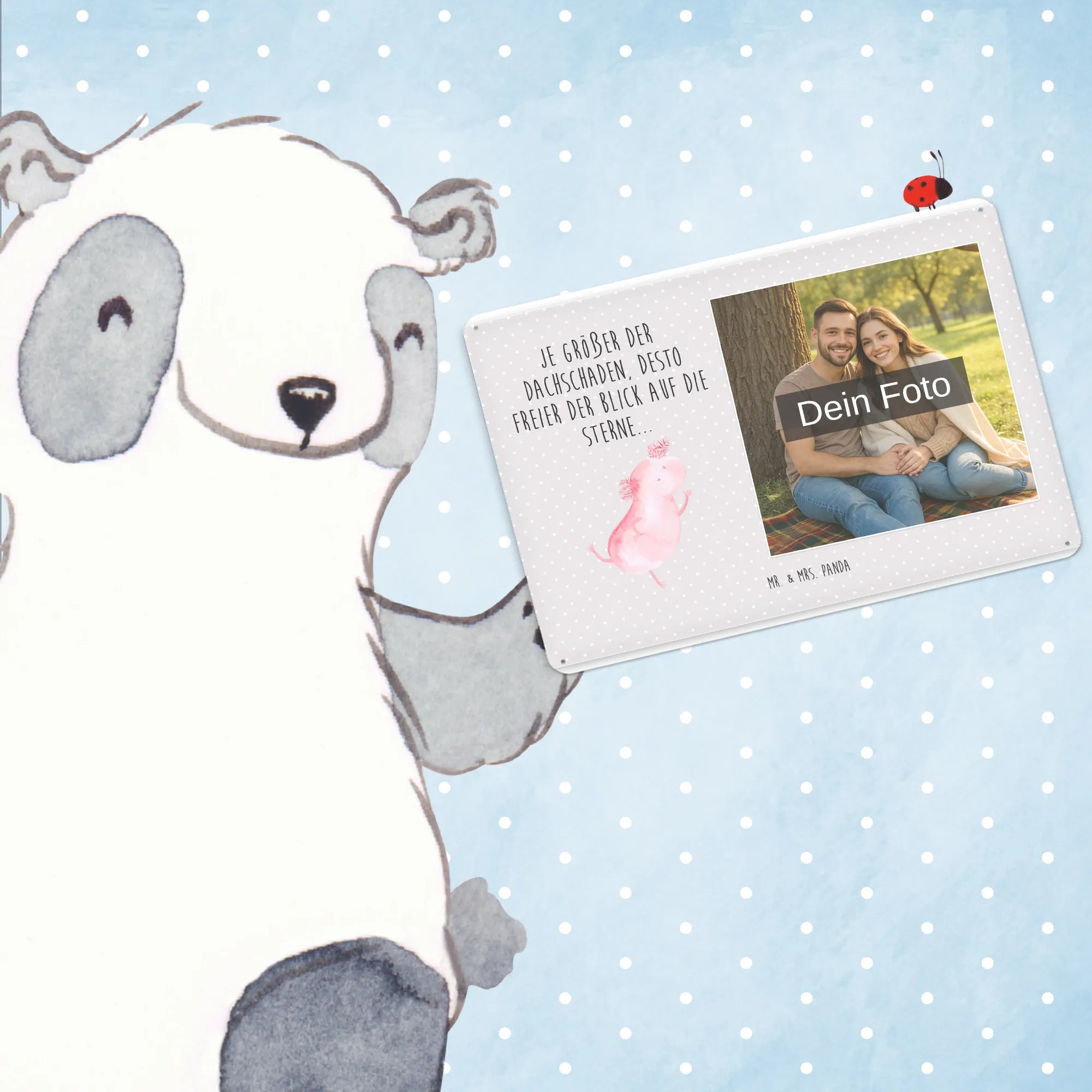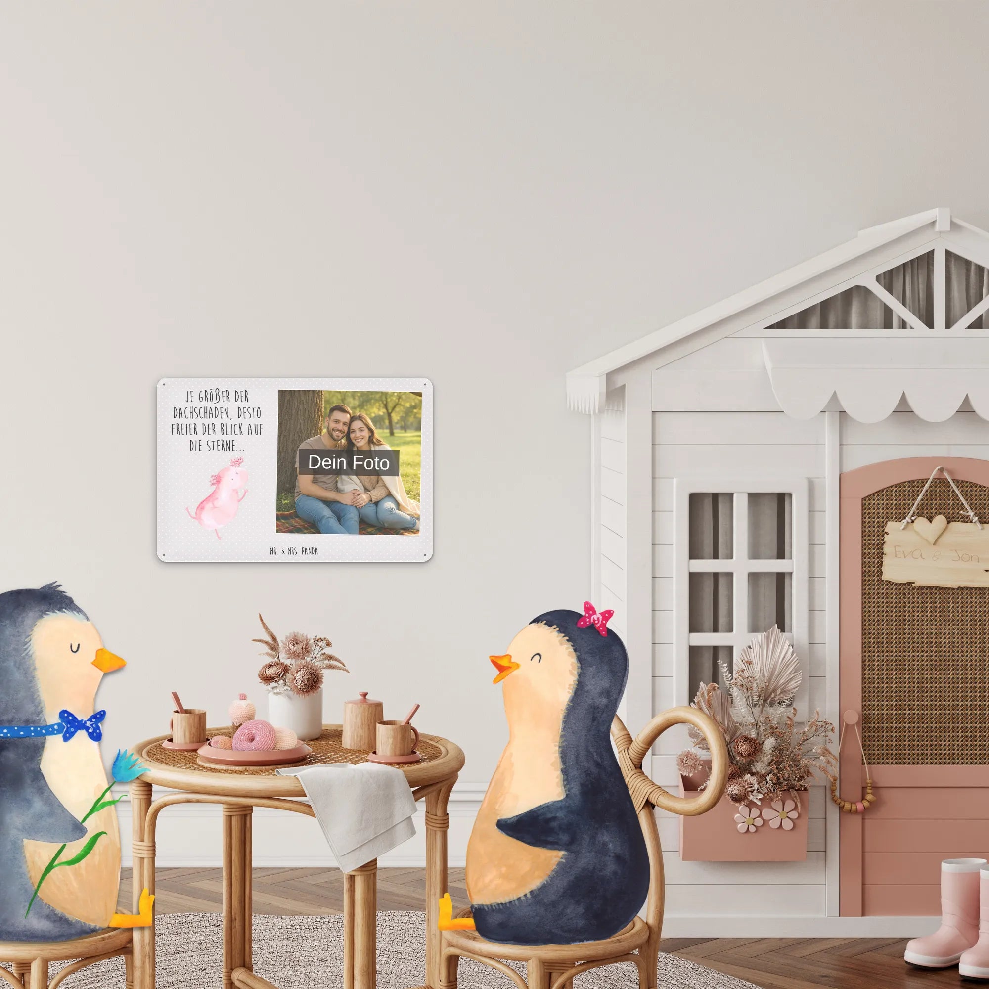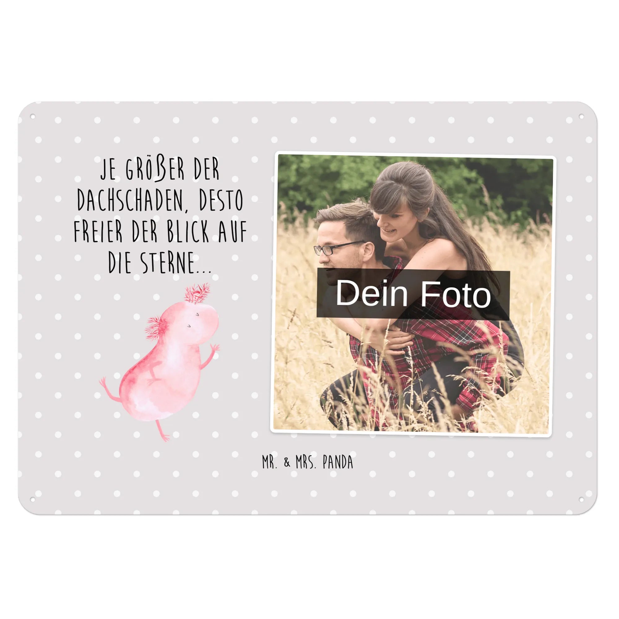 Gestalte dein persönliches Blechschild: Lade dein Foto hoch und kreiere ein einzigartiges Geschenk mit Mr. & Mrs. Panda – schnell gefertigt, liebevoll verpackt.