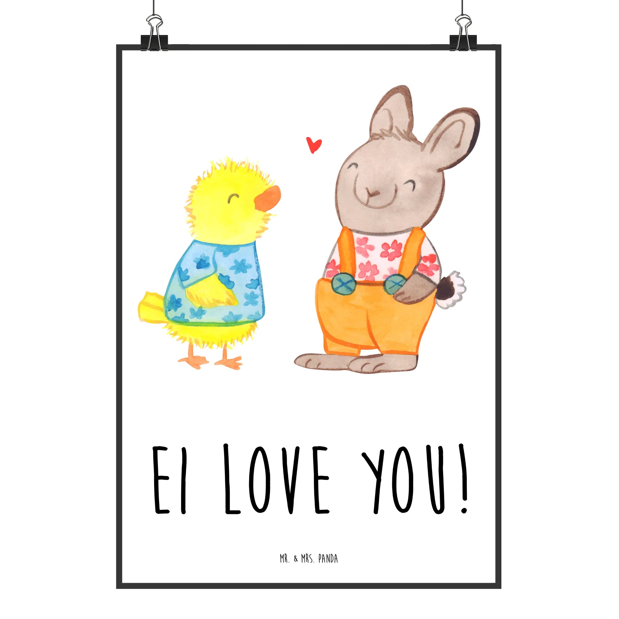 Ein Poster voller Herzenswärme: Das Mr. & Mrs. Panda Poster „Ostern Freundschaft“ mit dem liebevollen Spruch „Ei love you!“ bringt Osterstimmung und Freundschaft in Dein Zuhause. Auf dem handgezeichneten Aquarellmotiv sitzt ein fröhlicher Hase in Latzhose neben einem kleinen, neugierigen Küken – ein Bild voller Zärtlichkeit und Verbundenheit.