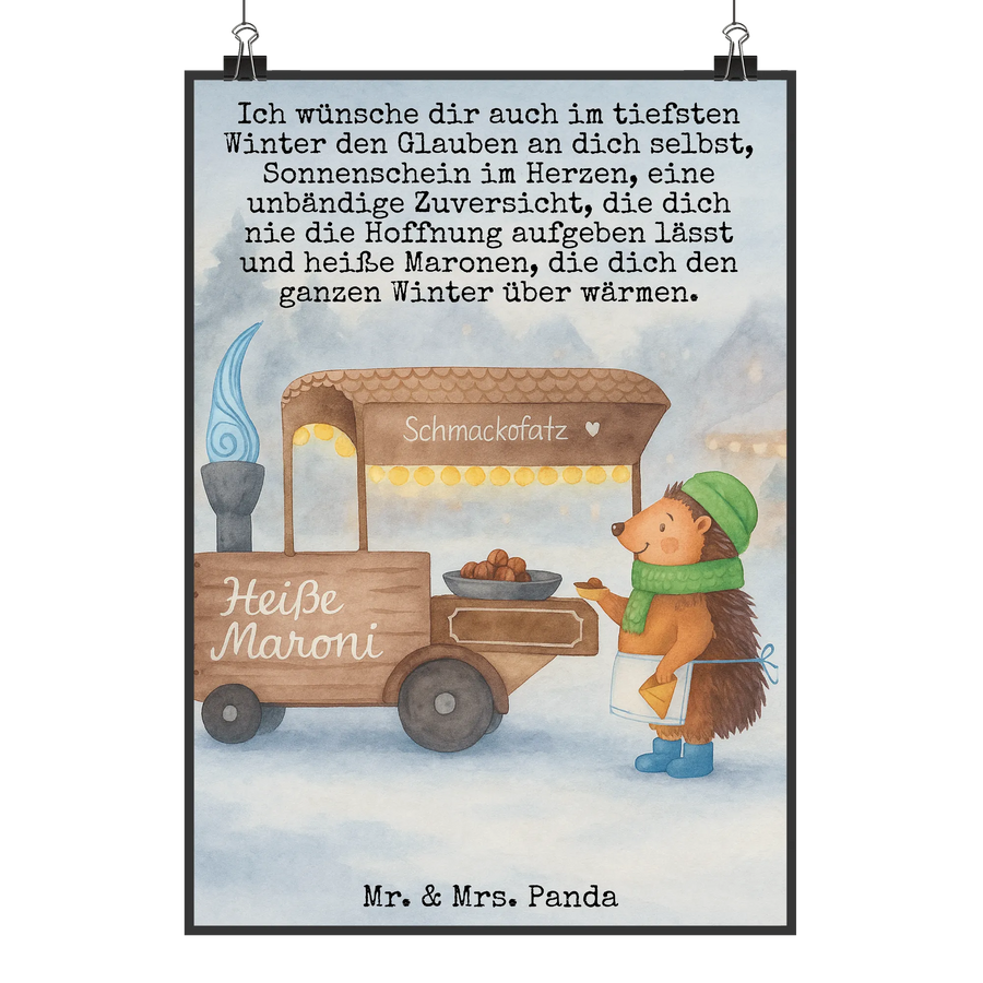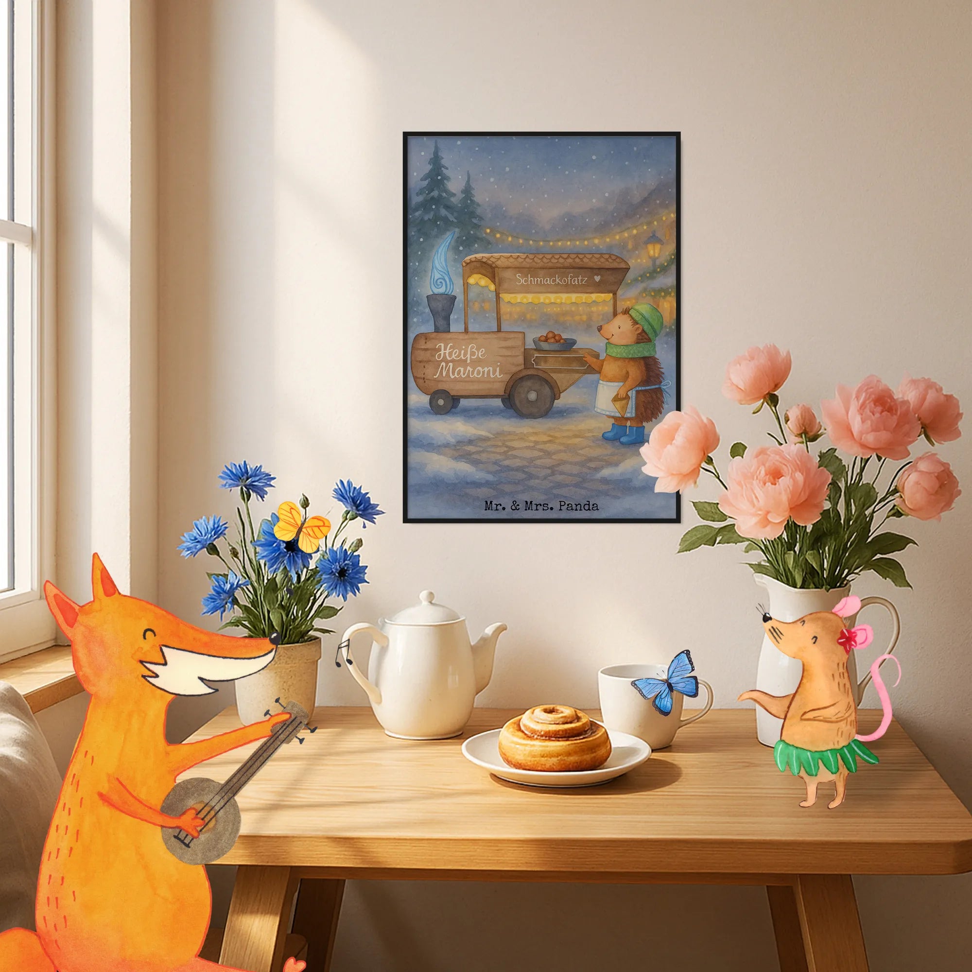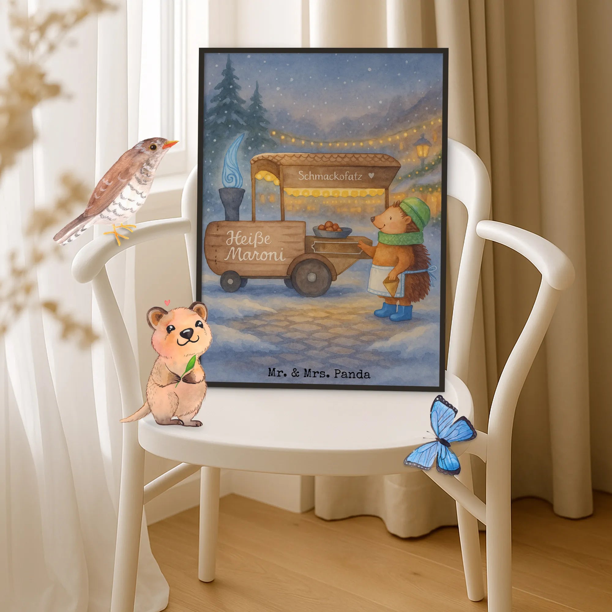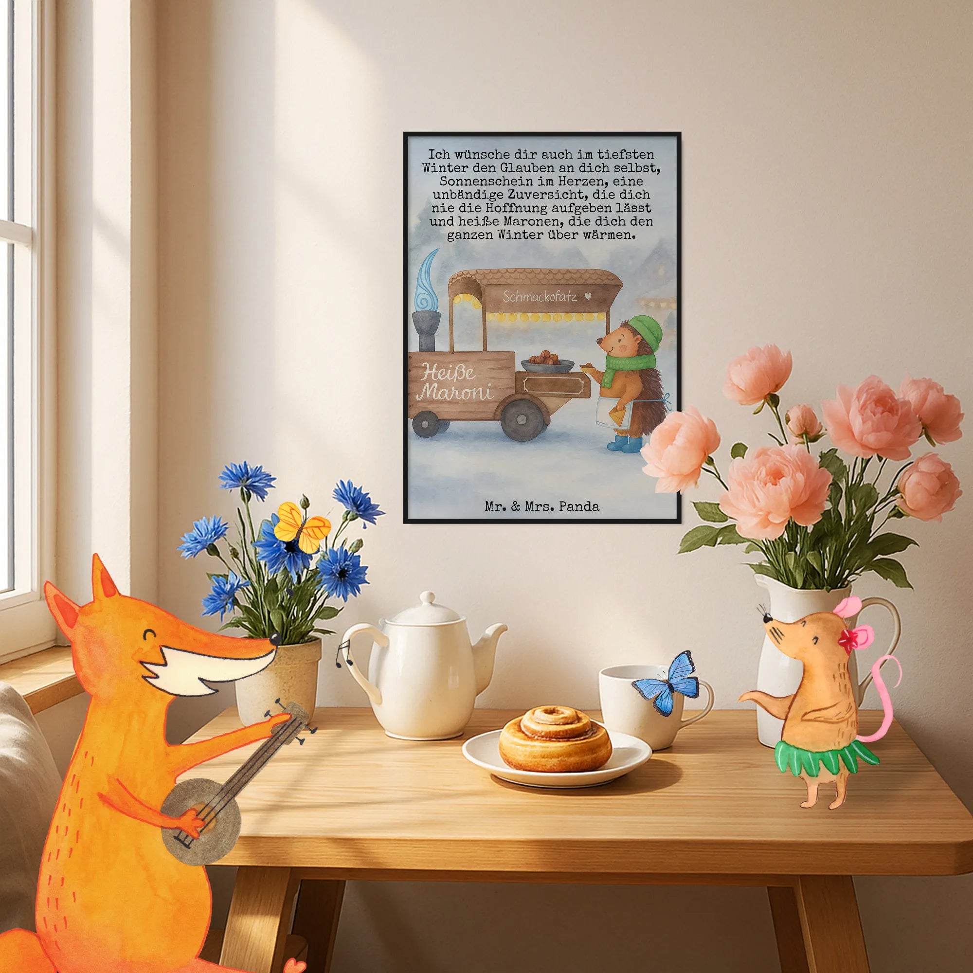 Unser niedlicher Igel steht an einem festlich geschmückten Stand auf dem Weihnachtsmarkt und verkauft heiße Maronen. Der Duft von frisch gerösteten Kastanien umhüllt den Winterabend und weckt Erinnerungen an gemütliche Zeit mit Freunden und Familie. Mit seinem kleinen Lächeln und der warmen Ausstrahlung bringt er Freude in diese kalte Jahreszeit. Seine Botschaft ist klar: selbst im tiefsten Winter sollen wir den Glauben an uns selbst bewahren. Der Igel erinnert uns daran, dass es die kleinen Dinge sind, die unser Herz erhellen – wie der Genuss von heißen Maronen, die uns wohlig wärmen und uns durch die kalten Tage begleiten. "Ich wünsche dir auch im tiefsten Winter den Glauben an dich selbst, Sonnenschein im Herzen, eine unbändige Zuversicht, die dich nie die Hoffnung aufgeben lässt und heiße Maronen, die dich den ganzen Winter über wärmen."