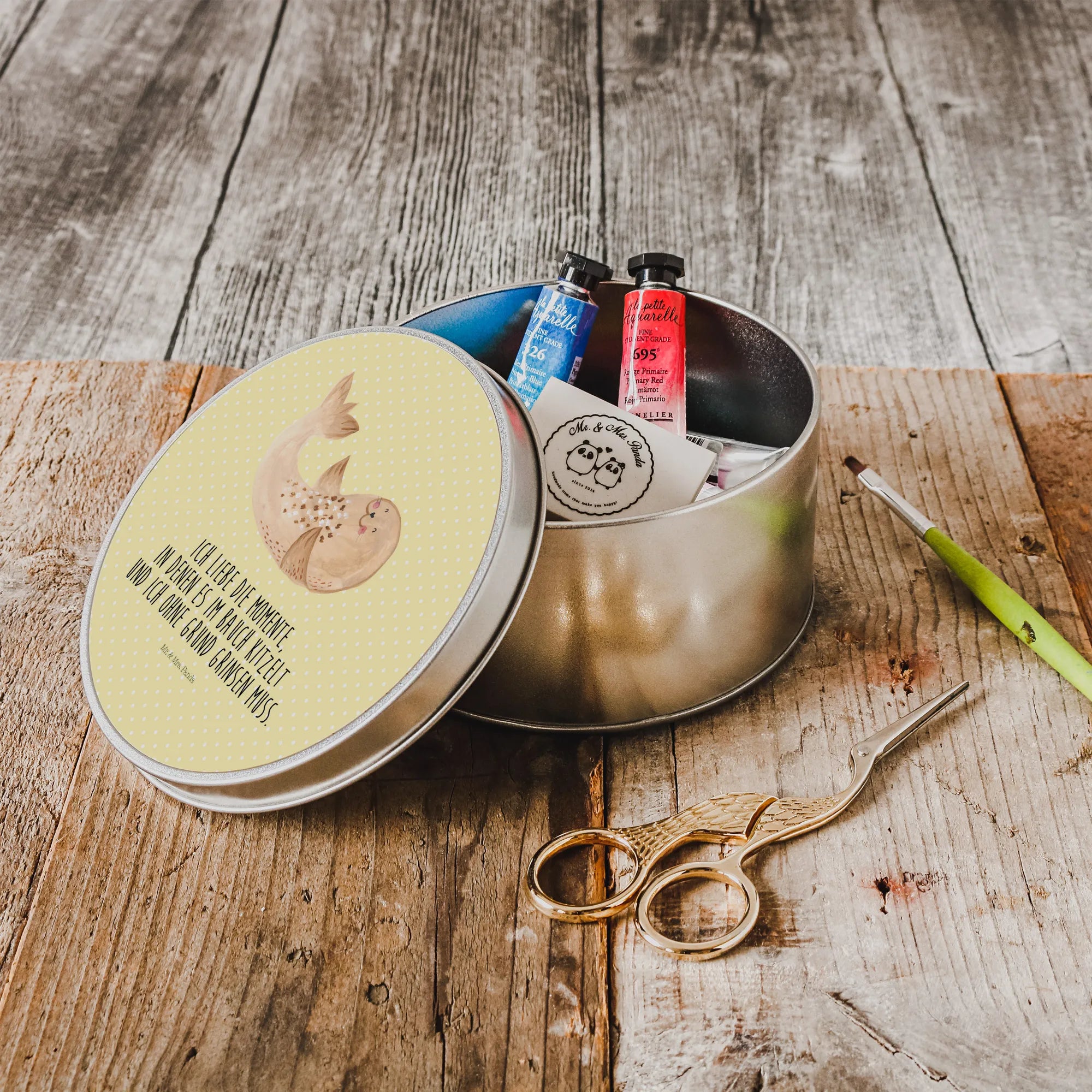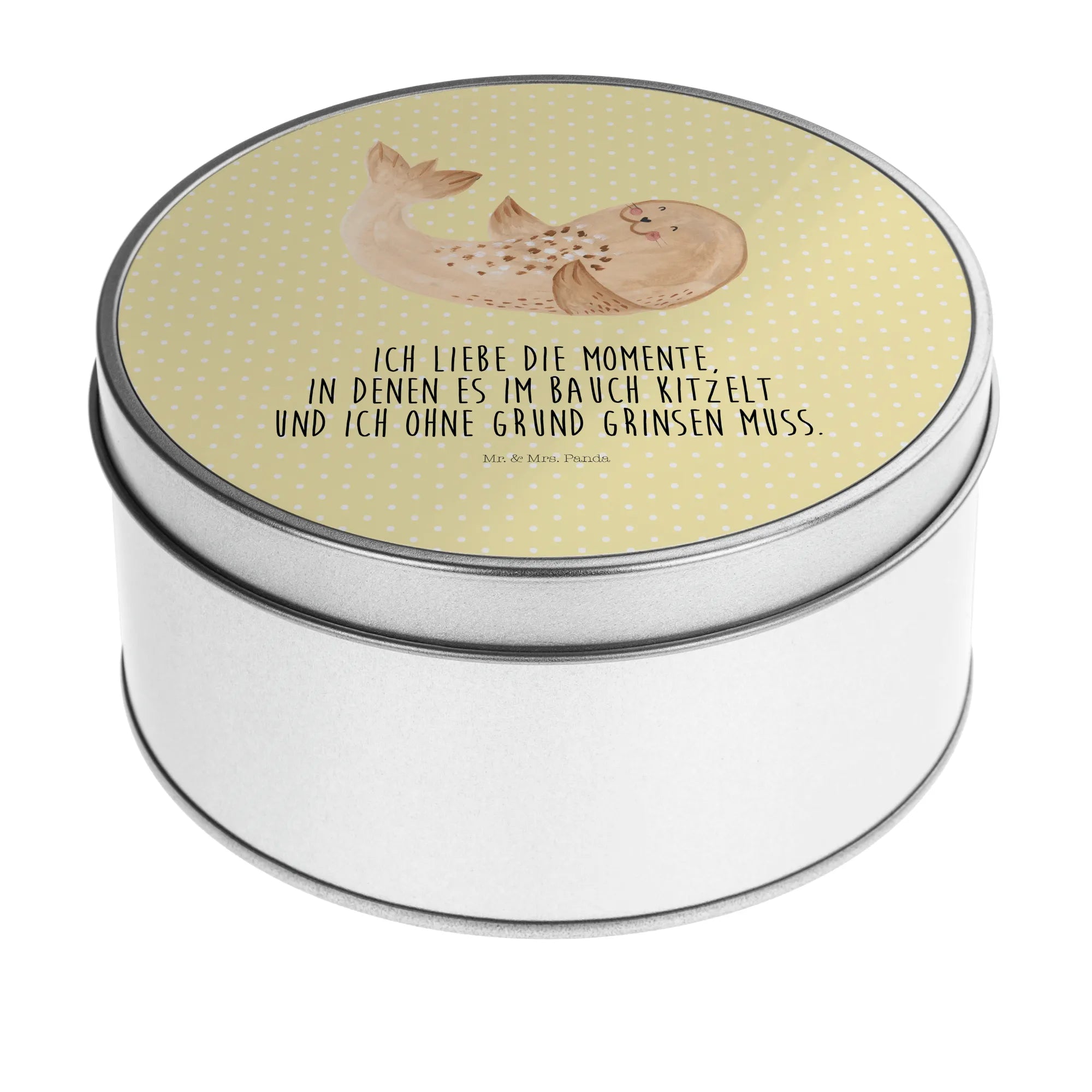 Looking for the perfect gift that brings smiles and warmth? Meet our charming Round Tin featuring a serene Seal lying down from the delightful Small World collection by Mr. & Mrs. Panda!