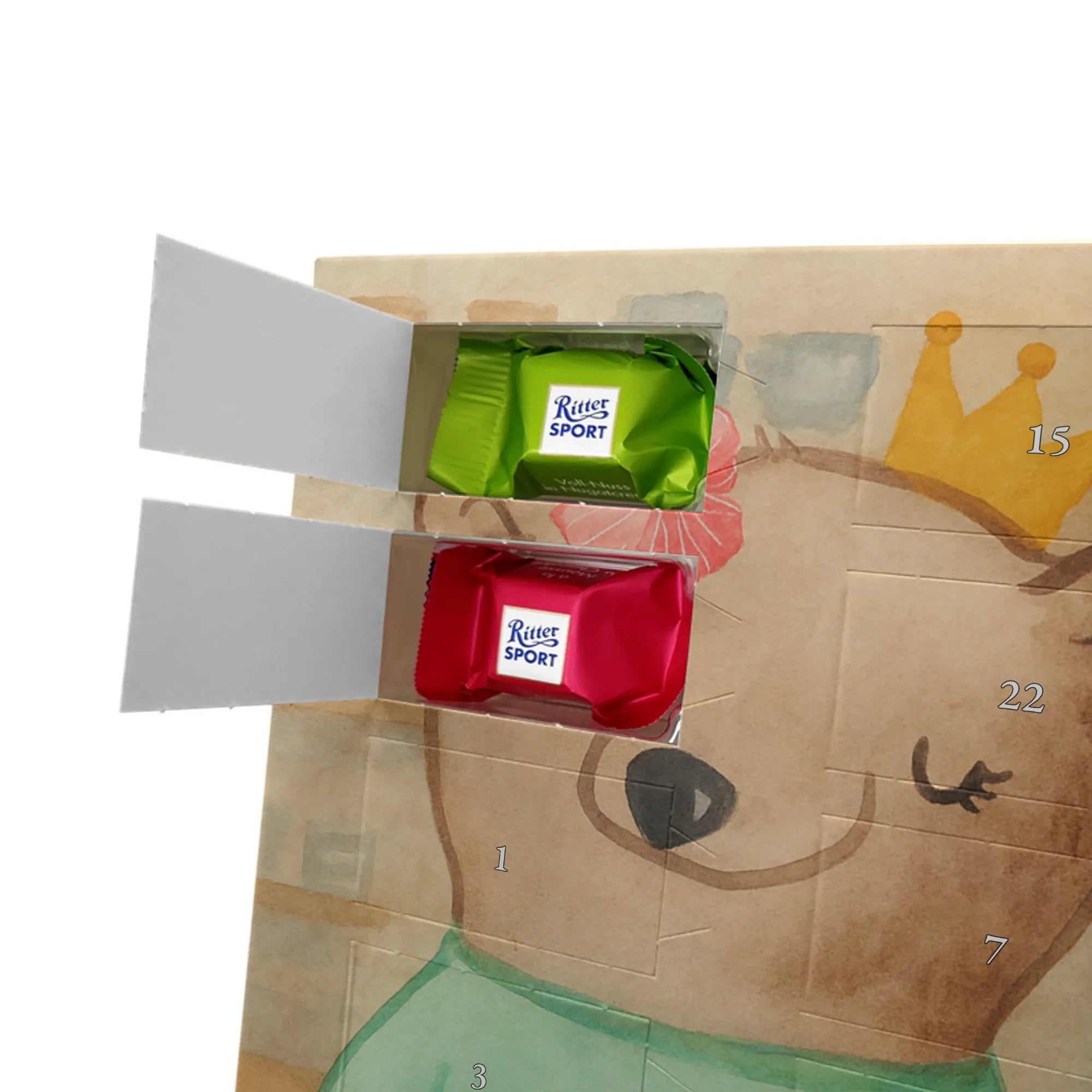 Adventskalender mit Schokolade – so schmeckt Vorfreude! Unser Mr. & Mrs. Panda Adventskalender ist liebevoll gestaltet und bedruckt mit wunderschönen Motiven & Sprüchen, die jeden Tag versüßen. Die brillante Druckqualität mit seidenmatter Oberflächenveredelung sorgt für ein edles Finish, und auch die Seitenflächen sind hübsch bedruckt. Der Kalender ist nicht personalisierbar, dafür aber vielseitig einsetzbar: Maße: 325 mm x 225 mm x 27 mm und die besondere Eigenschaft, dass du ihn aufgehängt oder aufgestellt verwenden kannst, geben dir Flexibilität bei der Dekoration. Gefüllt ist der Kalender mit Ritter Sport Schokowürfeln in beliebten Geschmacksrichtungen wie Mousse au Chocolat, Schoko Crisp, Voll-Nuss in Nougatcreme, Karamell Duo, Joghurt und Erdbeer-Joghurt. Wichtig: Es handelt sich um einen Kalender gefüllt mit Ritter Sport Schokolade, nicht um einen Kalender der Marke Ritter Sport. Ideal als Geschenk oder als Adventsdeko für dein Zuhause – kleine Schokofreuden warten hinter jedem Türchen.