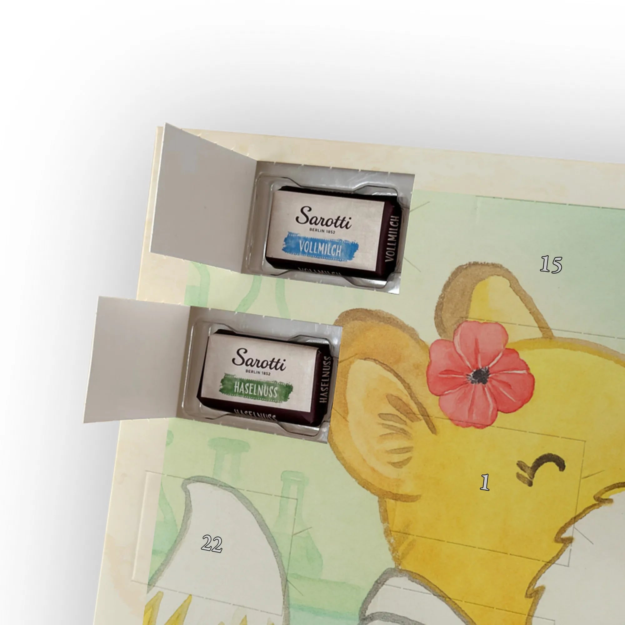 🐼 ADVENTSKALENDER MIT SCHOKOLADE: Liebevolle Illustrationen, seidenmatter Druck, 325×225×27 mm.
