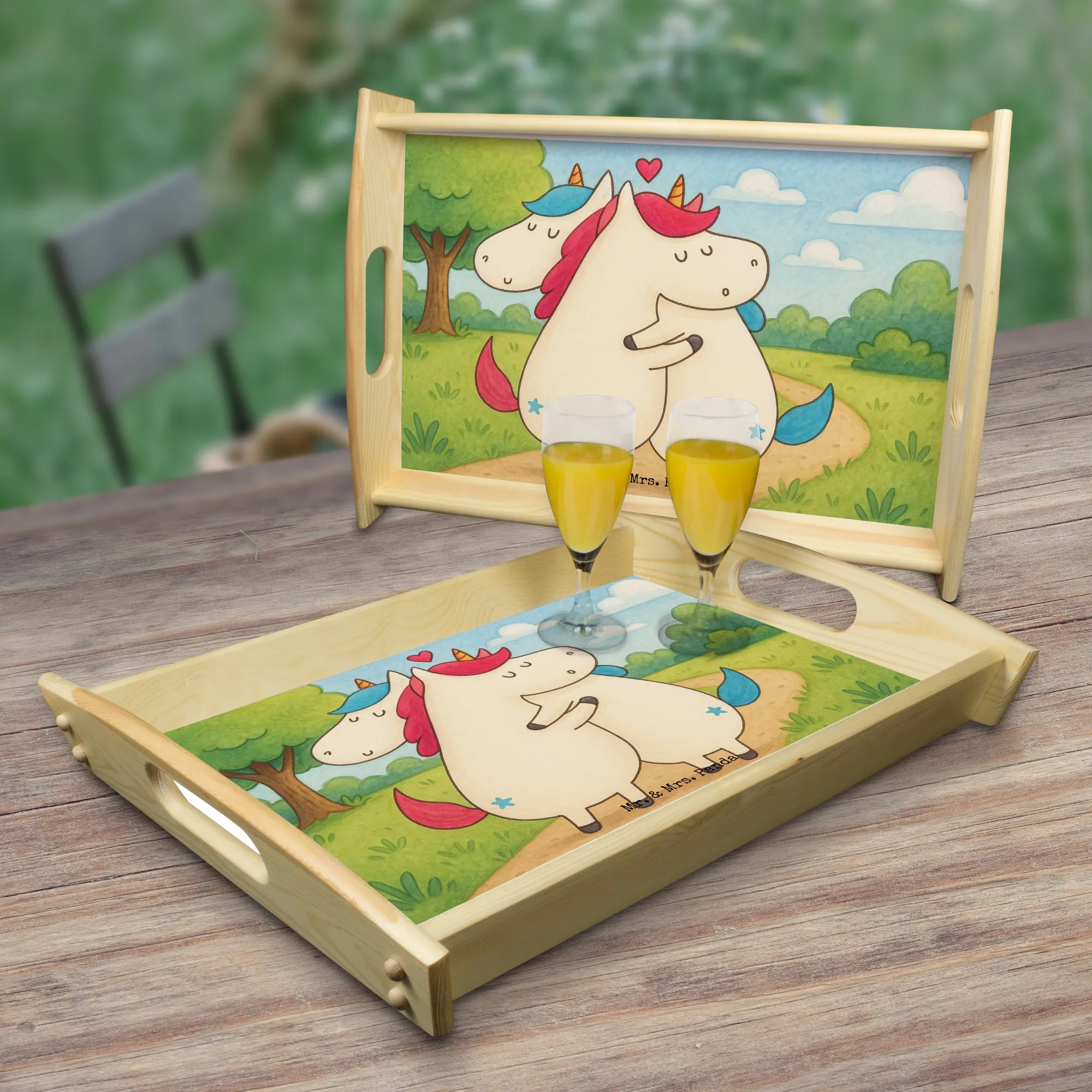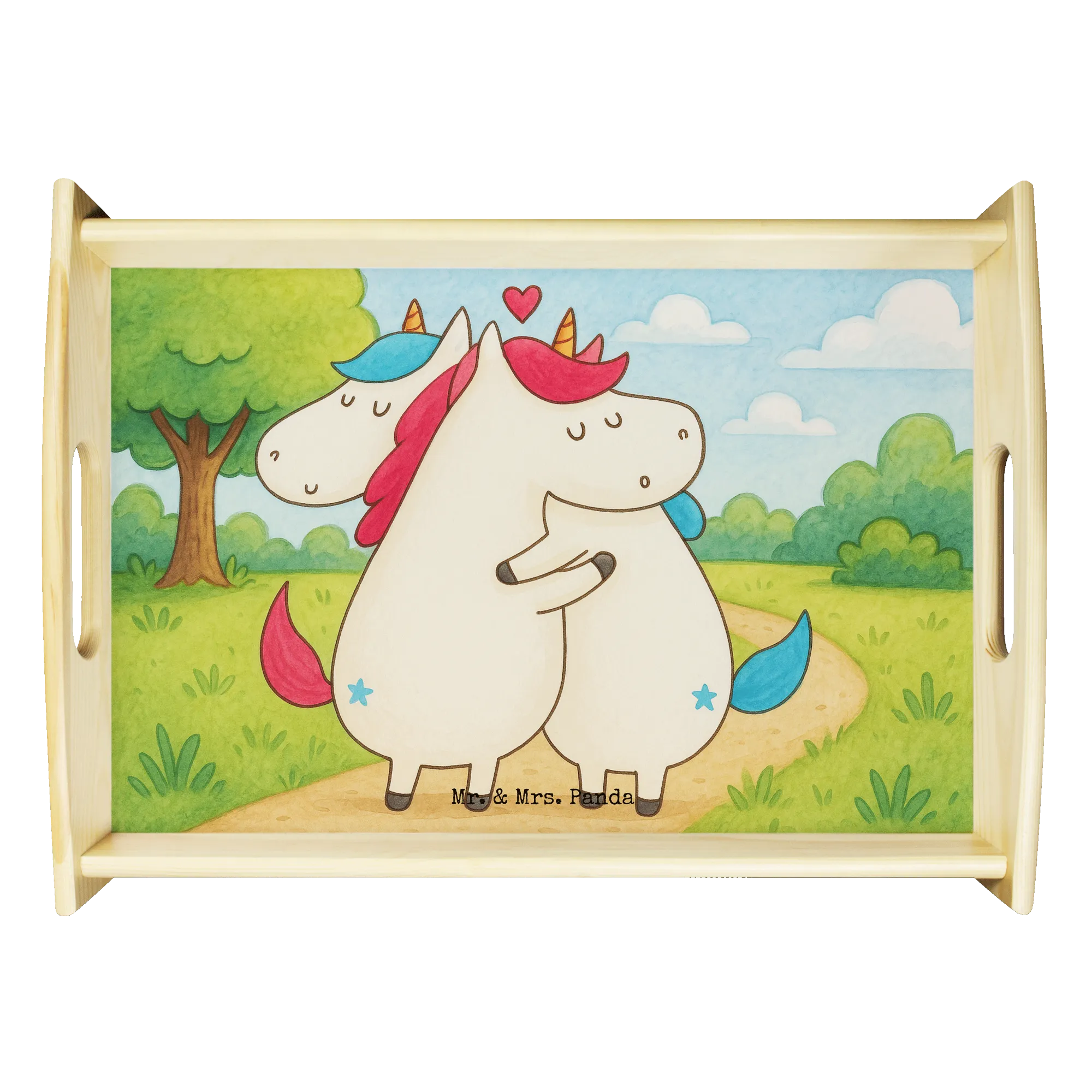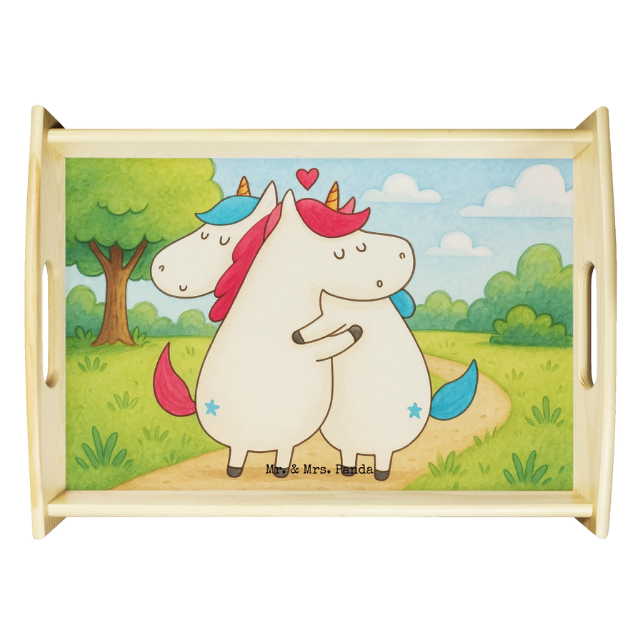 Verwöhne Deine Liebsten mit unserem bezaubernden Serviertablett von Mr. & Mrs. Panda! Mit den Maßen von 480 mm x 480 mm x 65 mm und einem gewicht von 925 g ist es nicht nur hübsch, sondern auch praktisch. Aus lasiertem Echtholz gefertigt, begeistert es mit einem lebendigen Druck, der gute Stimmung verbreitet. Egal ob beim Frühstück im Bett oder beim gemütlichen Abendessen auf dem Sofa – die seitlichen Griffmulden ermöglichen ein einfaches Tragen. Die Anti-Rutsch Pads auf der Unterseite sorgen dafür, dass alles sicher an seinem Platz bleibt. Dank der kratzfesten Oberfläche bleibt dein Tablett nach jeder Benutzung in bestem Zustand – einfach mit einem feuchten Tuch und Spülmittel abwischen, aber nicht einweichen! Beachte bitte die längere Anfertigungszeit aufgrund der besonderen Verarbeitung.