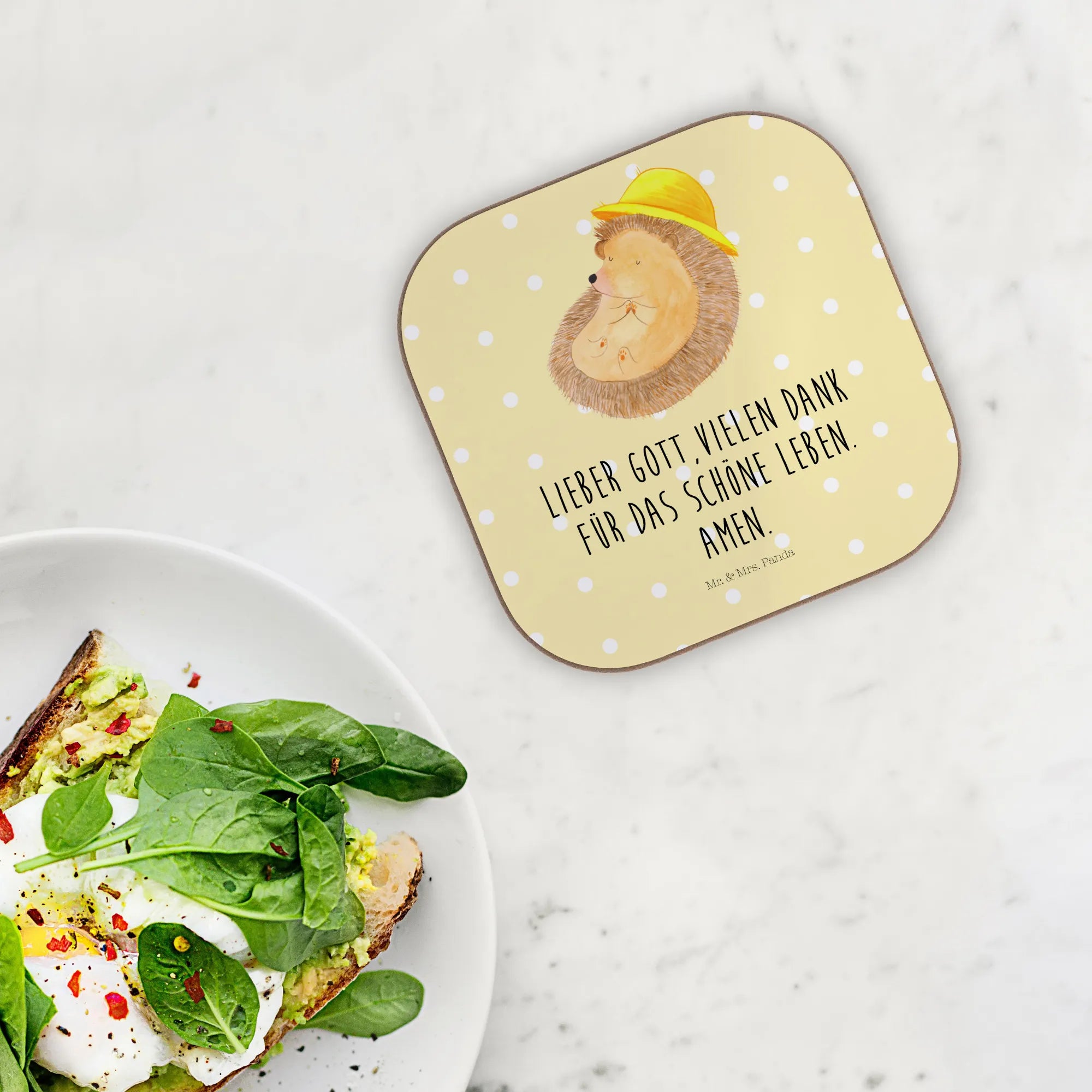 Verliebe dich in den Untersetzer „Igel betet“ aus der Small World Kollektion von Mr. & Mrs. Panda. Das liebevoll gezeichnete Motiv zeigt einen süßen Igel, der die Hände faltet, begleitet vom warmen Spruch: „Lieber Gott, vielen Dank für das schöne Leben. Amen.“ Ein kleines Kunstwerk für deinen Tisch, das Ruhe, Dankbarkeit und Freude ausstrahlt.