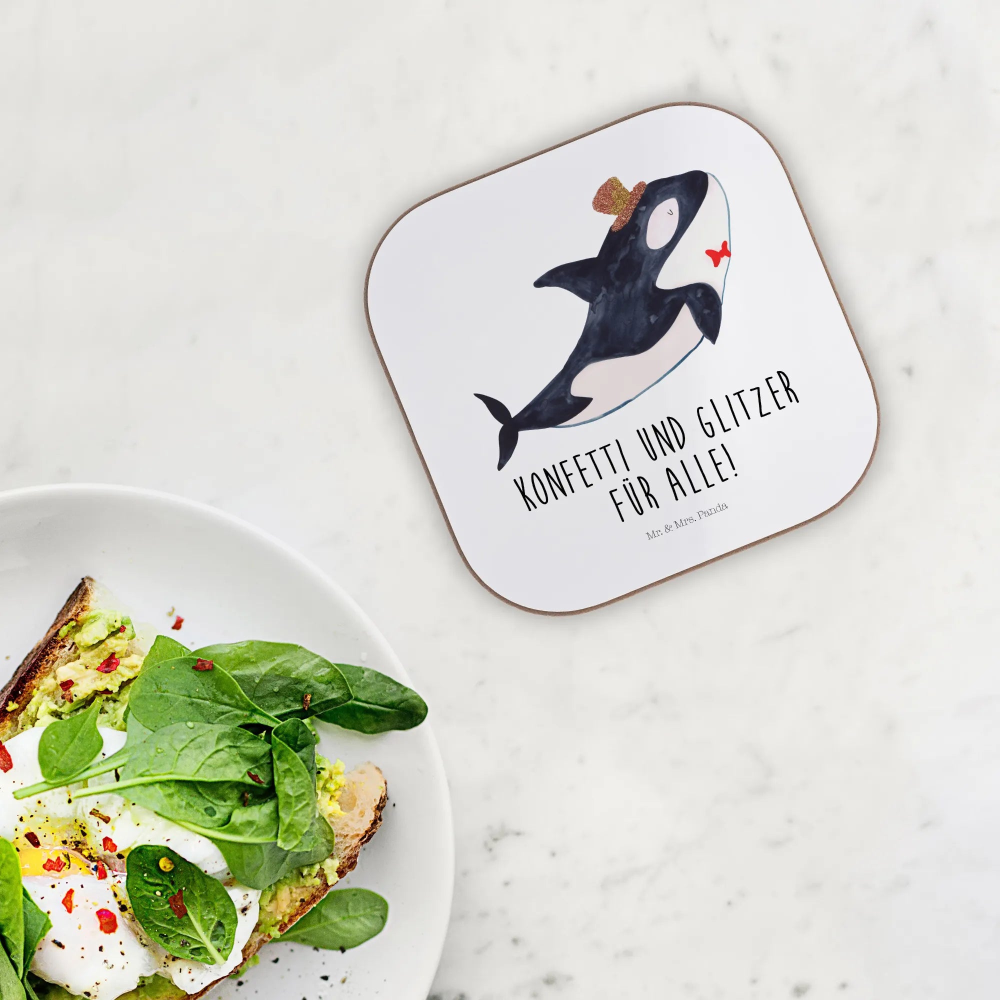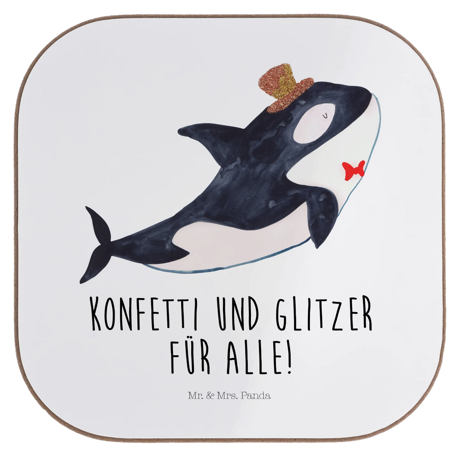 Our orca is here to bring a touch of playful elegance to your celebrations. With its glossy black and white design, accented by a vibrant cylinder hat embellished with flowers, this motif radiates charm and joy. Don't forget the adorable little red fish adding an extra hint of fun! 'Konfetti und Glitzer für alle!' perfectly captures the spirit of joy and celebration, making it ideal for birthdays or festive gatherings. It's all about letting loose, enjoying those confetti moments, and igniting a spirit of togetherness.