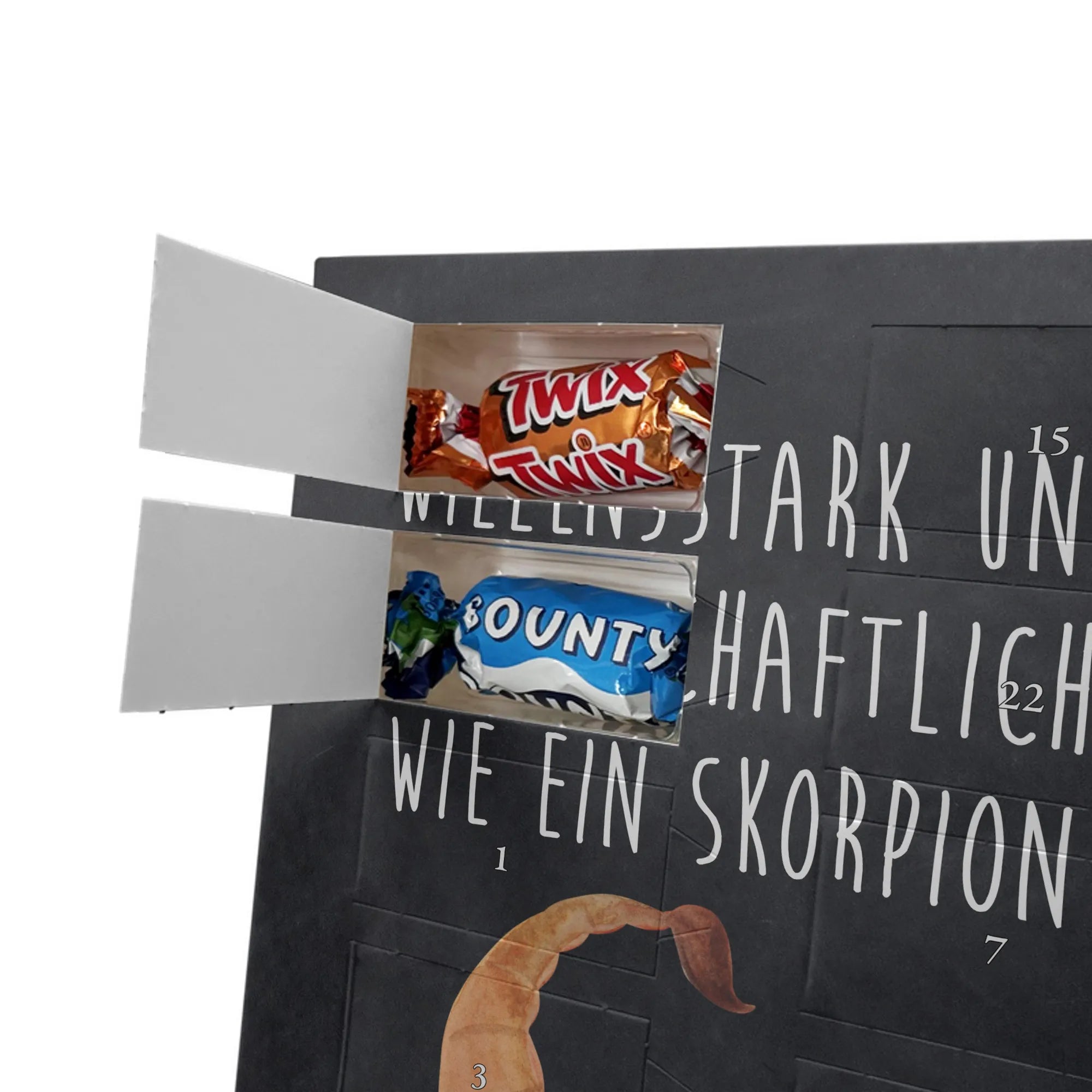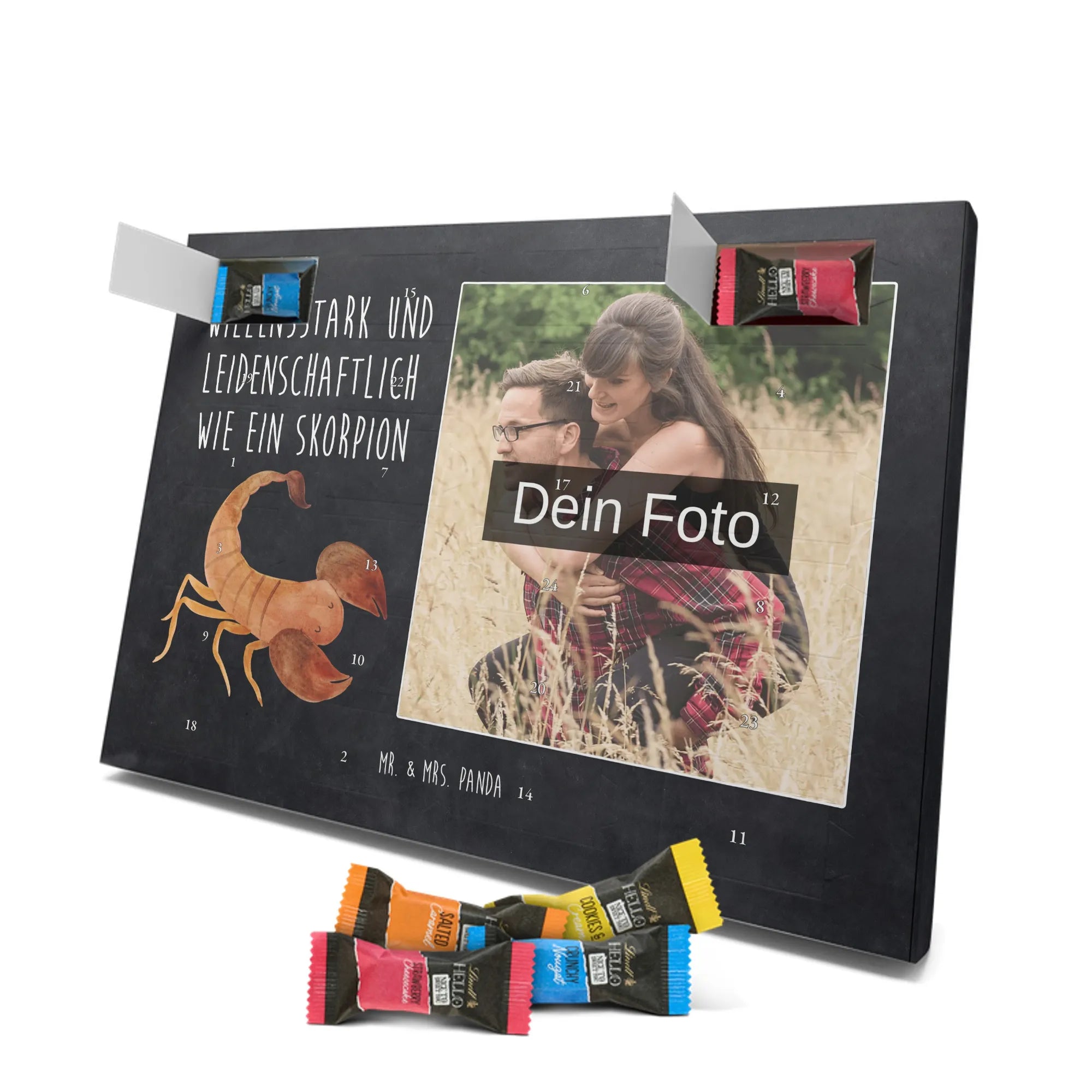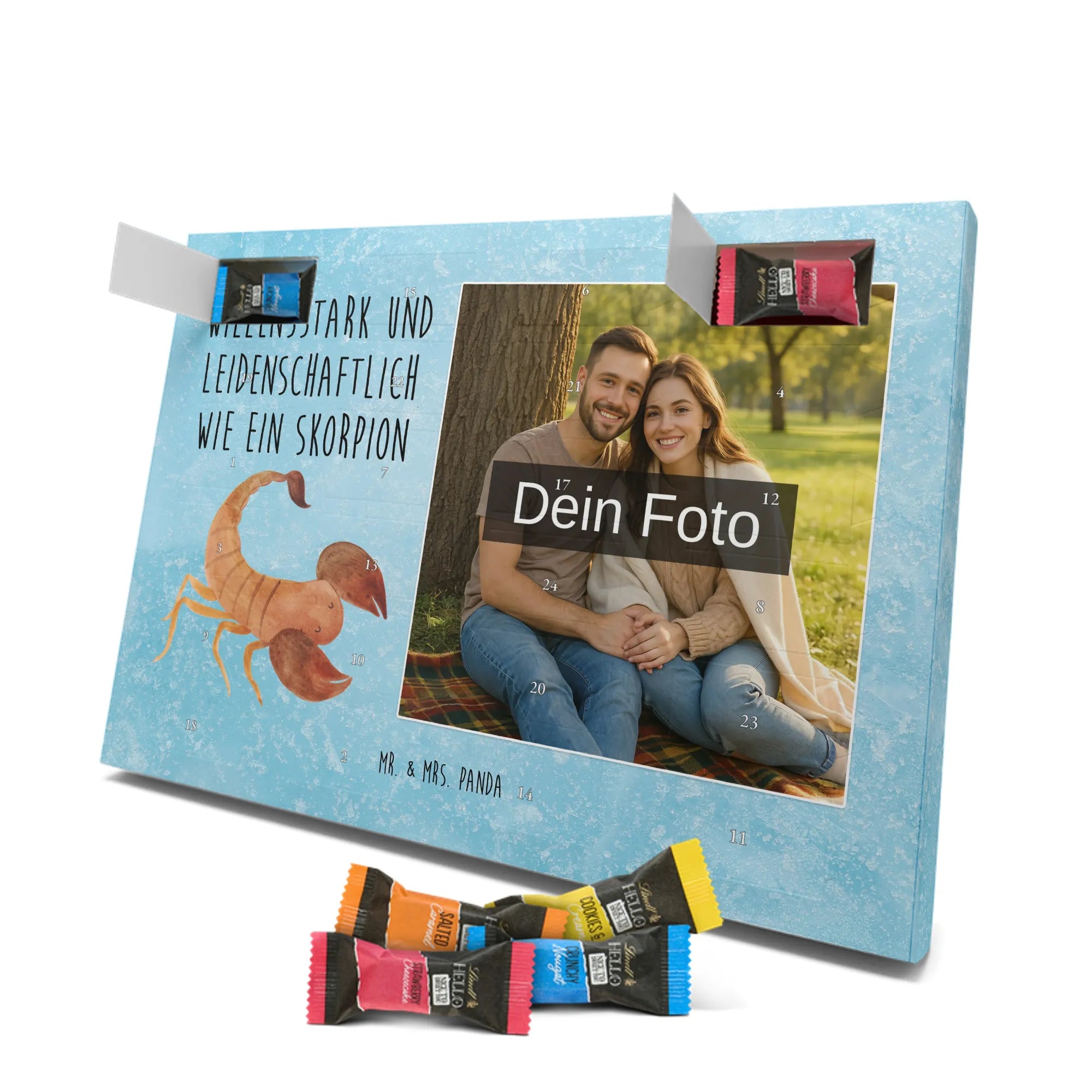 Schoko Foto Adventskalender personalisiert – ein fröhlicher Hingucker von Mr. & Mrs. Panda, der Adventszeit und Erinnerungen verbindet. Der Kalender ist bedruckt mit zauberhaften Motiven & Sprüchen von Mr. & Mrs. Panda und lässt sich ganz leicht mit einem Foto deiner Wahl personalisieren. Achtung Bildqualität: Für ein scharfes Druckbild solltest du ein Foto in hoher Auflösung verwenden. Kontrolliere den Bildausschnitt, damit wichtige Gesichter oder Details nicht verloren gehen. Verwende nur Fotos, für die du die Rechte besitzt oder die frei nutzbar sind. Bitte beachte: Die Fotos werden weder nachbearbeitet noch zugeschnitten und personalisierte Foto Artikel sind vom Umtausch ausgeschlossen. Die Verarbeitung überzeugt mit seidenmatter Oberflächenveredelung und bedruckten Seitenflächen für ein edles Finish. Maße: 325 mm x 225 mm x 27 mm. Besonderheit: Du kannst den Kalender aufhängen oder aufstellen – ganz flexibel. Gefüllt ist der Kalender mit Ritter Sport Schokowürfeln in leckeren Geschmacksrichtungen wie Mousse au Chocolat, Schoko Crisp, Voll-Nuss in Nougatcreme, Karamell Duo, Joghurt und Erdbeer-Joghurt. Ein liebevolles Geschenk, das jeden Tag im Advent versüßt.