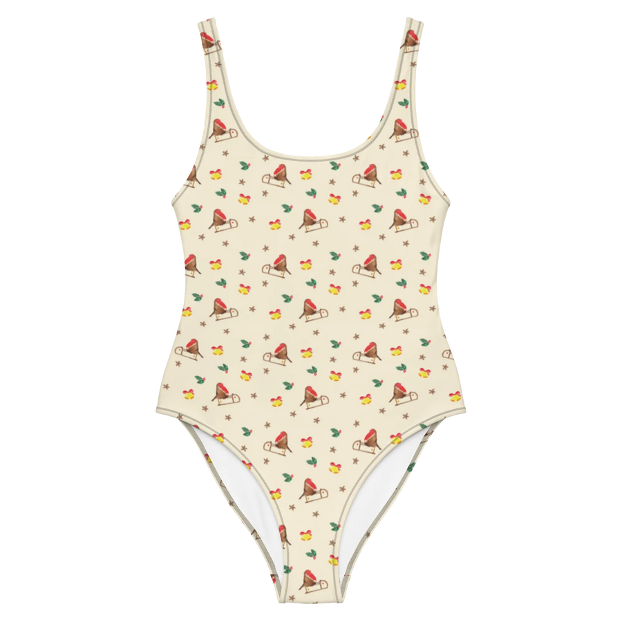 This luxurious swimsuit, complete with a hand-drawn motif of a charming robin riding a wooden sleigh, is not just a piece of swimwear; it's a statement of joy and celebration during the wonderful winter and Christmas season. Made from a high-quality blend of polyester and elastane, this swimsuit is soft, stretchy, and perfect for all your holiday adventures, whether it's lounging by the pool or splashing around at a winter resort.