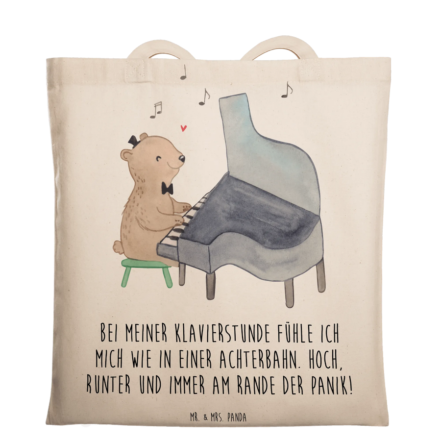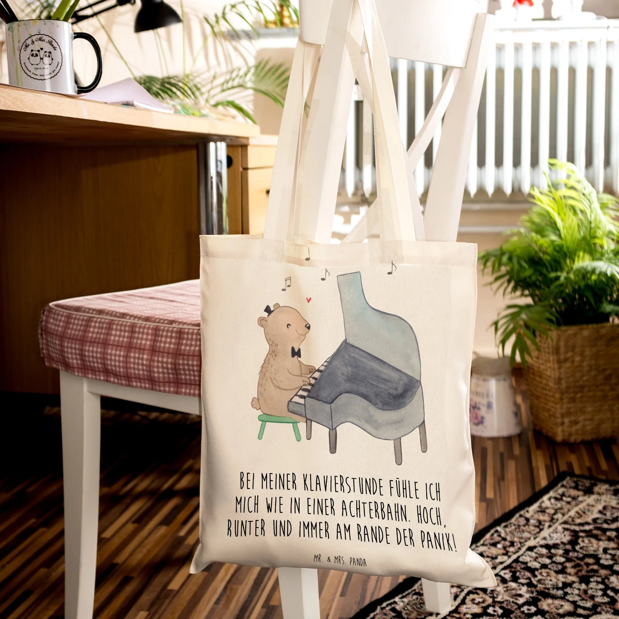 Mit einem liebevollen Slogan wie "Bei meiner Klavierstunde fühle ich mich wie in einer Achterbahn. Hoch, runter und immer am Rande der Panik!", wird jeder Musikliebhaber daran erinnert, wie aufregend, grenzenlos und manchmal auch herausfordernd das Musizieren sein kann. Ob als Geschenk für einen Schüler, der gerade das Klavier spielen lernt, oder als Dankeschön für den Musikpädagogen – diese Tasche wird garantiert ein Lächeln ins Gesicht zaubern.